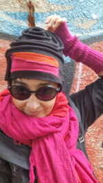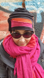 Uszyta z miękkiej, grubej, czarnej drapanej bawełny, z madżentą i pomarańczem…jedna i niepowtarzalna, z unikatową aplikacją z przodu, albo z boku, jeśli wolisz… nasycone kolory, kropka, przeszycia…