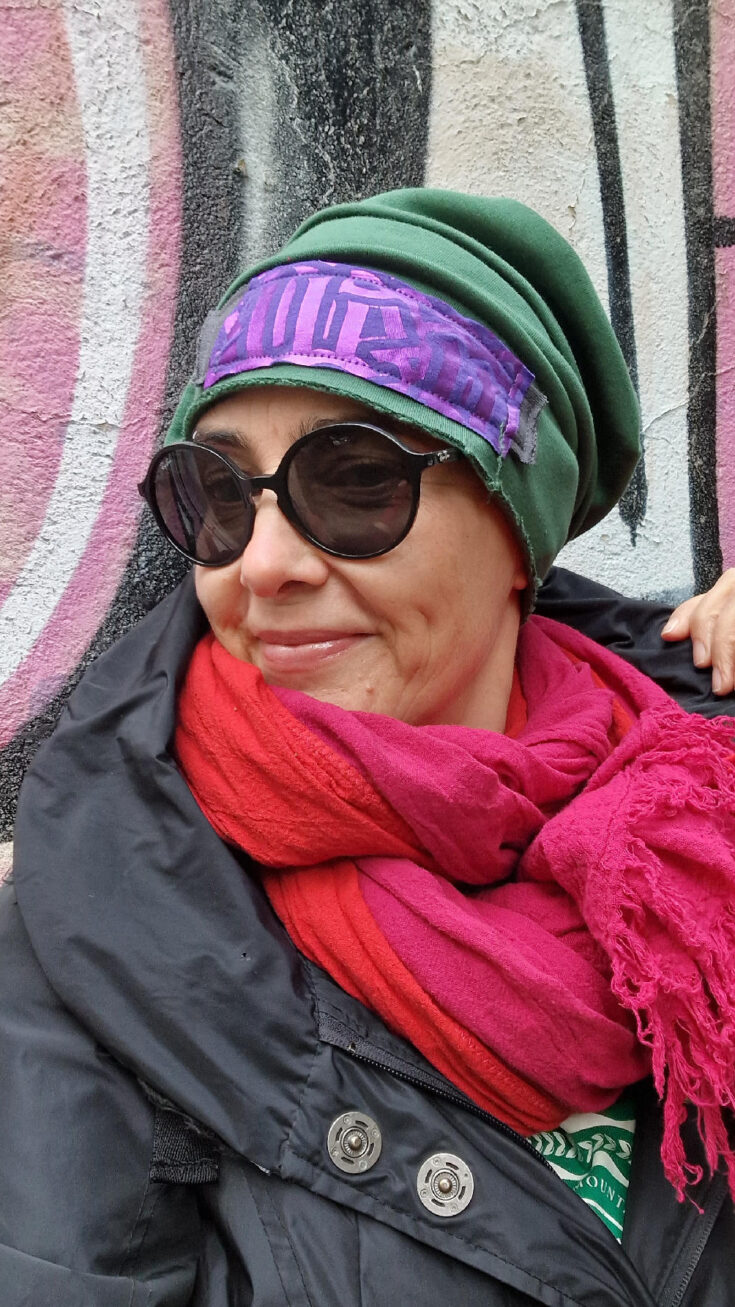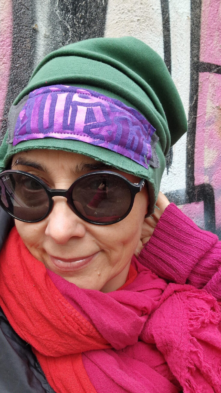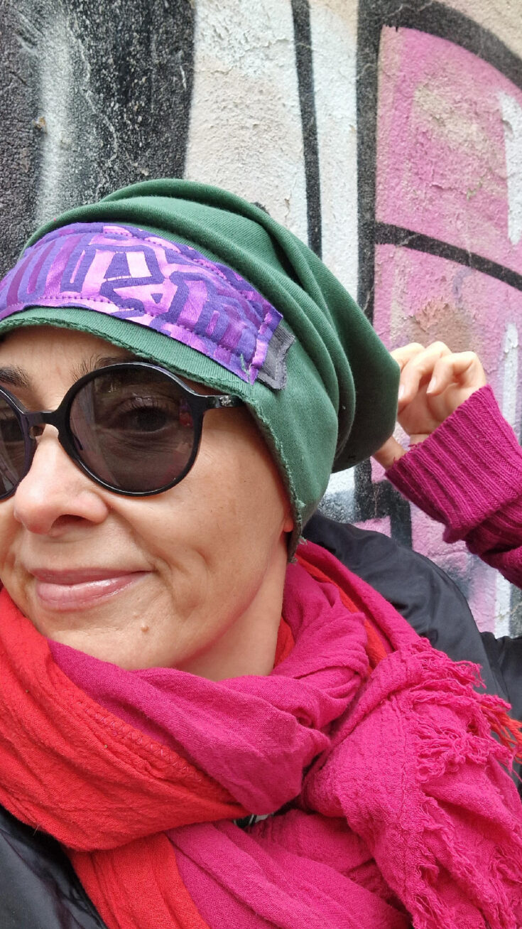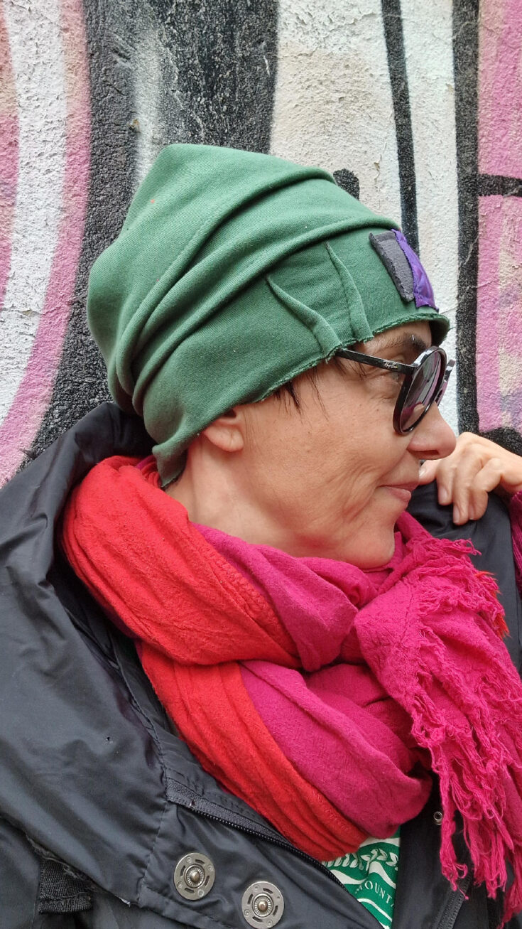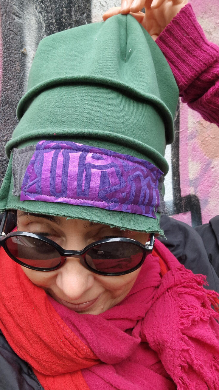 Uszyta z miękkiej, grubej, zielonej, drapanej bawełny, z dodatkiem mocnego fioletu…jedna i niepowtarzalna, z unikatową aplikacją z przodu, albo z boku, jeśli wolisz…