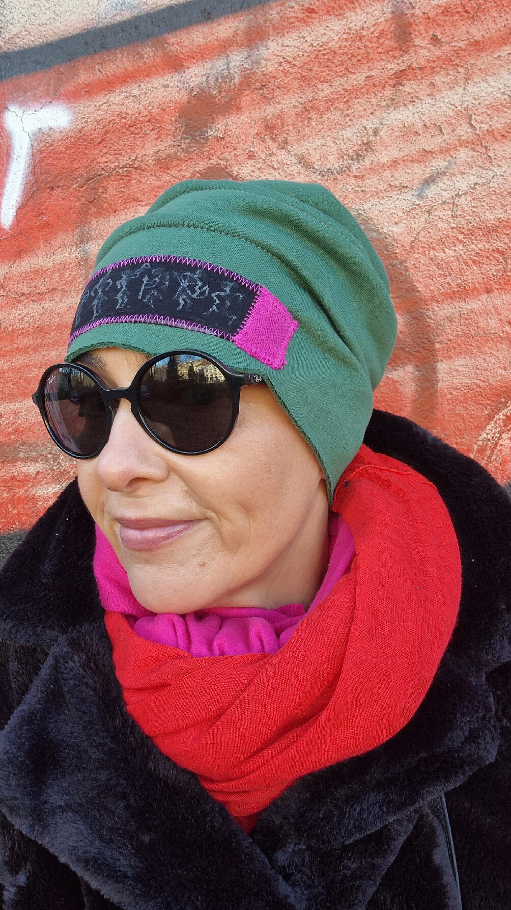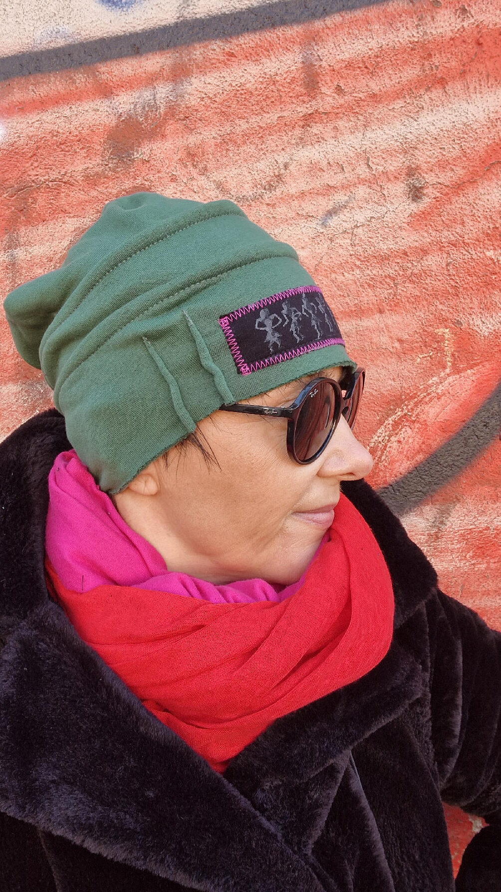 Uszyta z miękkiej, grubej, ciemnozielonej drapanej bawełny, z kolorowa aplikacją z przodu, w kontrastowych kolorach, z zaszewkami, które możesz rozpruć, gdyby była za ciasna