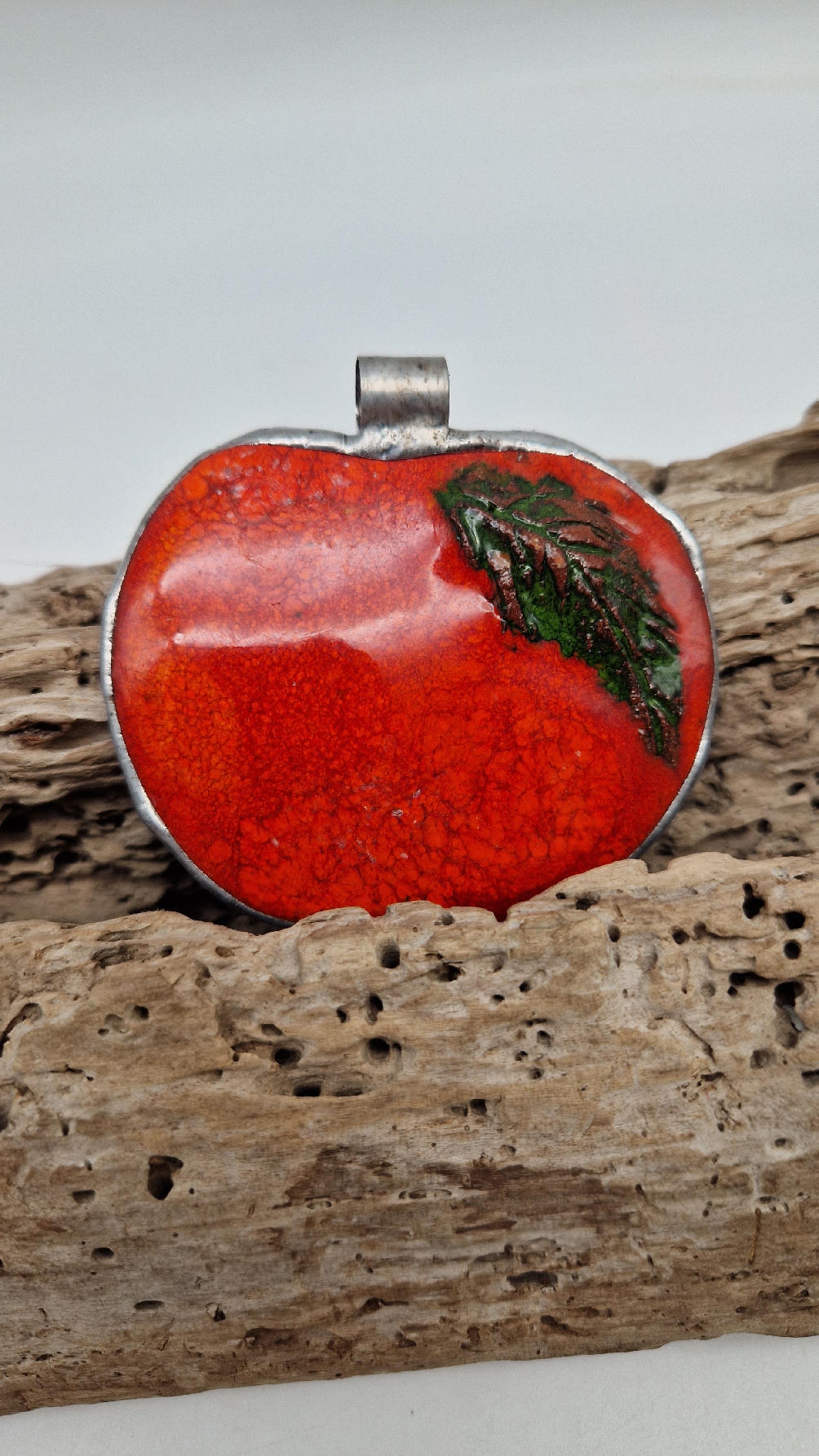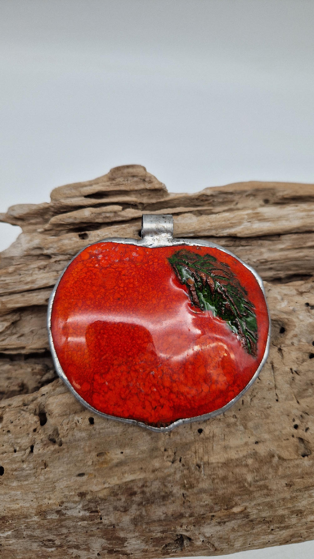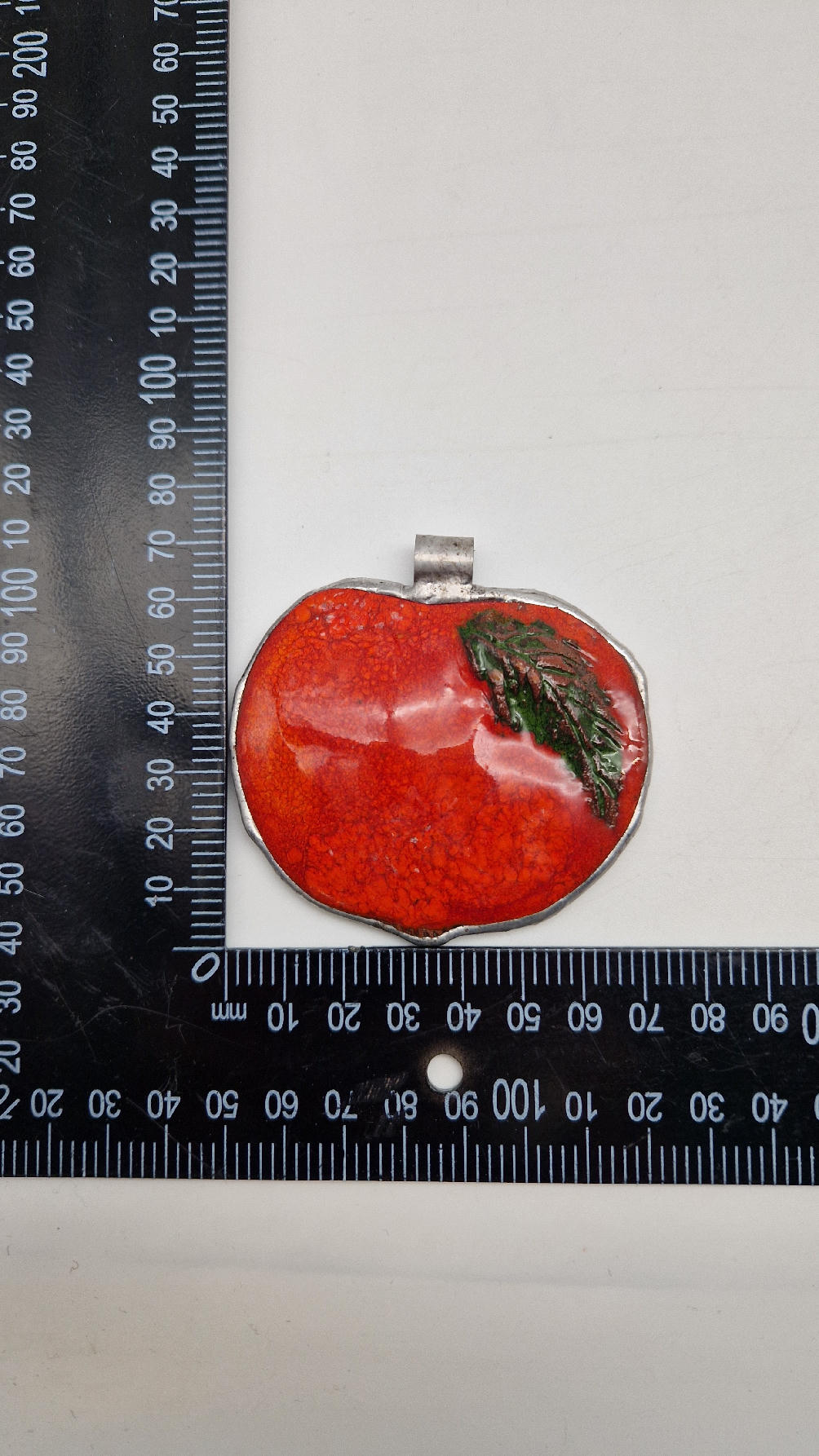 Cudny, ceramiczny nieduży wisior, ogniście soczyste, czerwone, śliczne jabłko, ceramika oprawiona w metal, cudna płaskorzeźba, która będzie piękną dekoracją Twojego dekoltu.