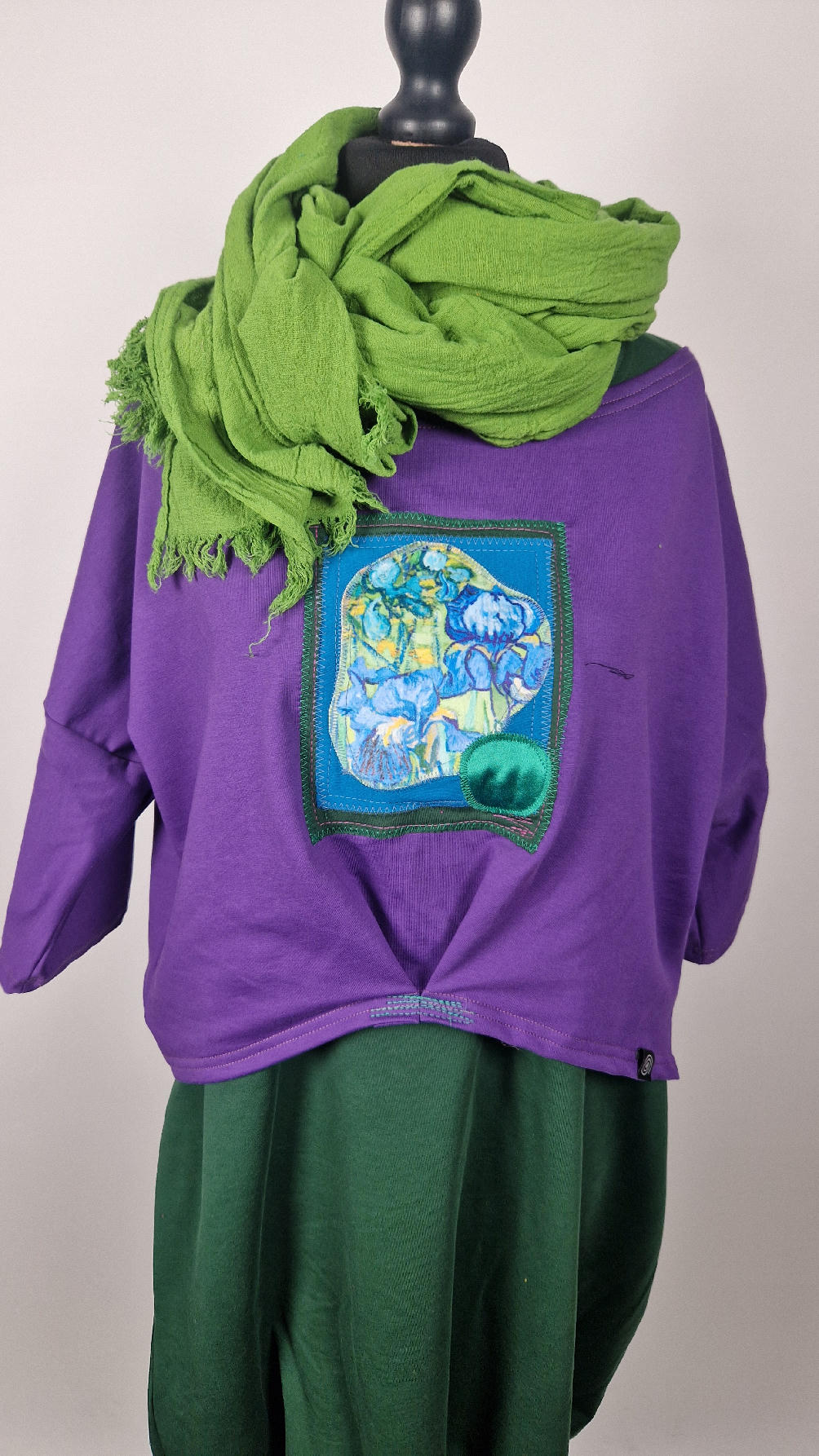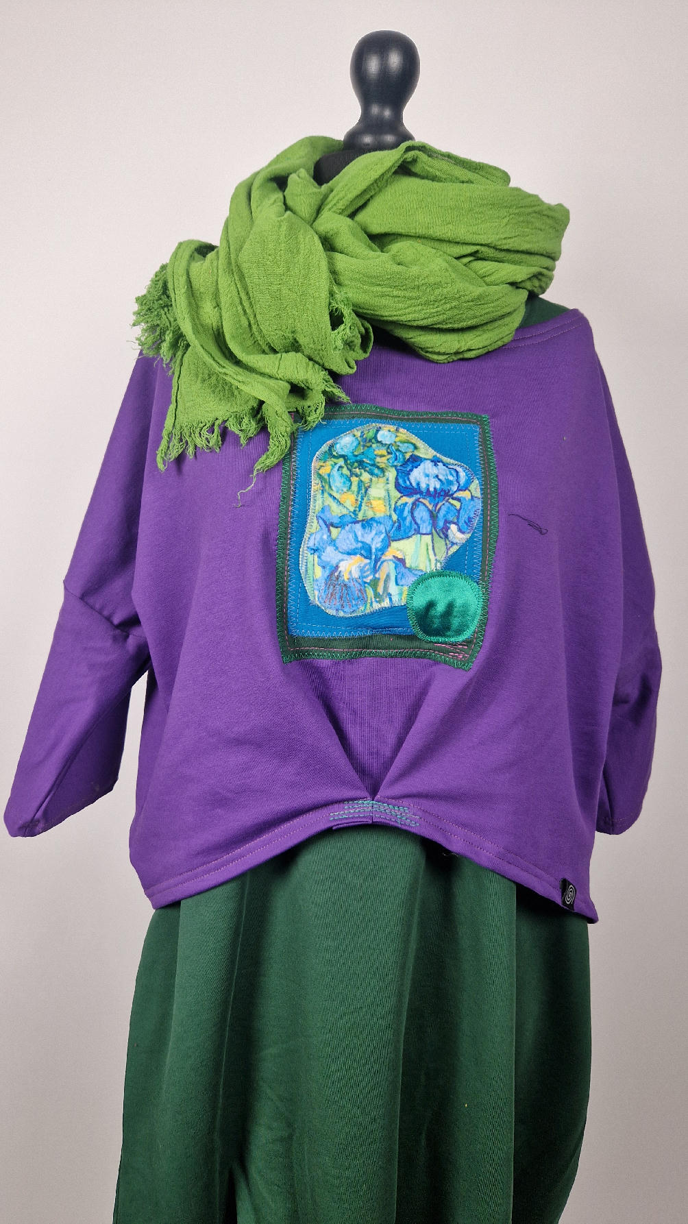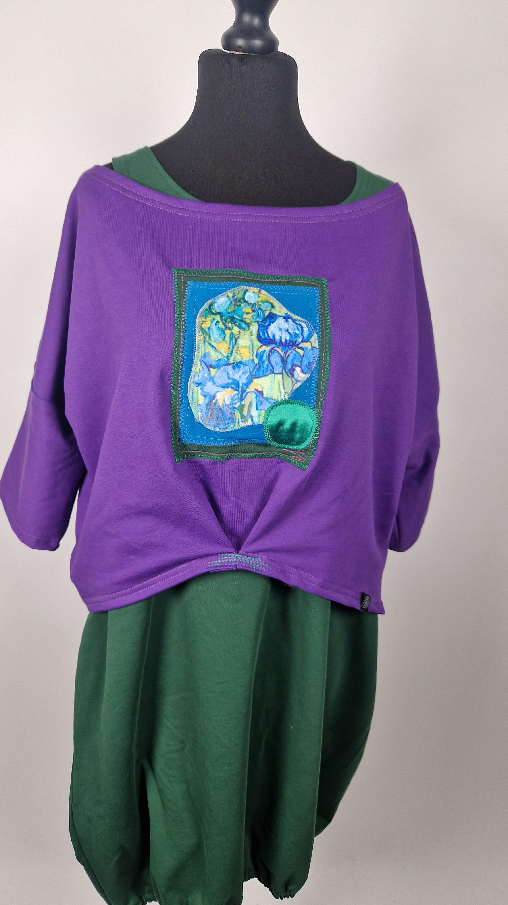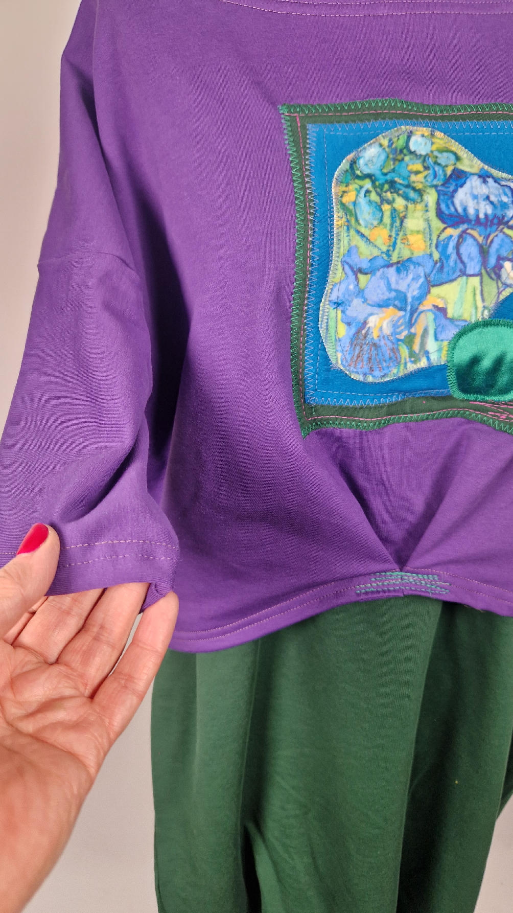 Krótka, fioletowa bluzka z  aplikacją z Irysami z obrazu van Gogha , z kontrastowymi dodatkami. w kolorze turkusu i szmaragdów…Luźna w biuście bluzka typu NIETOPERZ, ale taki niewielki….bluzka uszyta z  wysokiej jakości bawełny z pętelką,  z rękawem 3/4… , lekko zebrana na dole, żeby układała się bardziej… prosta, bez kieszeni – tak specjalnie, żeby nic nie odstawało  ale z dużym dekoltem  typu ,,łódka”,  który możesz opuścić na jedno ramię, lub nosić symetrycznie…możesz założyć do niej ZARĘKAWKI