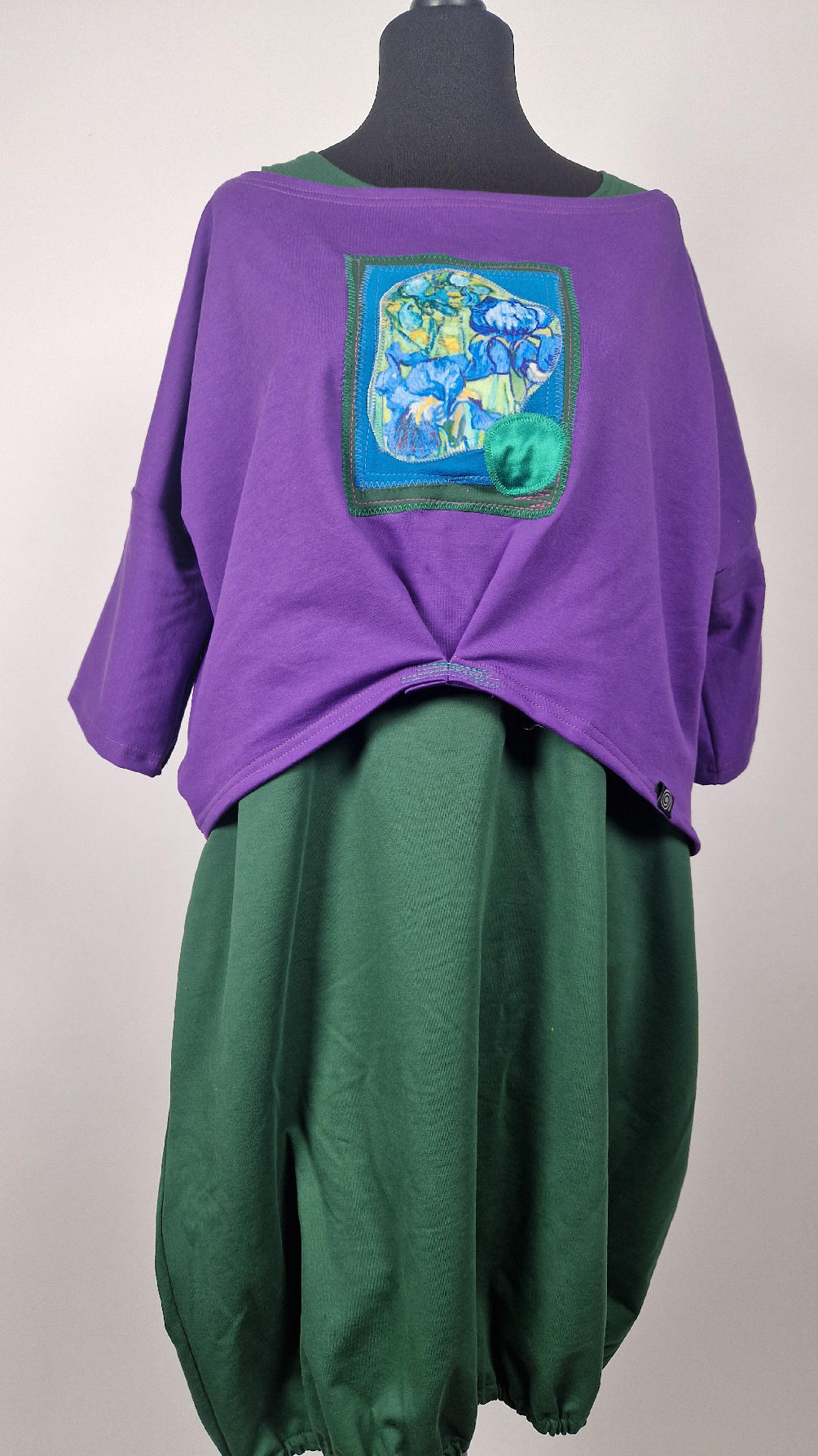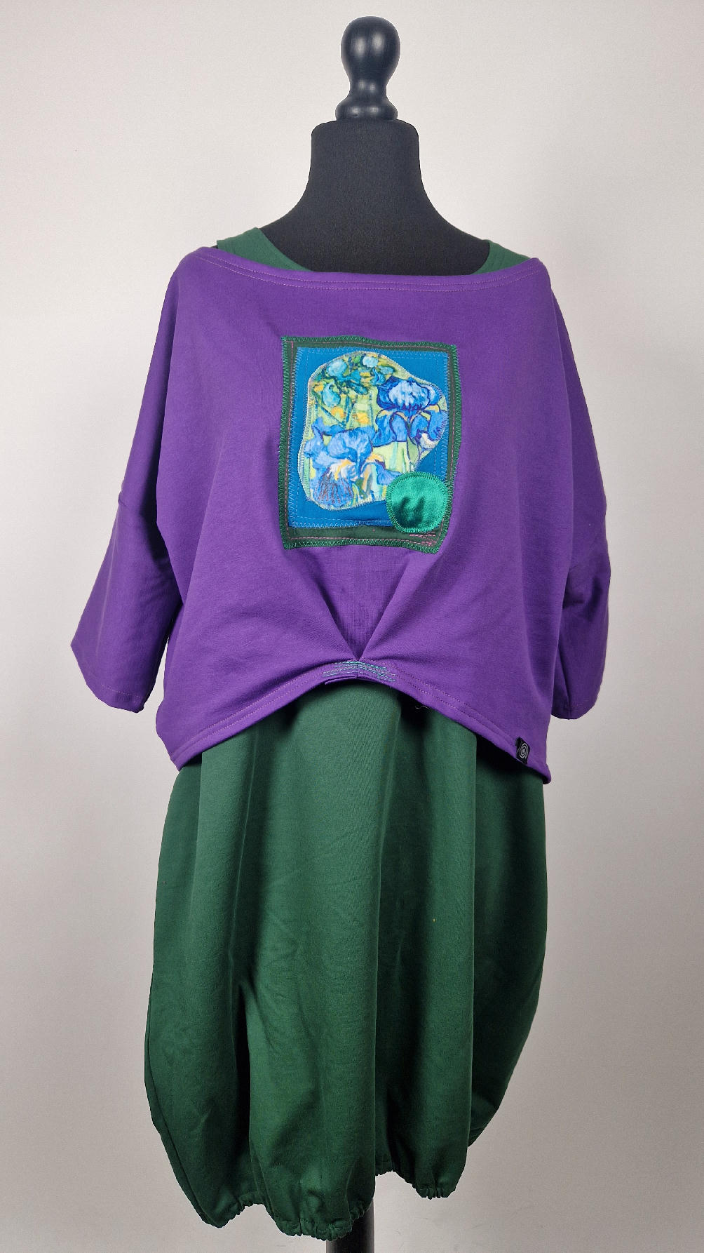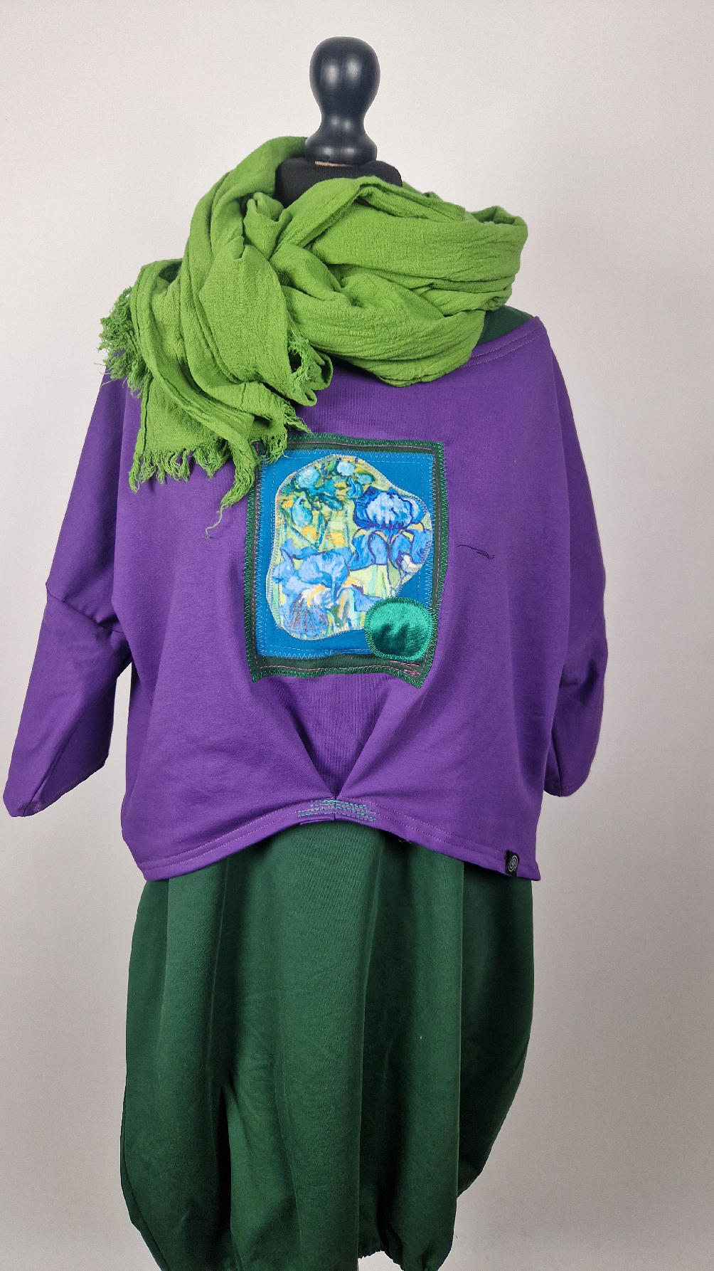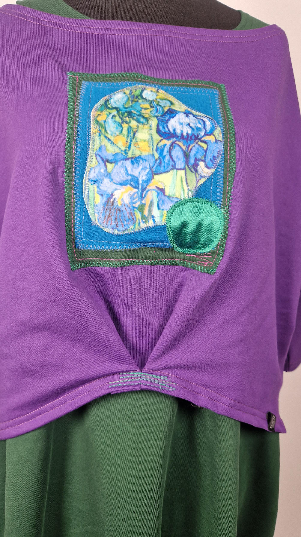 Krótka, fioletowa bluzka z  aplikacją z Irysami z obrazu van Gogha , z kontrastowymi dodatkami. w kolorze turkusu i szmaragdów…Luźna w biuście bluzka typu NIETOPERZ, ale taki niewielki….bluzka uszyta z  wysokiej jakości bawełny z pętelką,  z rękawem 3/4… , lekko zebrana na dole, żeby układała się bardziej… prosta, bez kieszeni – tak specjalnie, żeby nic nie odstawało  ale z dużym dekoltem  typu ,,łódka”,  który możesz opuścić na jedno ramię, lub nosić symetrycznie…możesz założyć do niej ZARĘKAWKI