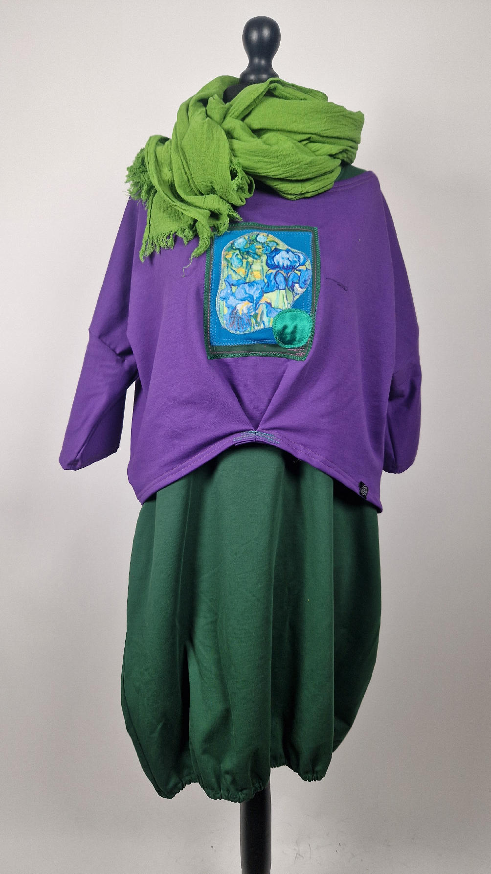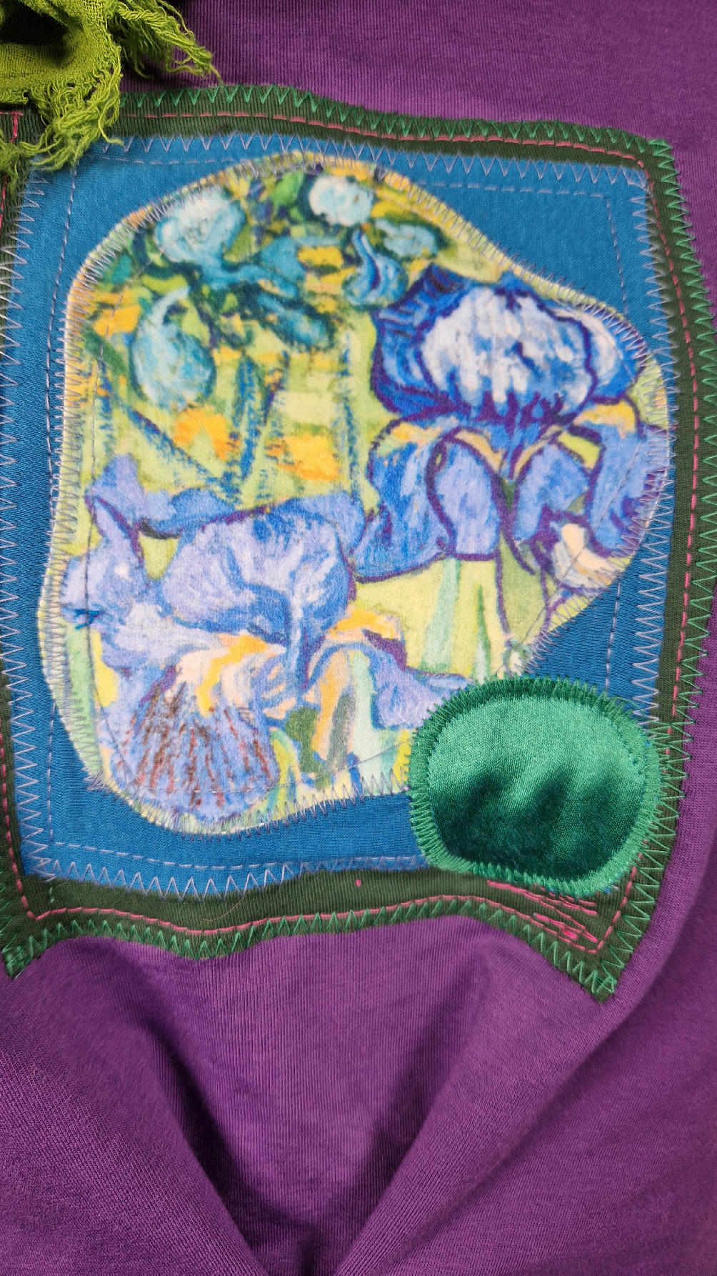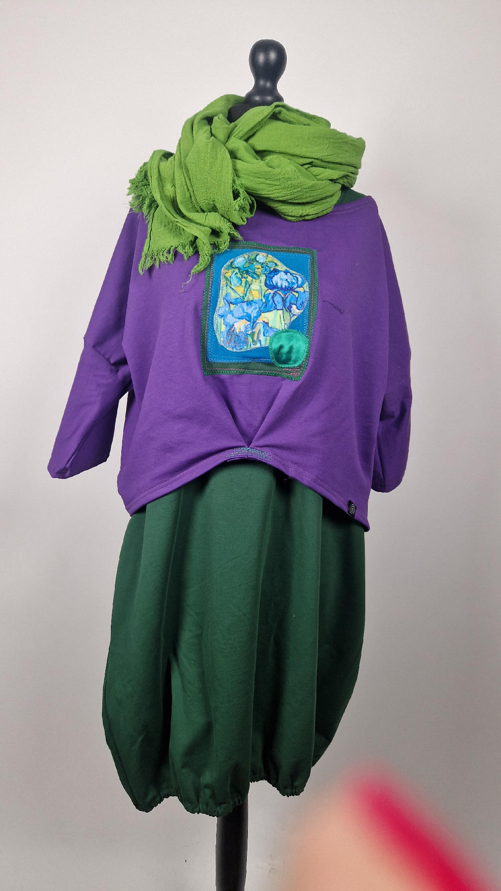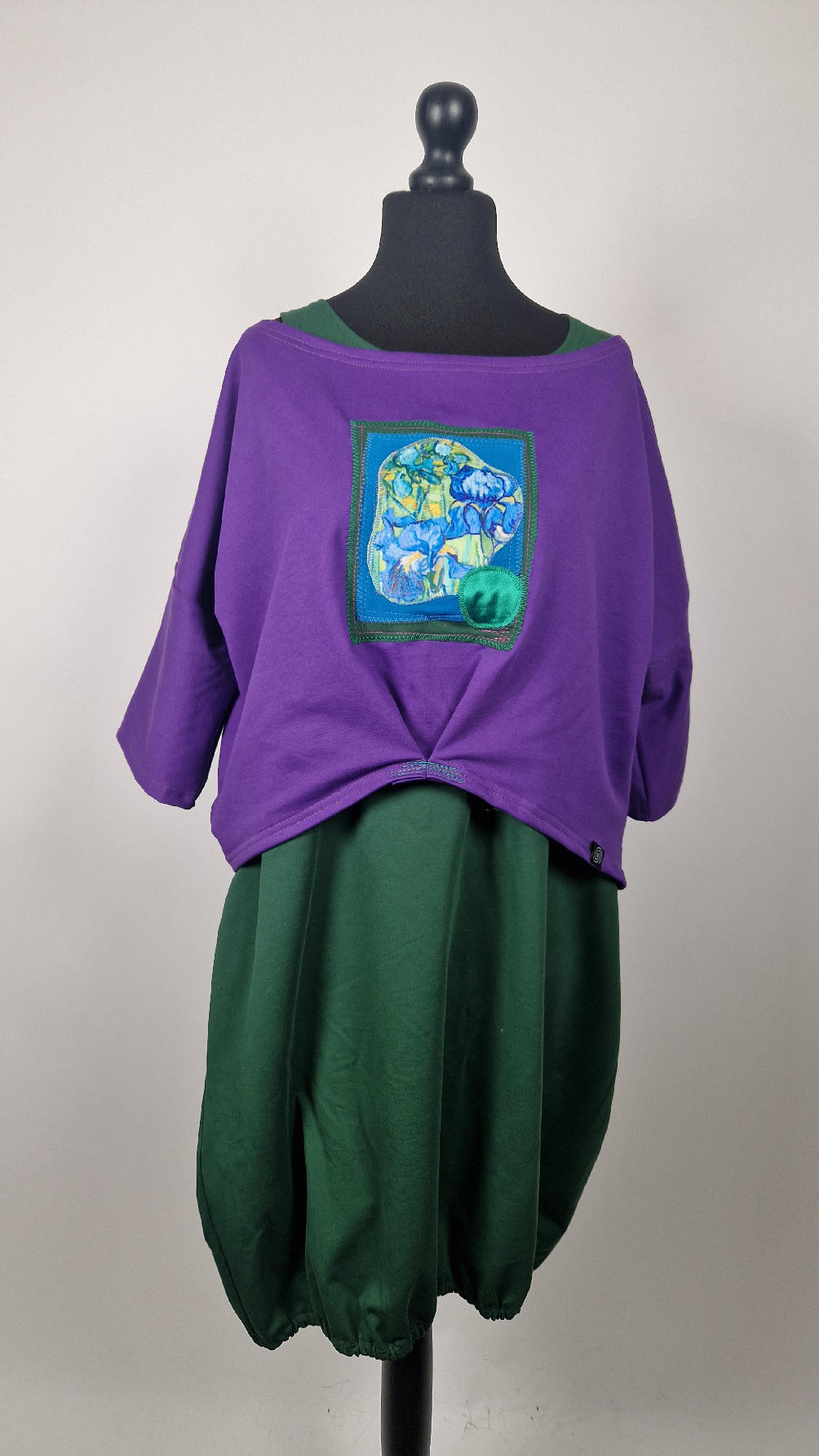 Krótka, fioletowa bluzka z  aplikacją z Irysami z obrazu van Gogha , z kontrastowymi dodatkami. w kolorze turkusu i szmaragdów…Luźna w biuście bluzka typu NIETOPERZ, ale taki niewielki….bluzka uszyta z  wysokiej jakości bawełny z pętelką,  z rękawem 3/4… , lekko zebrana na dole, żeby układała się bardziej… prosta, bez kieszeni – tak specjalnie, żeby nic nie odstawało  ale z dużym dekoltem  typu ,,łódka”,  który możesz opuścić na jedno ramię, lub nosić symetrycznie…możesz założyć do niej ZARĘKAWKI