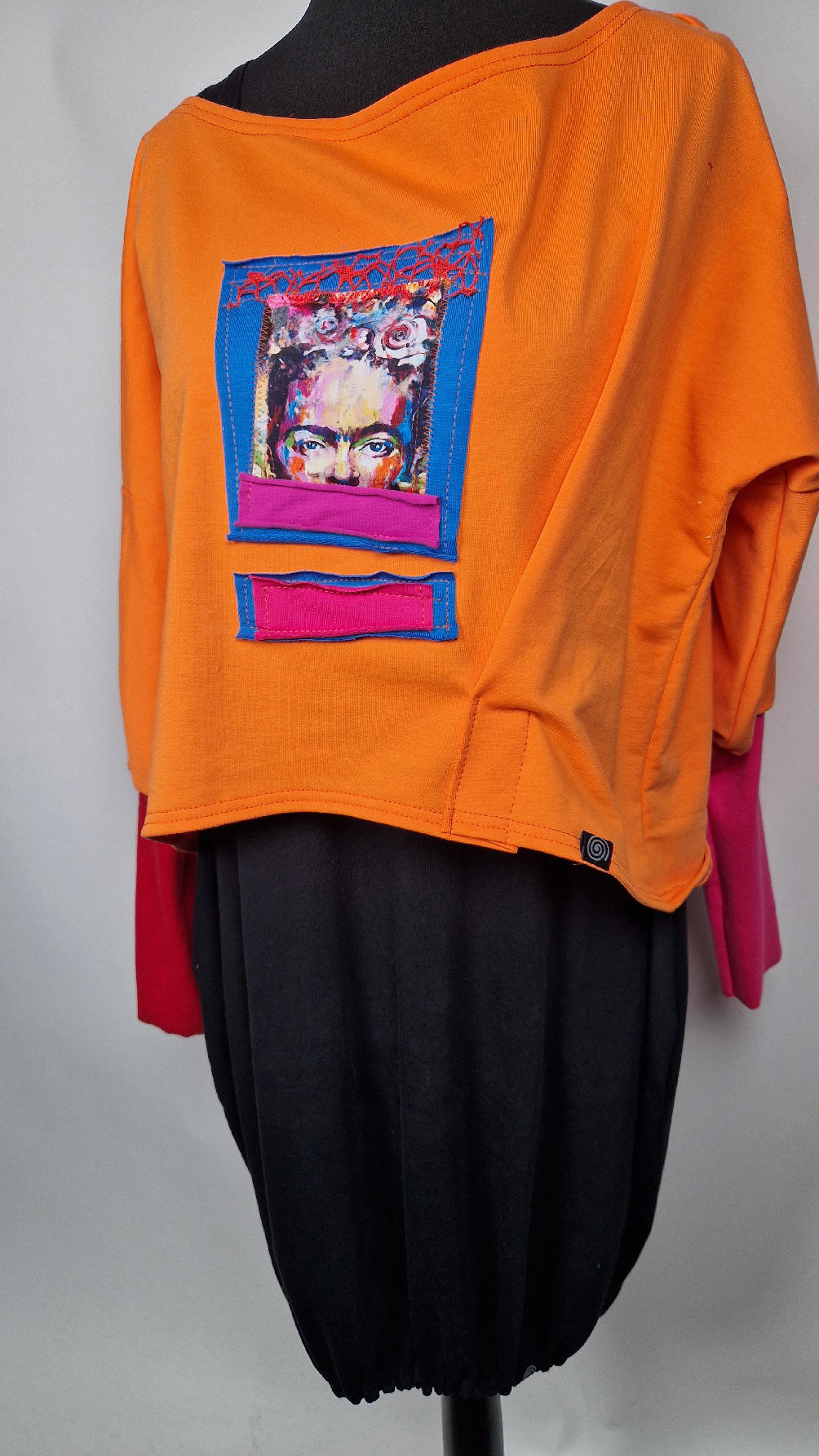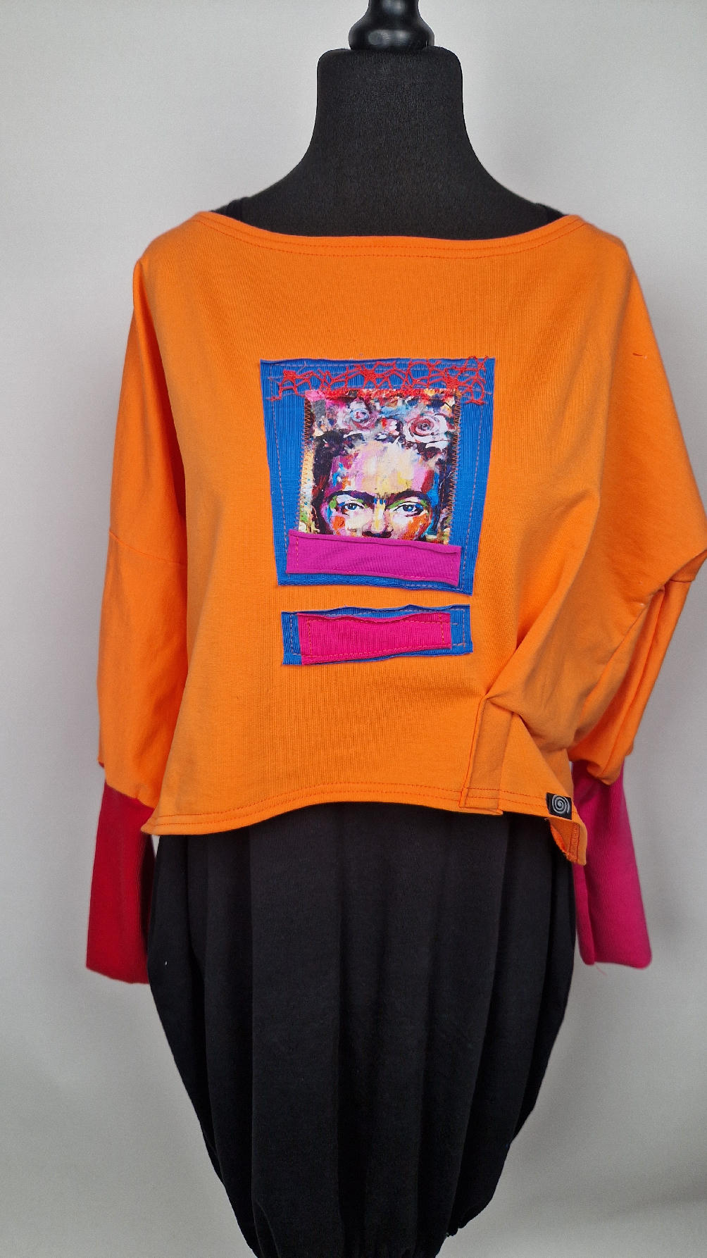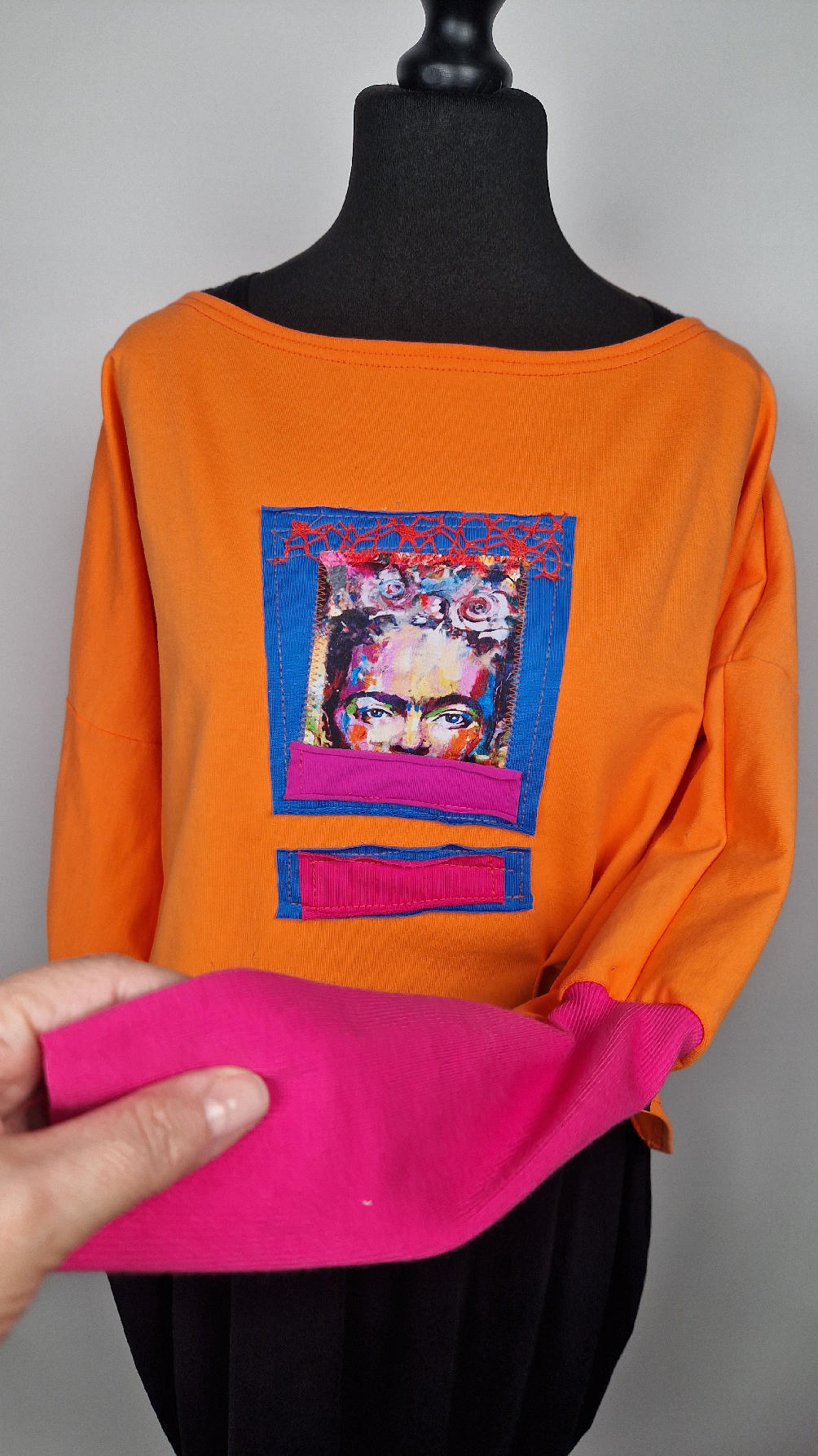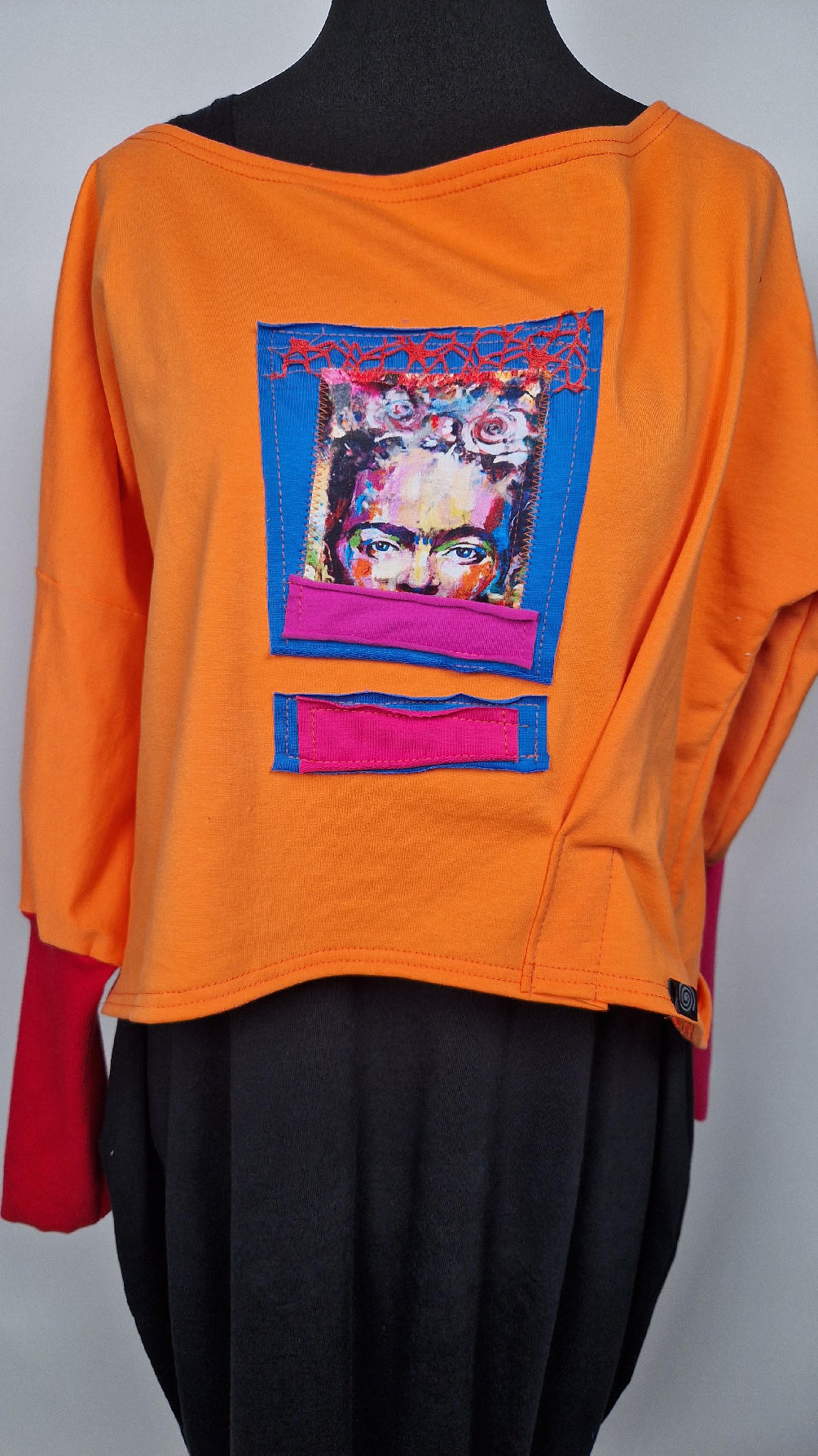 Krótka, mega-pomarańczowa bluzka z kontrastowymi mankietami. Jeden jest czerwony, drugi różowy, a na środku portret Fridy., skomponowany z kontrastowymi tkaninami. Frida z madżentą – taka ,,luzacka”, luźna w biuście bluzka typu NIETOPERZ, ale taki niewielki….bluzka uszyta z wysokiej jakości bawełny z pętelką, z długalaśnymi , elastycznymi mankietami … prosta, bez kieszeni – tak specjalnie, żeby nic nie odstawało ale z dużym dekoltem typu ,,łódka”, który możesz opuścić na jedno ramię, lub nosić symetrycznie…