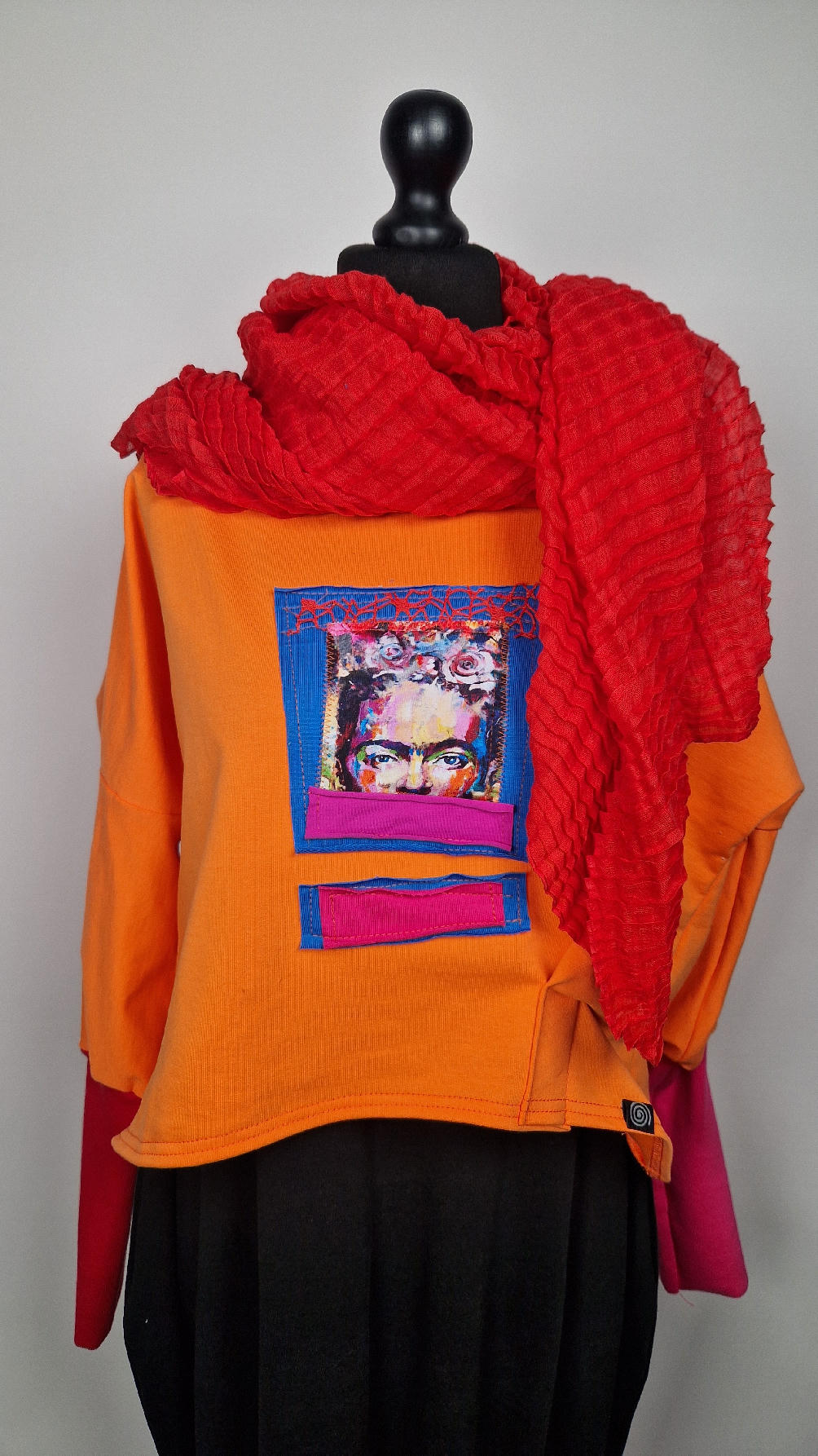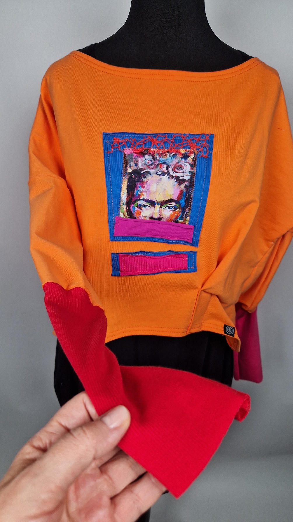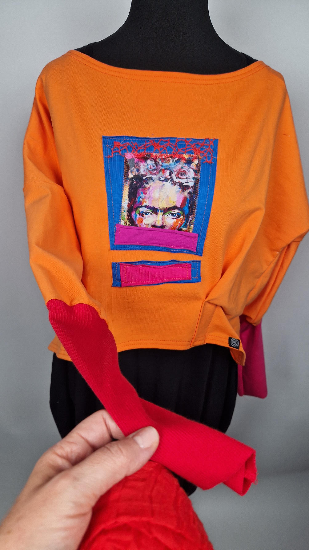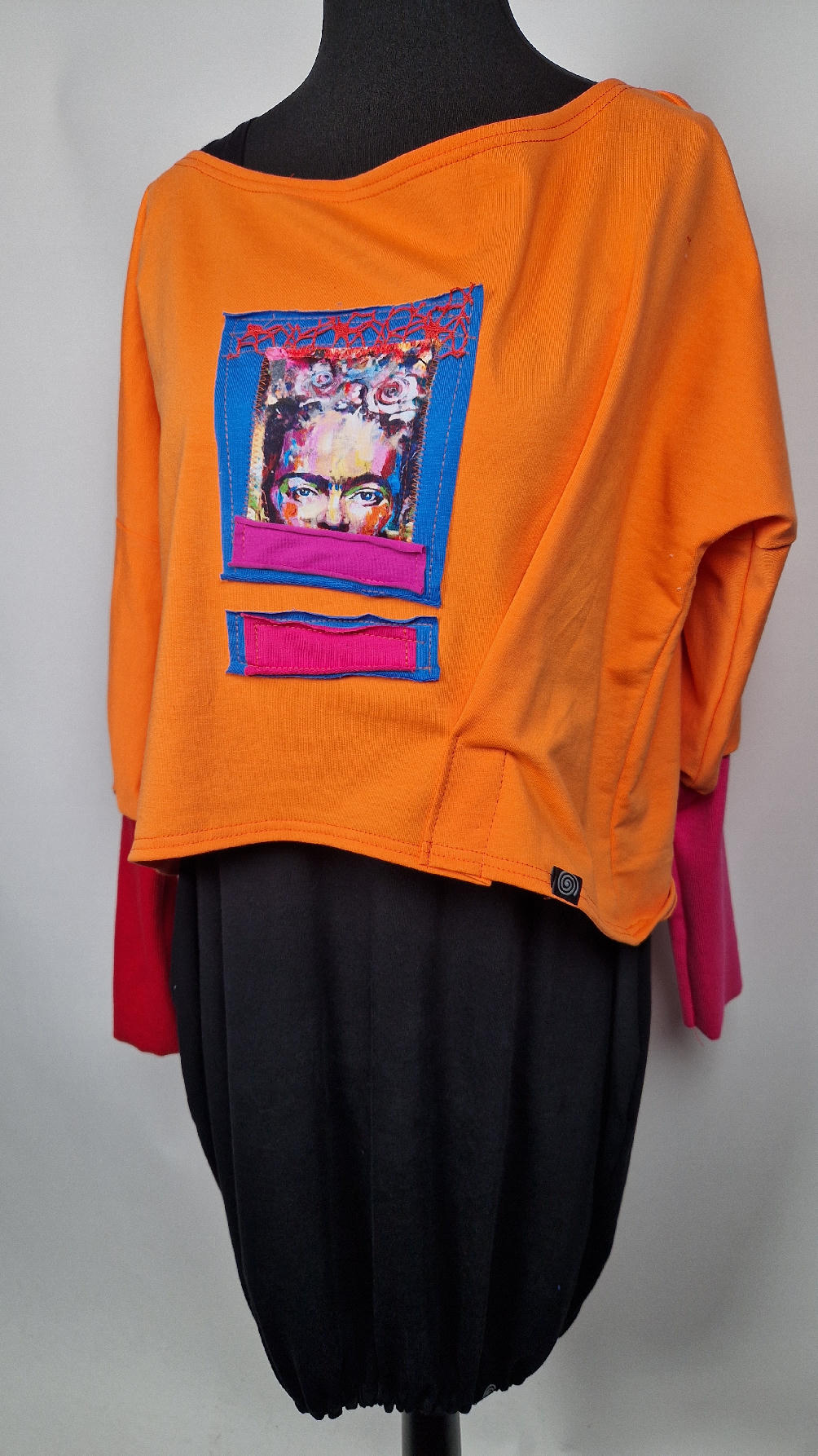 Krótka, mega-pomarańczowa bluzka z kontrastowymi mankietami. Jeden jest czerwony, drugi różowy, a na środku portret Fridy., skomponowany z kontrastowymi tkaninami. Frida z madżentą – taka ,,luzacka”, luźna w biuście bluzka typu NIETOPERZ, ale taki niewielki….bluzka uszyta z wysokiej jakości bawełny z pętelką, z długalaśnymi , elastycznymi mankietami … prosta, bez kieszeni – tak specjalnie, żeby nic nie odstawało ale z dużym dekoltem typu ,,łódka”, który możesz opuścić na jedno ramię, lub nosić symetrycznie…