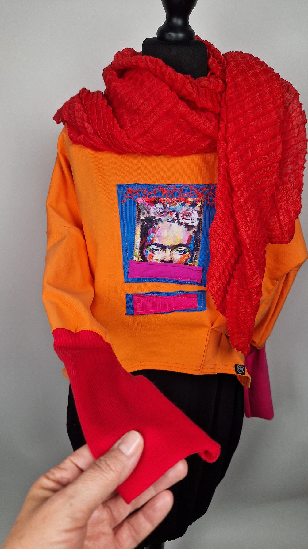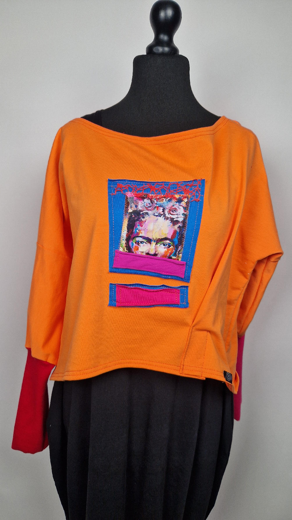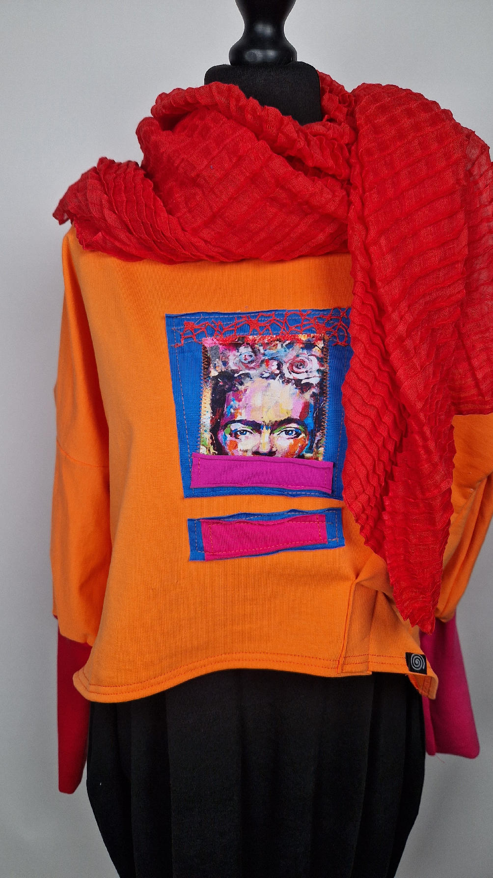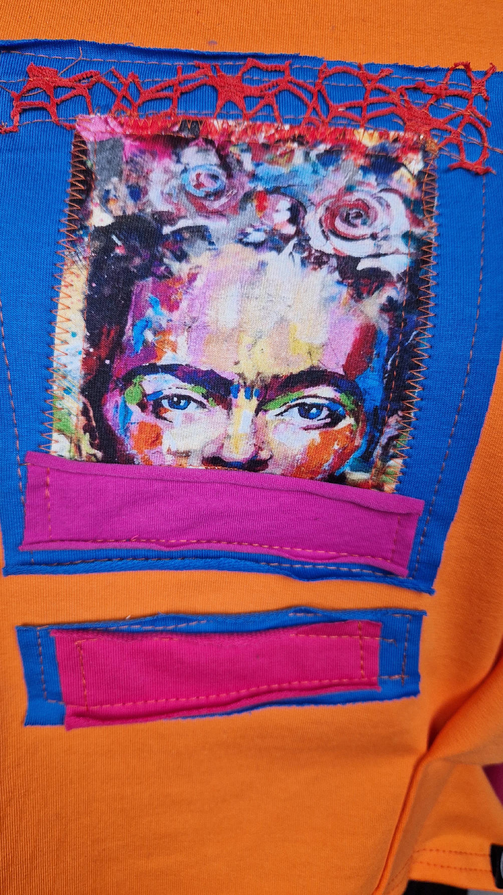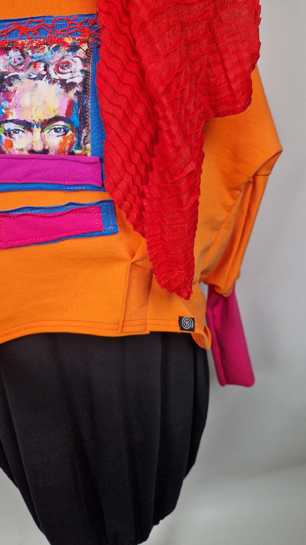Krótka, mega-pomarańczowa bluzka z kontrastowymi mankietami. Jeden jest czerwony, drugi różowy, a na środku portret Fridy., skomponowany z kontrastowymi tkaninami. Frida z madżentą – taka ,,luzacka”, luźna w biuście bluzka typu NIETOPERZ, ale taki niewielki….bluzka uszyta z wysokiej jakości bawełny z pętelką, z długalaśnymi , elastycznymi mankietami … prosta, bez kieszeni – tak specjalnie, żeby nic nie odstawało ale z dużym dekoltem typu ,,łódka”, który możesz opuścić na jedno ramię, lub nosić symetrycznie…