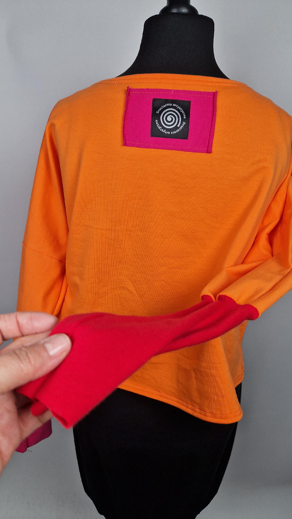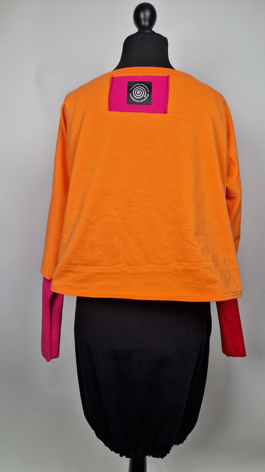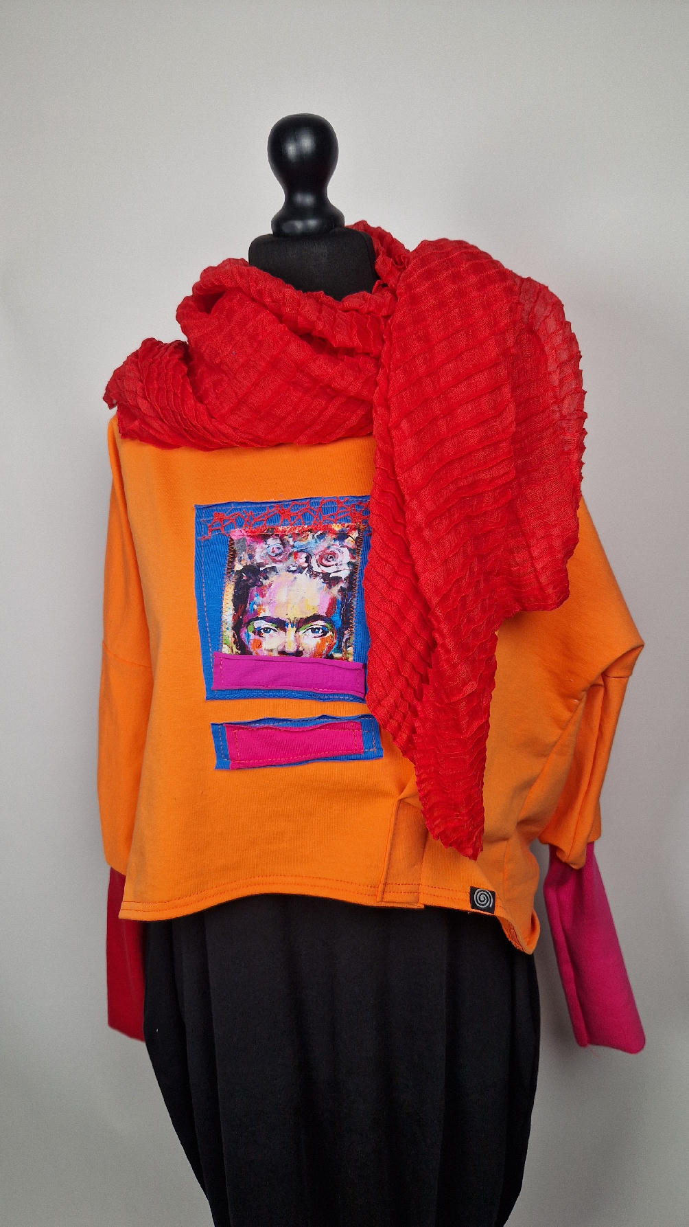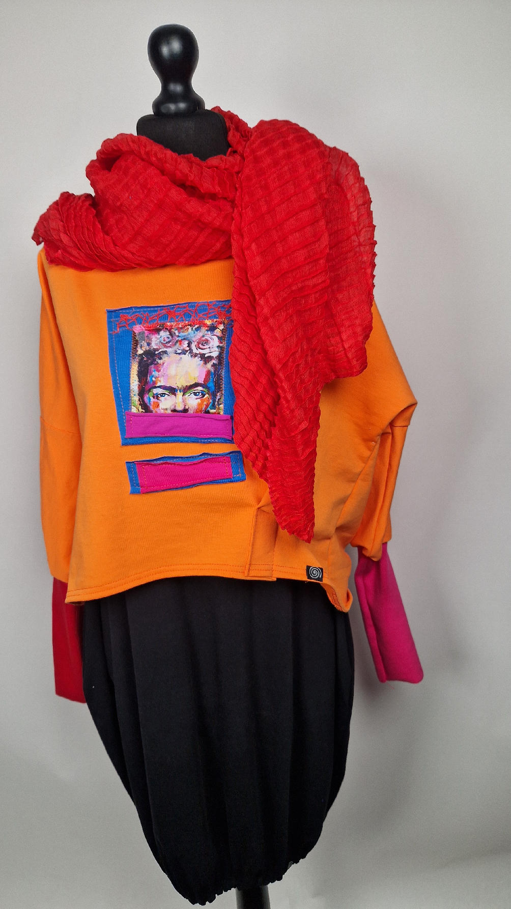 Krótka, mega-pomarańczowa bluzka z kontrastowymi mankietami. Jeden jest czerwony, drugi różowy, a na środku portret Fridy., skomponowany z kontrastowymi tkaninami. Frida z madżentą – taka ,,luzacka”, luźna w biuście bluzka typu NIETOPERZ, ale taki niewielki….bluzka uszyta z wysokiej jakości bawełny z pętelką, z długalaśnymi , elastycznymi mankietami … prosta, bez kieszeni – tak specjalnie, żeby nic nie odstawało ale z dużym dekoltem typu ,,łódka”, który możesz opuścić na jedno ramię, lub nosić symetrycznie…