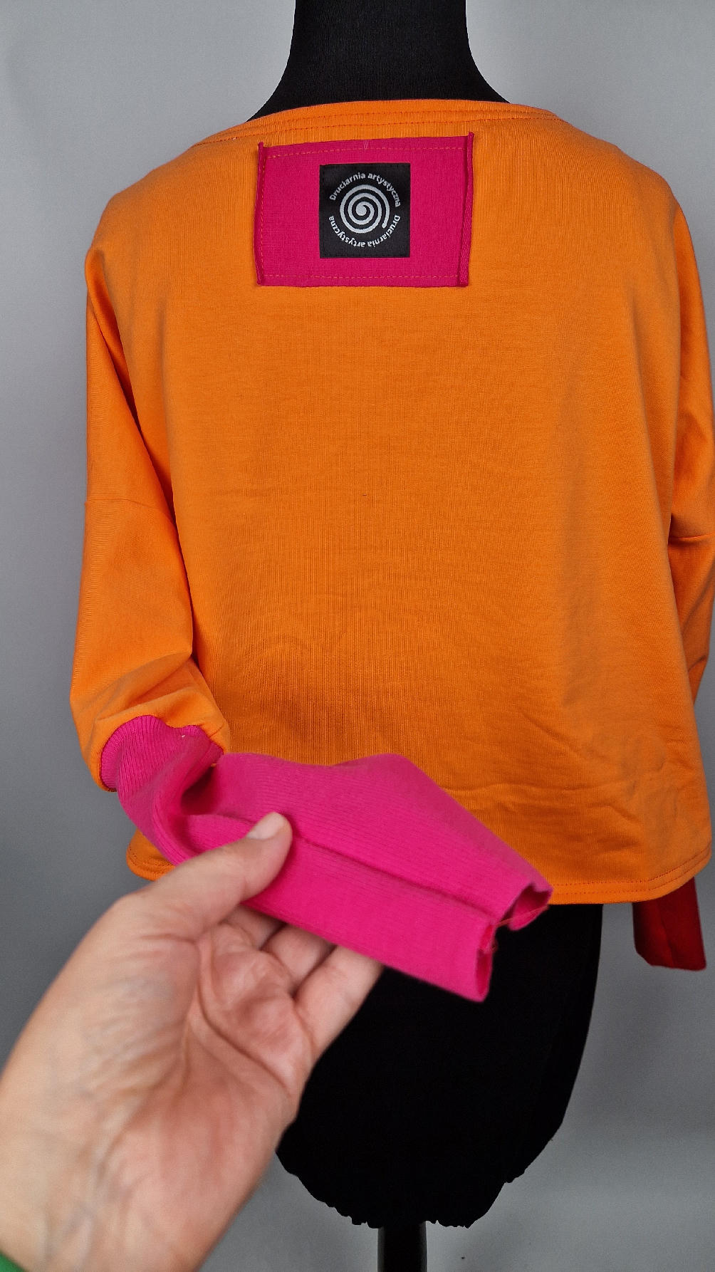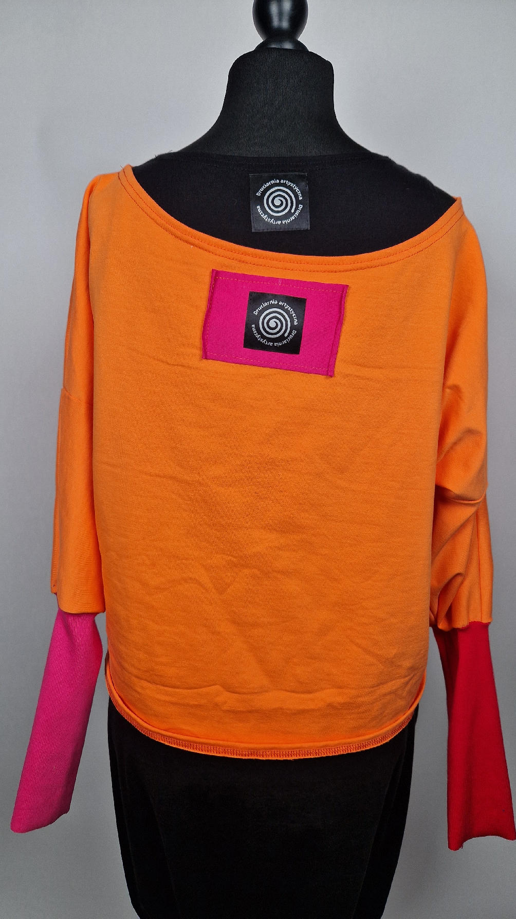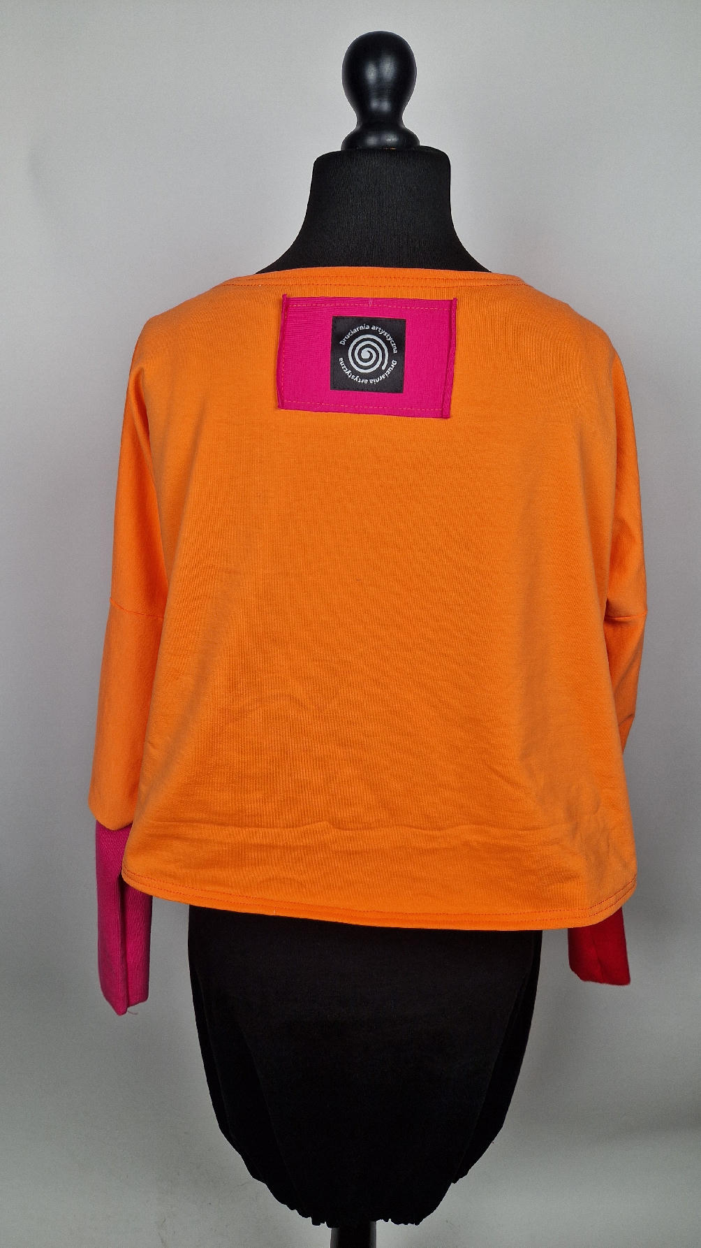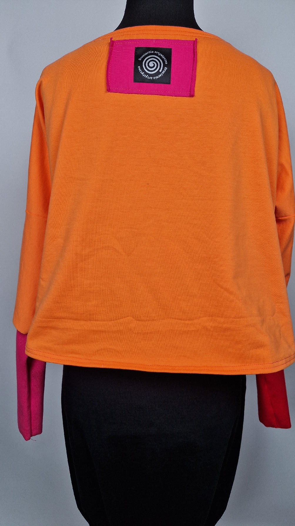 Krótka, mega-pomarańczowa bluzka z kontrastowymi mankietami. Jeden jest czerwony, drugi różowy, a na środku portret Fridy., skomponowany z kontrastowymi tkaninami. Frida z madżentą – taka ,,luzacka”, luźna w biuście bluzka typu NIETOPERZ, ale taki niewielki….bluzka uszyta z wysokiej jakości bawełny z pętelką, z długalaśnymi , elastycznymi mankietami … prosta, bez kieszeni – tak specjalnie, żeby nic nie odstawało ale z dużym dekoltem typu ,,łódka”, który możesz opuścić na jedno ramię, lub nosić symetrycznie…