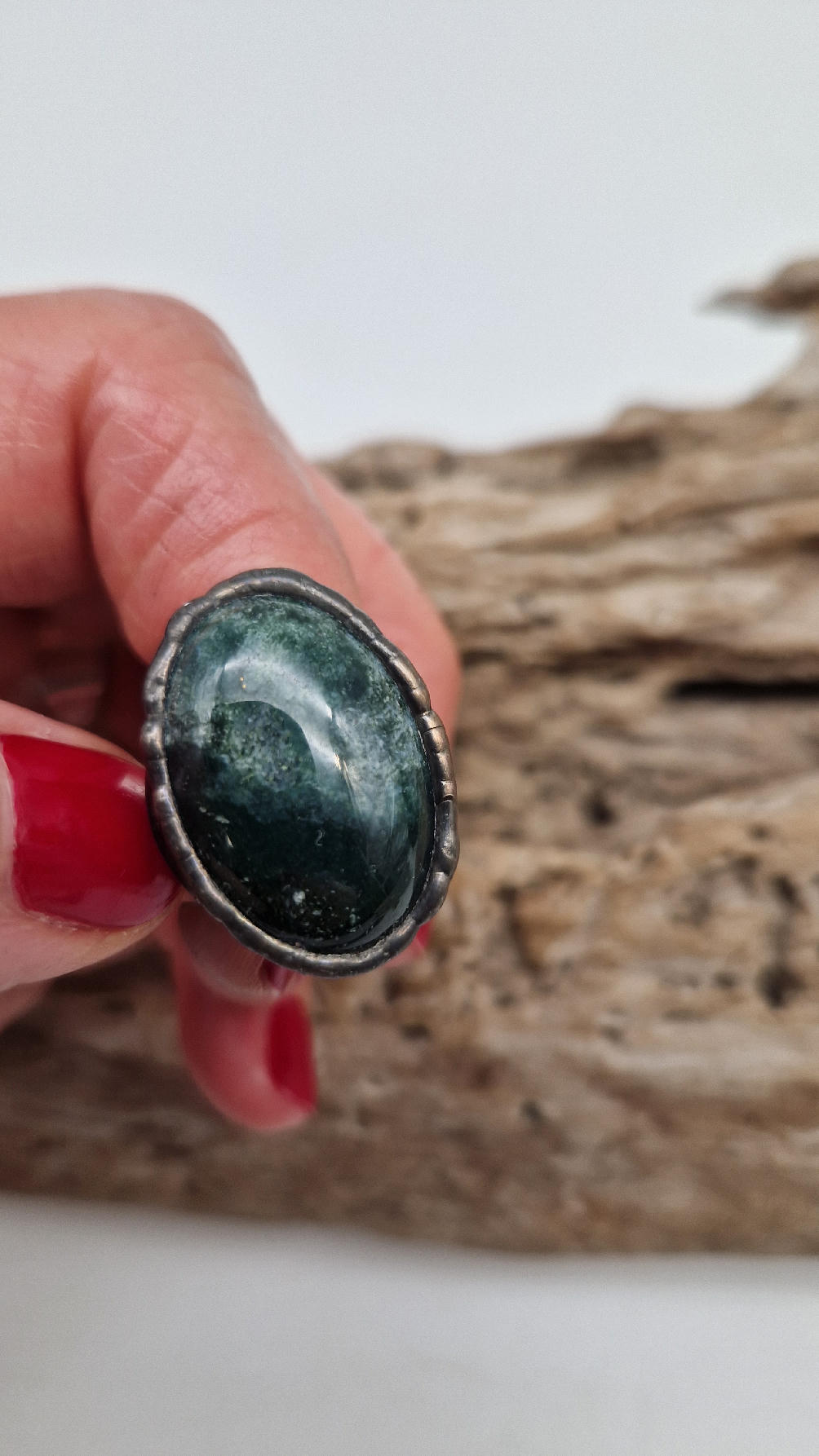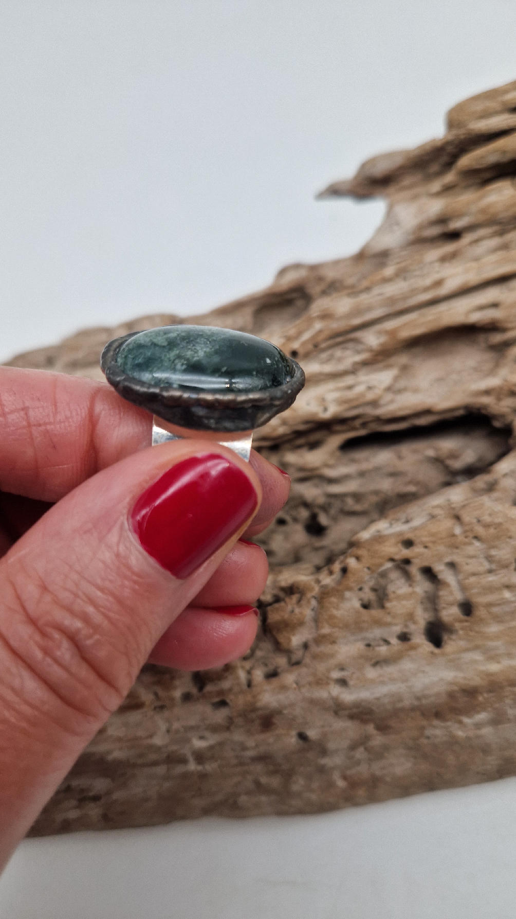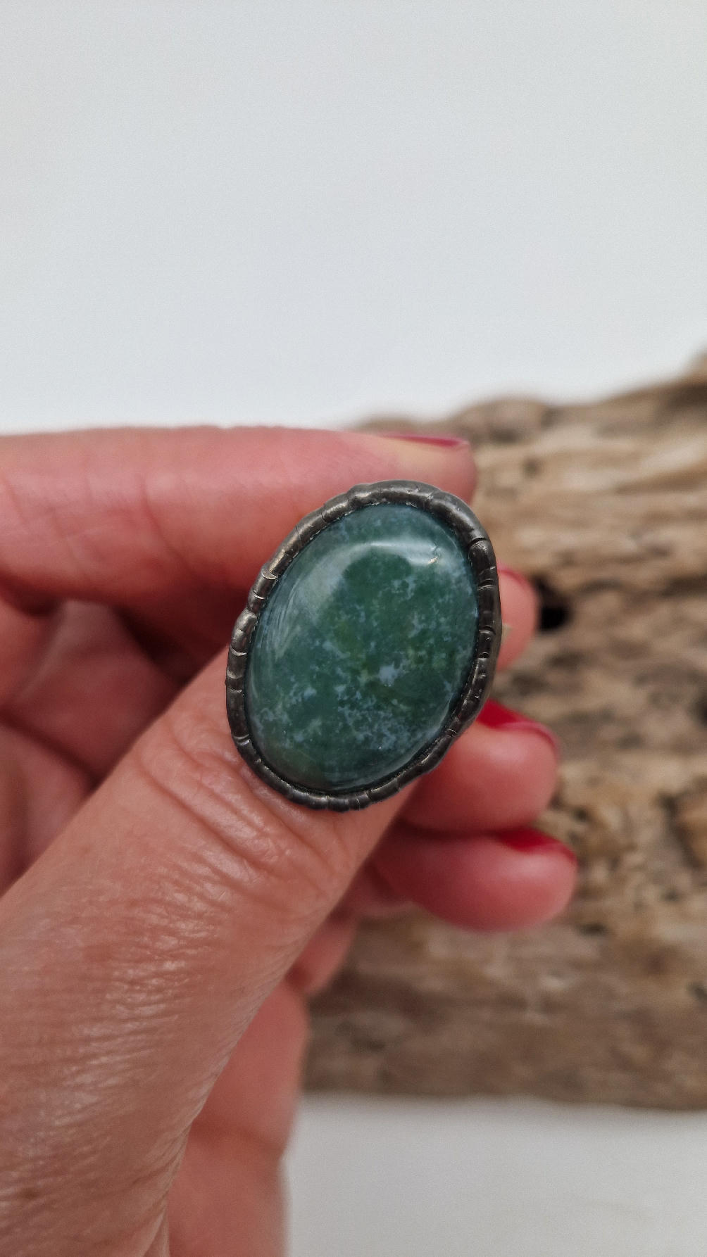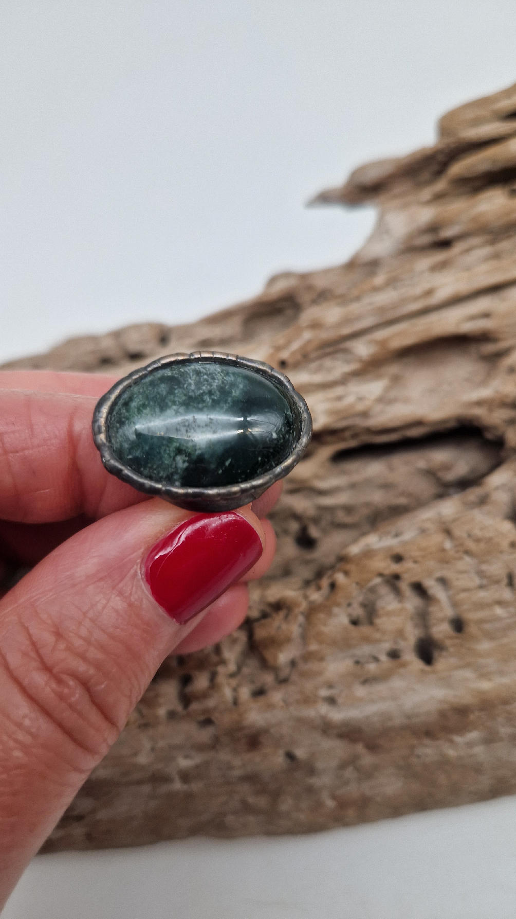 Niezwykle piękny, nieduży, zgrabny, zielony, owalny pierścionek z agatem mszystym z Indii , oprawiony w kutą i patynowaną miedź. Piękna metaloplastyka z pięknym kamieniem . Pierścionek ma regulowaną obrączkę, więc pasuje na każdy palec…ale możesz powiesić go na łańcuszku lub rzemieniu, jeśli nie lubisz pierścionków, a podoba Ci się forma i kamień…