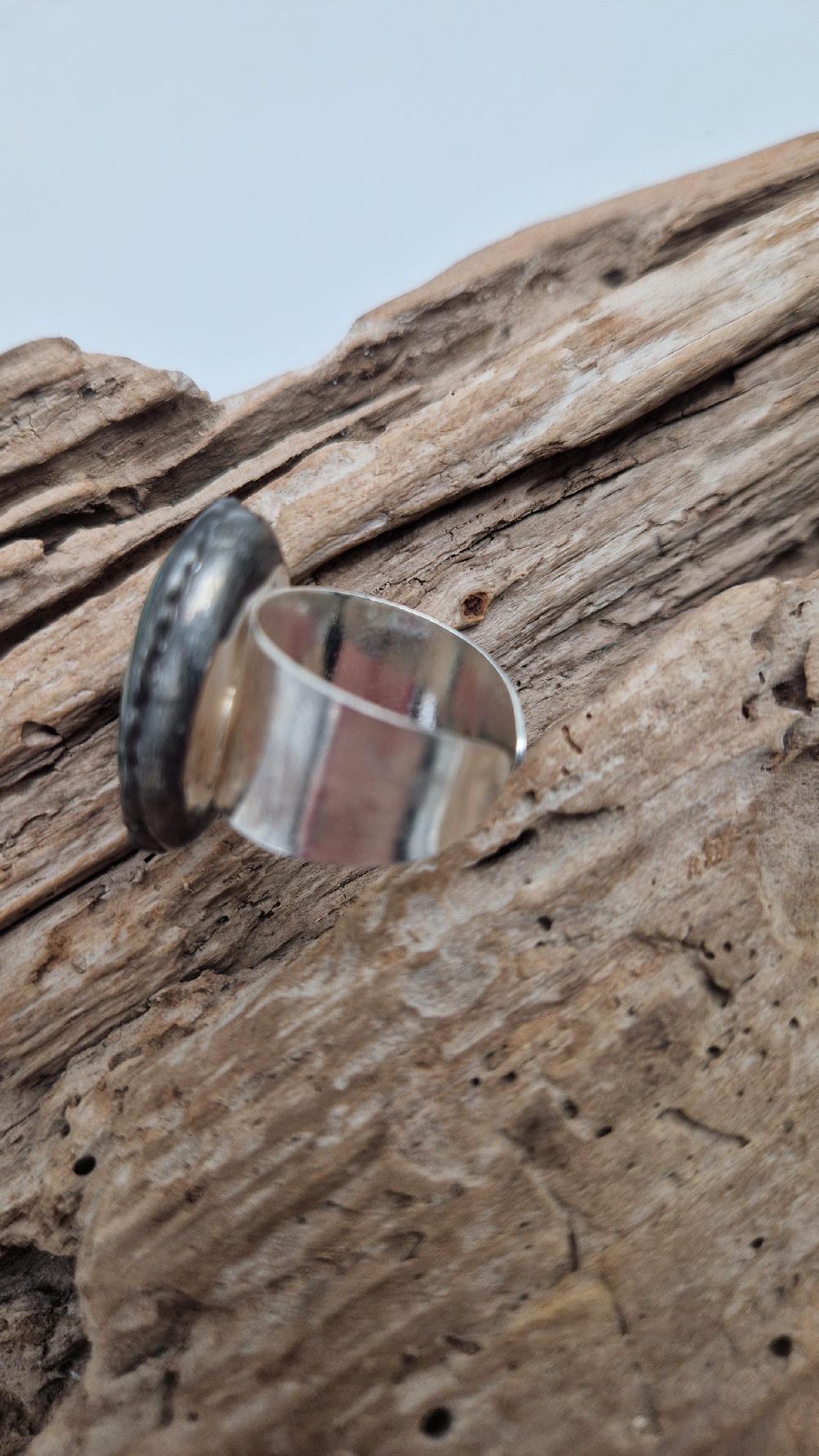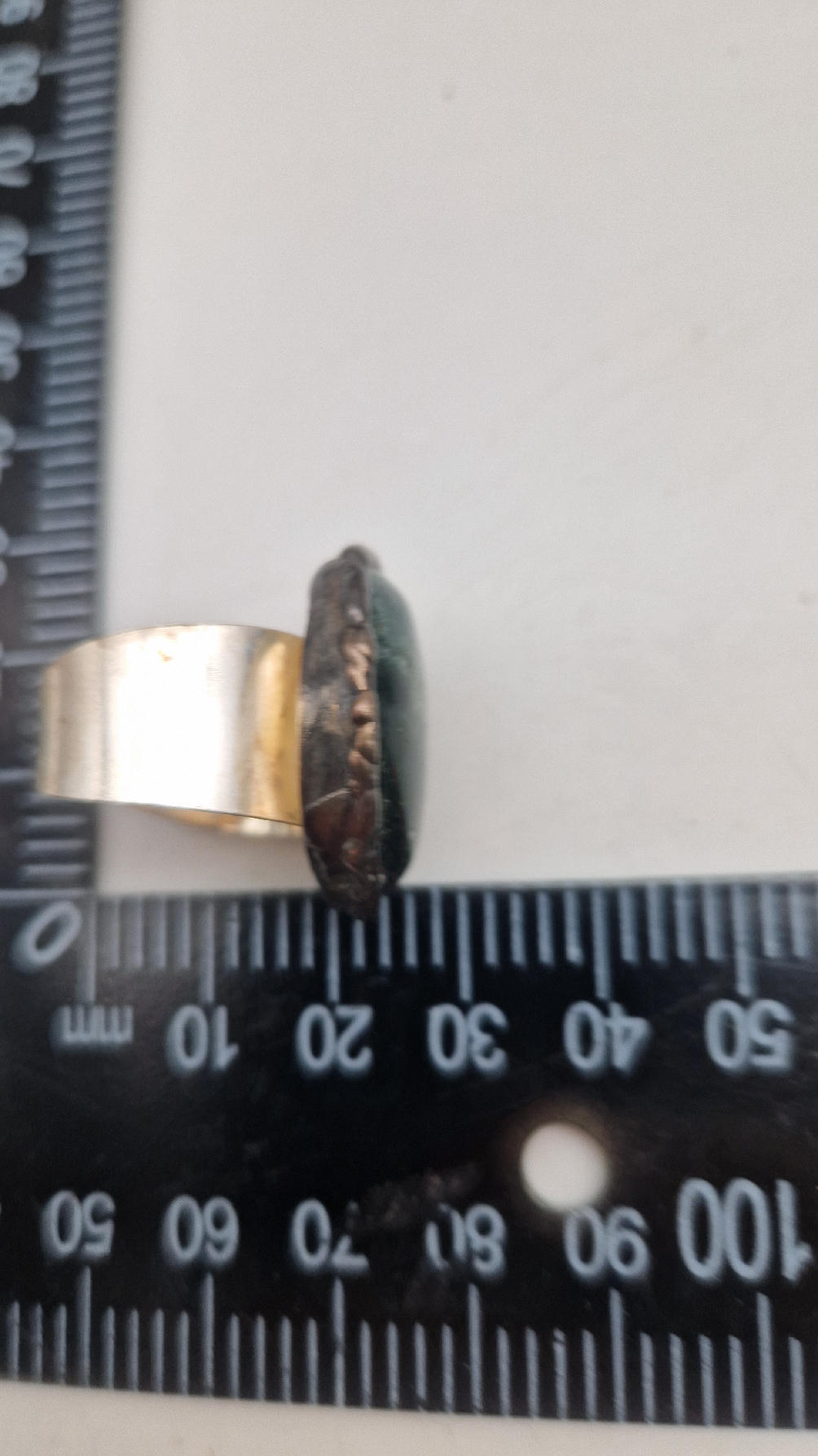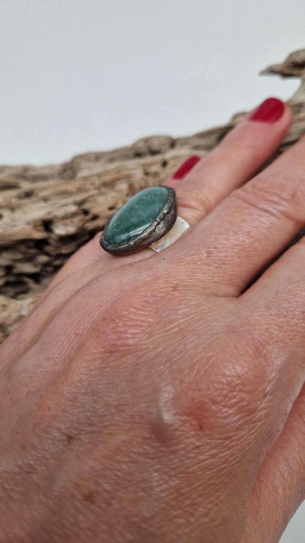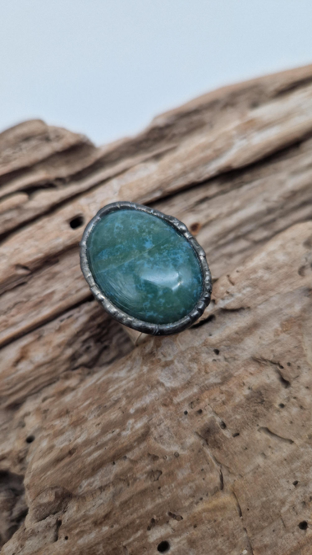 Niezwykle piękny, nieduży, zgrabny, zielony, owalny pierścionek z agatem mszystym z Indii , oprawiony w kutą i patynowaną miedź. Piękna metaloplastyka z pięknym kamieniem . Pierścionek ma regulowaną obrączkę, więc pasuje na każdy palec…ale możesz powiesić go na łańcuszku lub rzemieniu, jeśli nie lubisz pierścionków, a podoba Ci się forma i kamień…