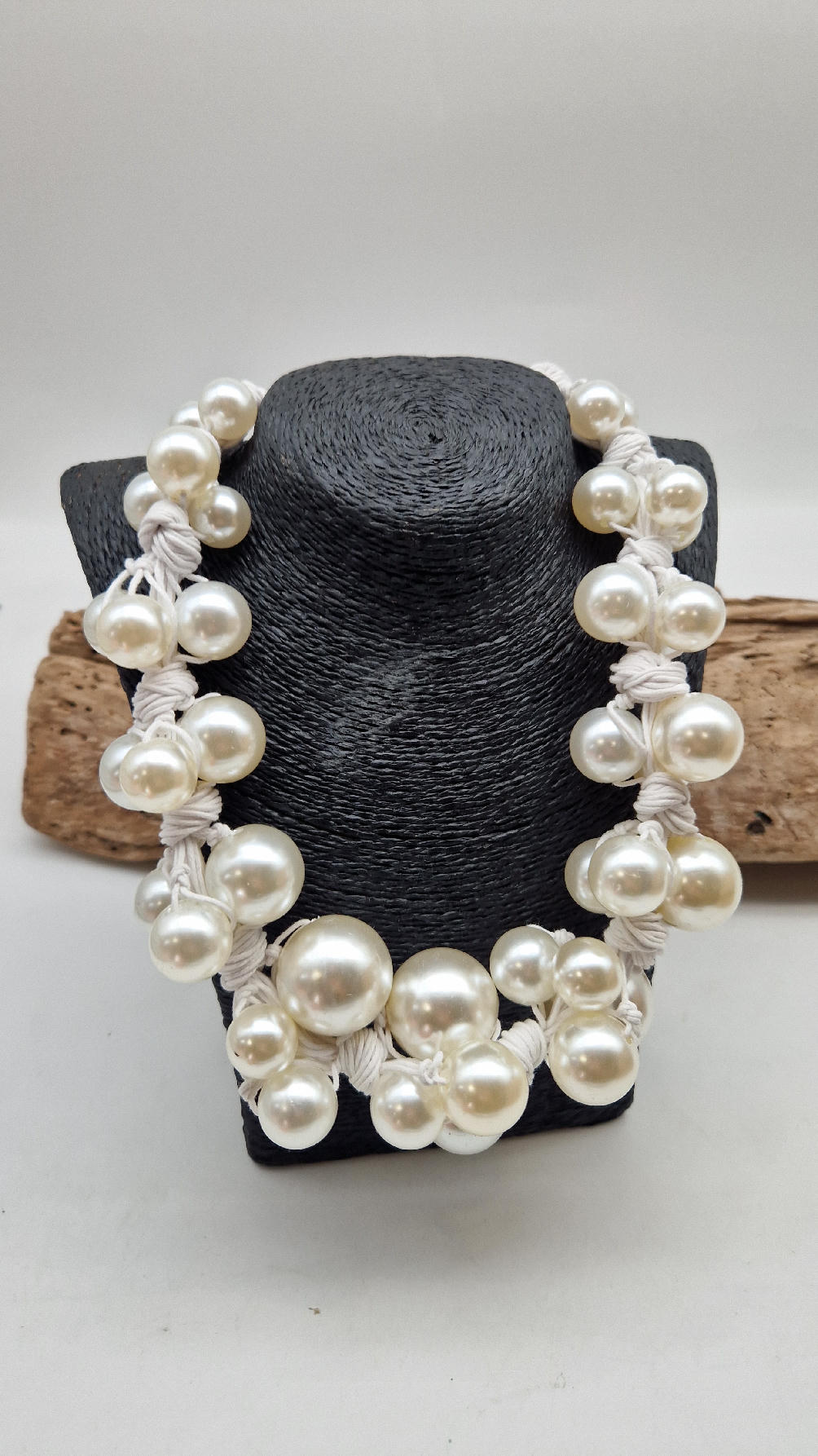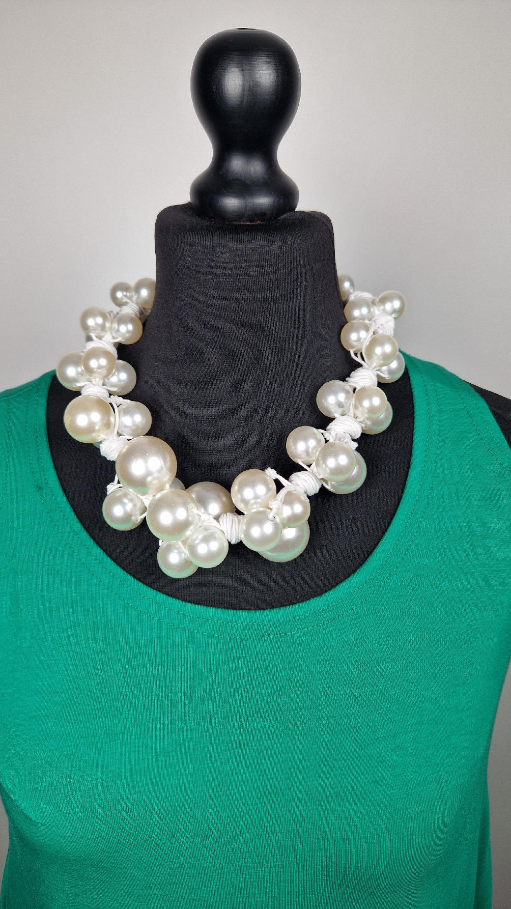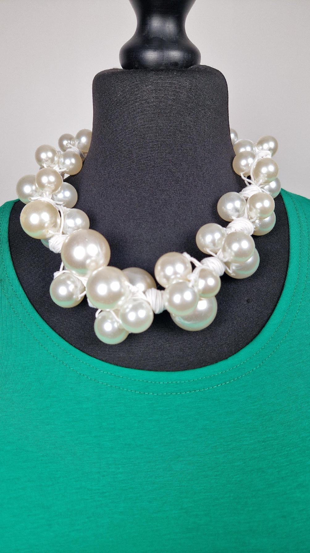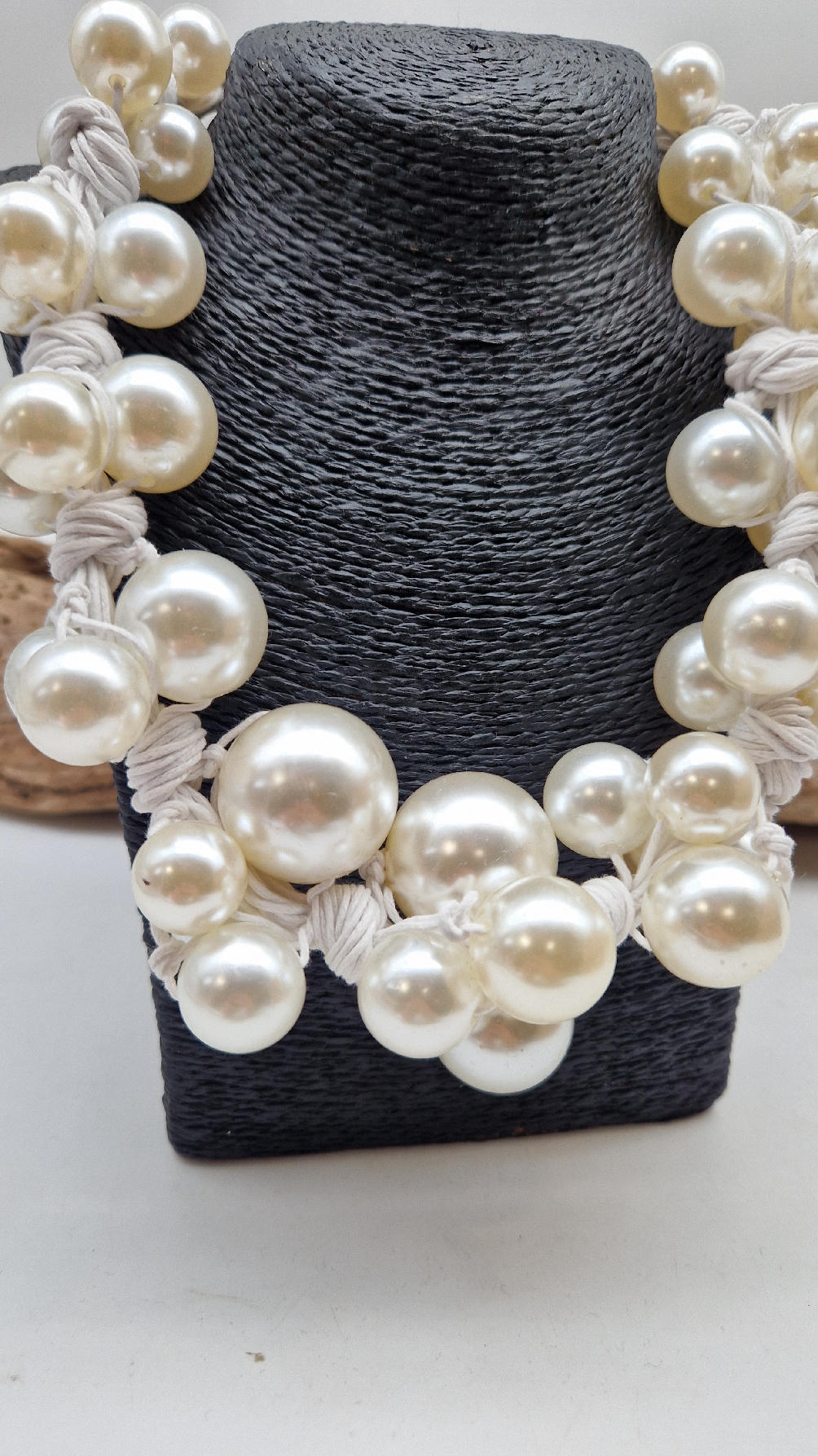 Duży, pasujący do każdej wyjściowej sukienki, idealny do małej czarnej, ale również do jeansów i białej koszuli czy T-shirtu, do lnianego poncza…Perły zrobione z żywicy i białego, bawełnianego sznurka.