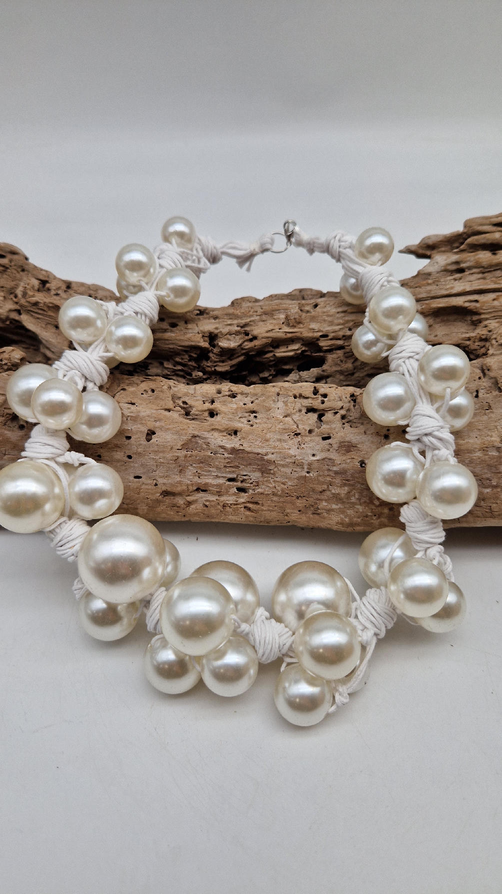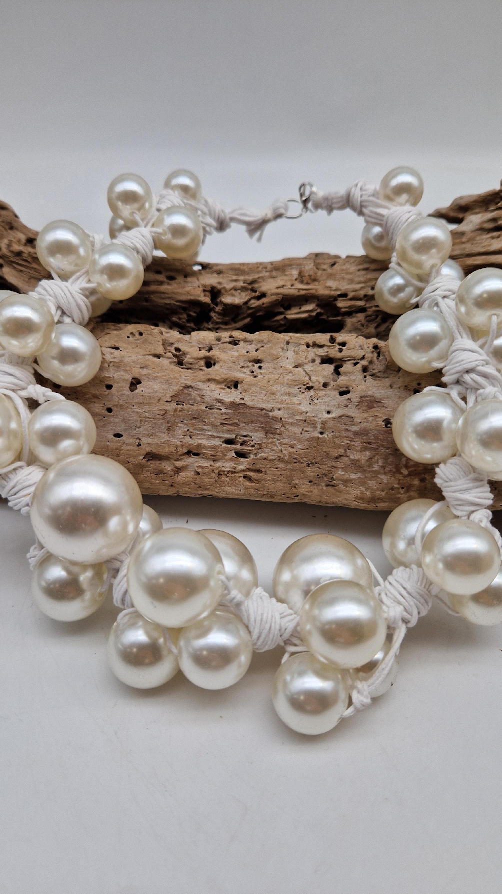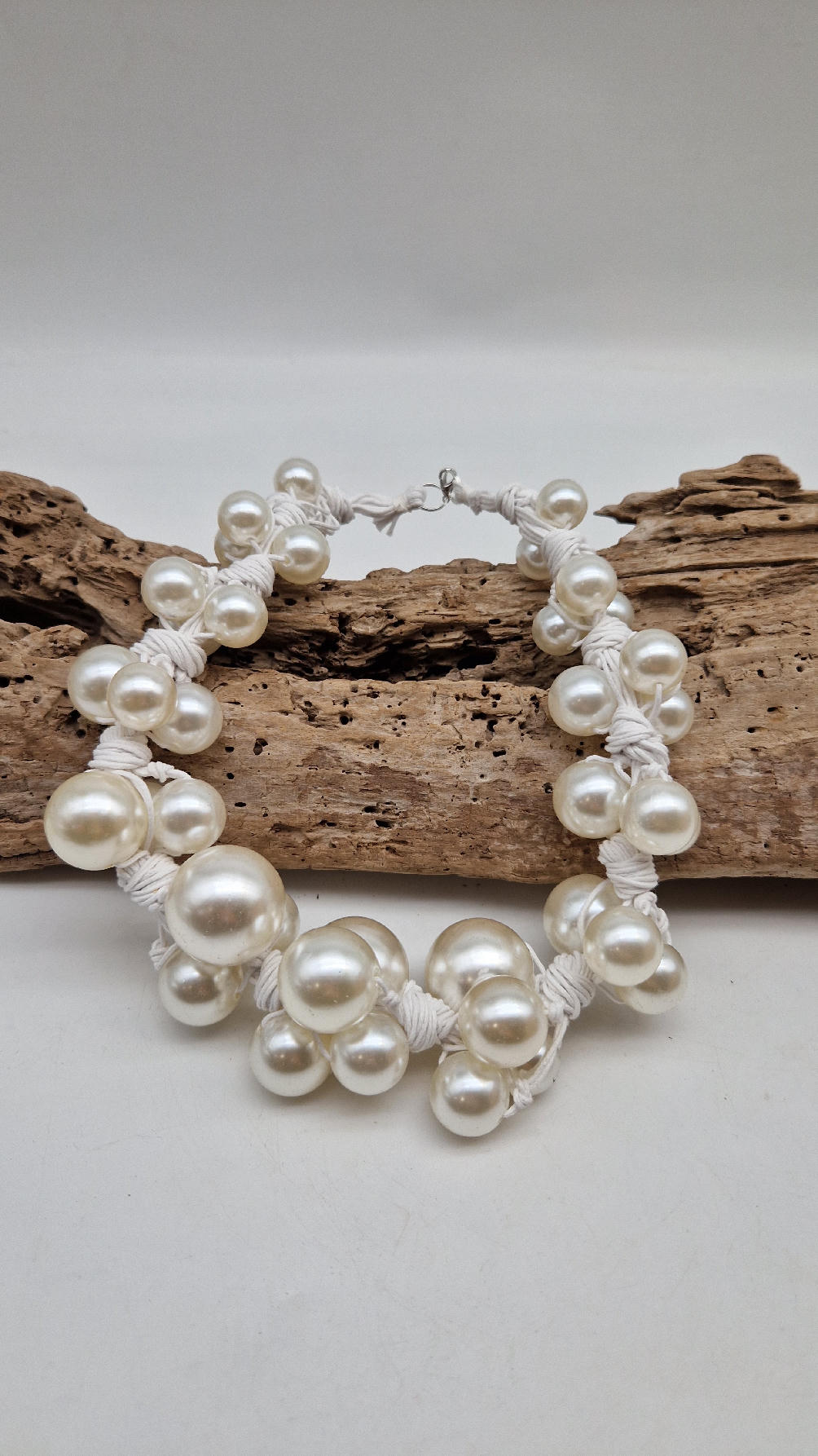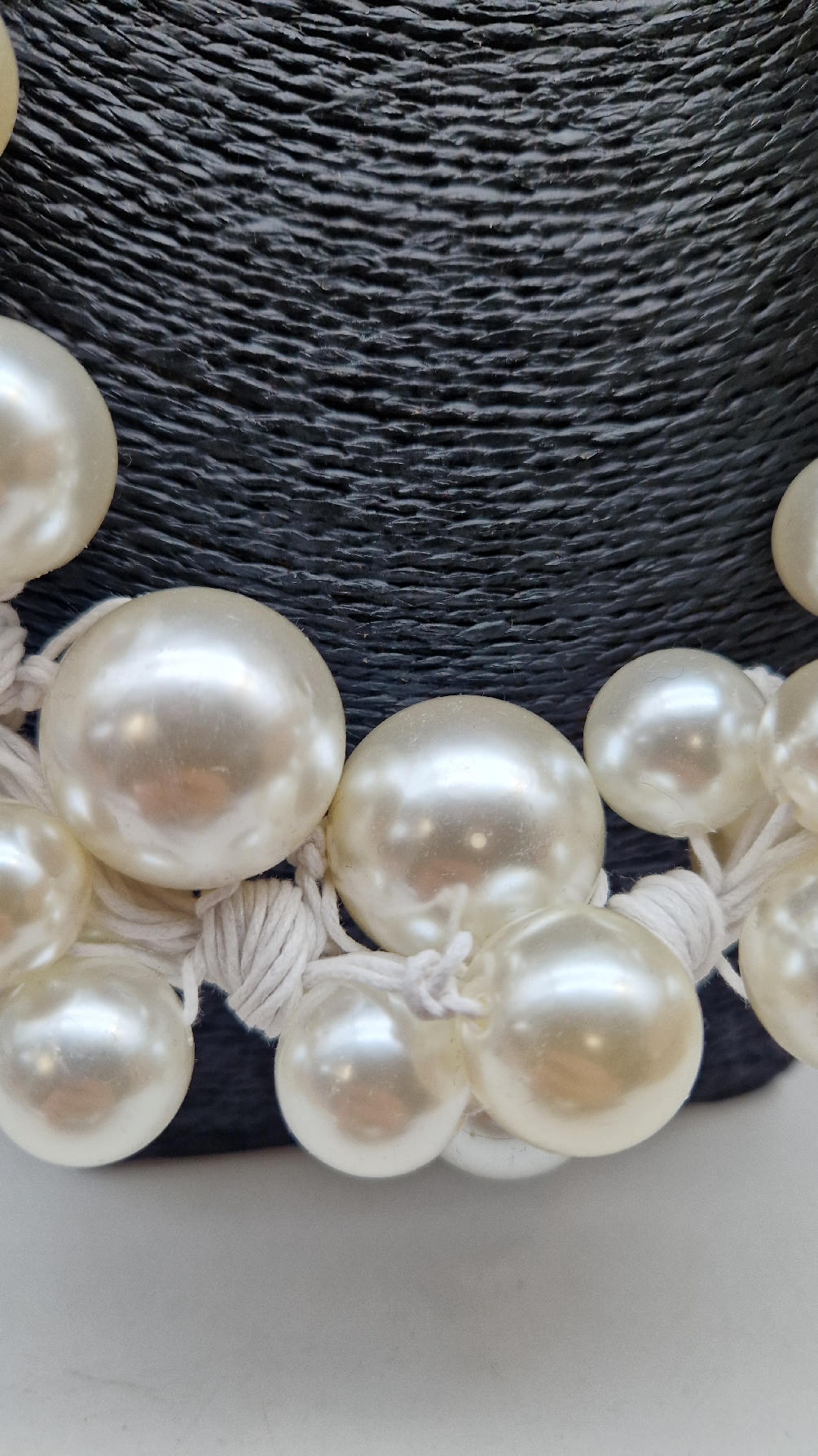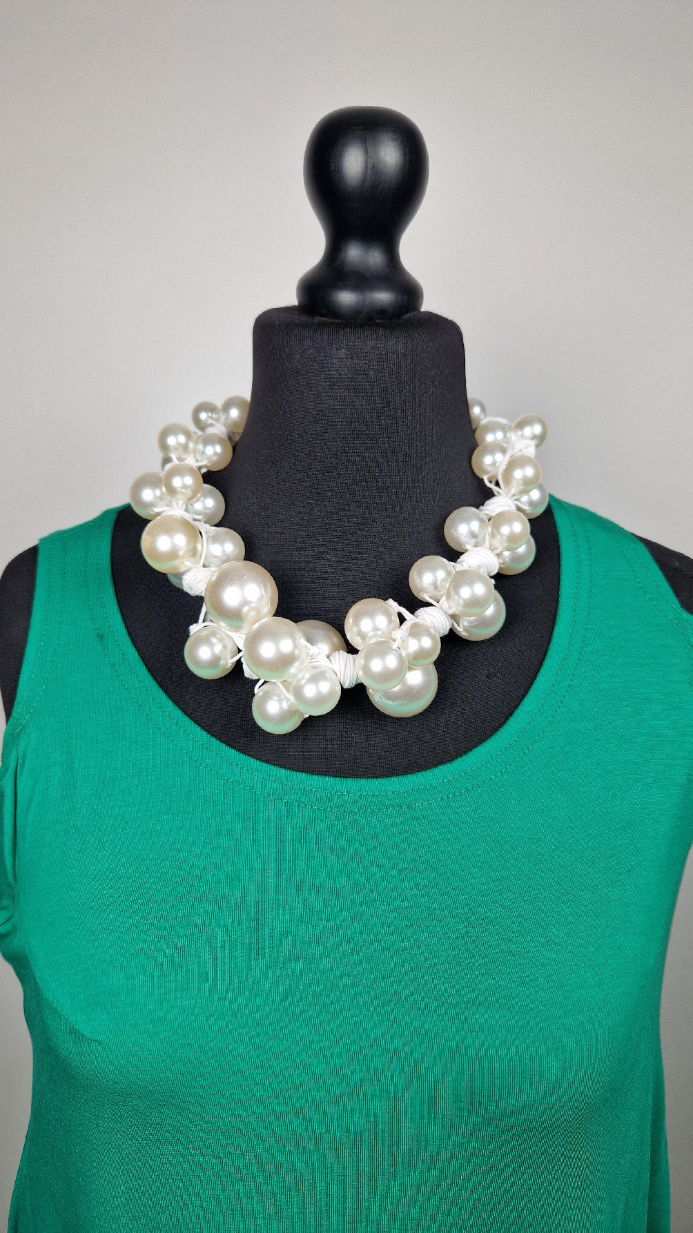 Duży, pasujący do każdej wyjściowej sukienki, idealny do małej czarnej, ale również do jeansów i białej koszuli czy T-shirtu, do lnianego poncza…Perły zrobione z żywicy i białego, bawełnianego sznurka.