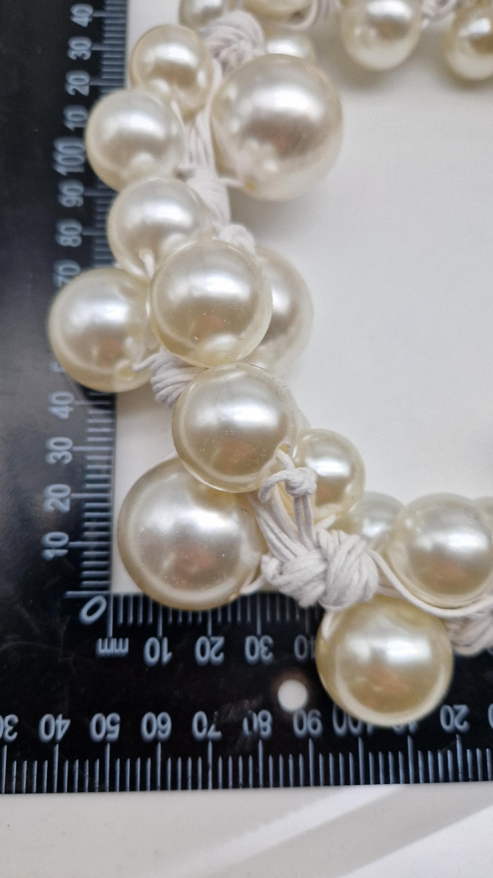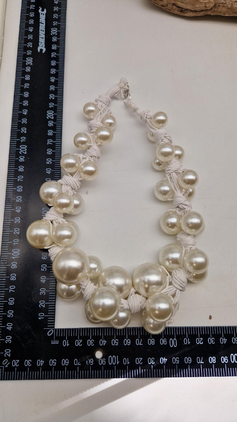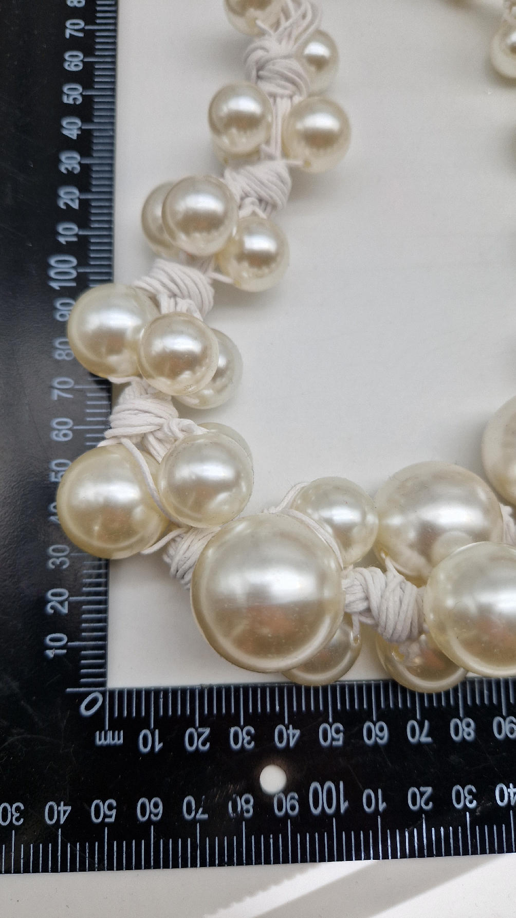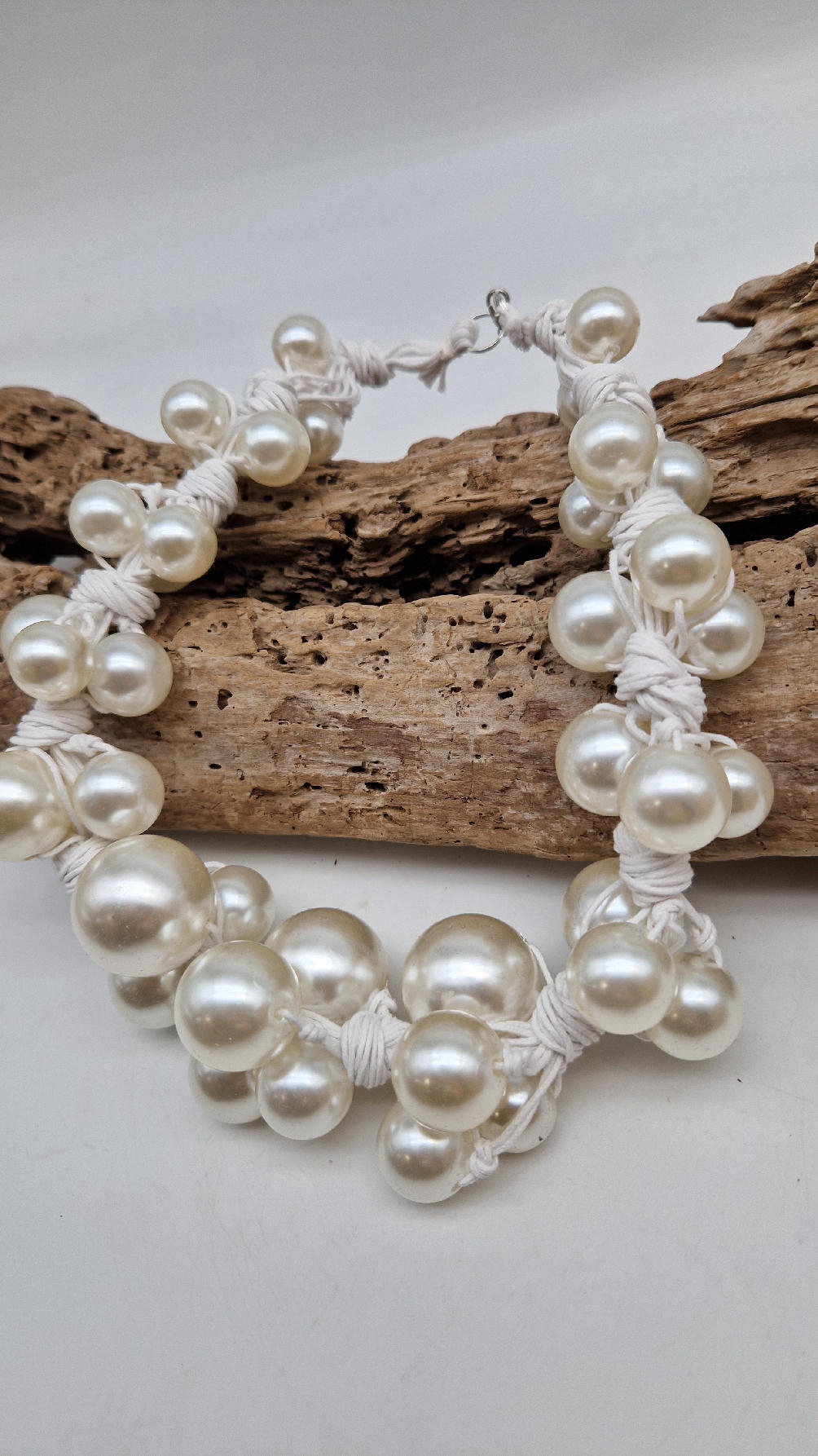 Duży, pasujący do każdej wyjściowej sukienki, idealny do małej czarnej, ale również do jeansów i białej koszuli czy T-shirtu, do lnianego poncza…Perły zrobione z żywicy i białego, bawełnianego sznurka.