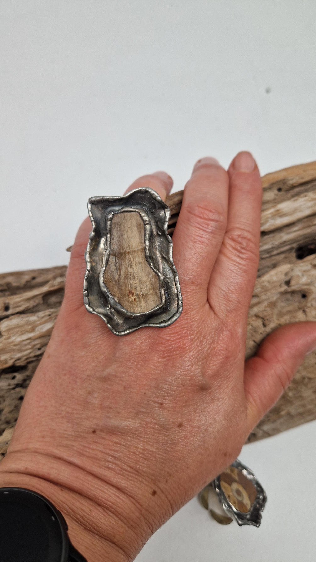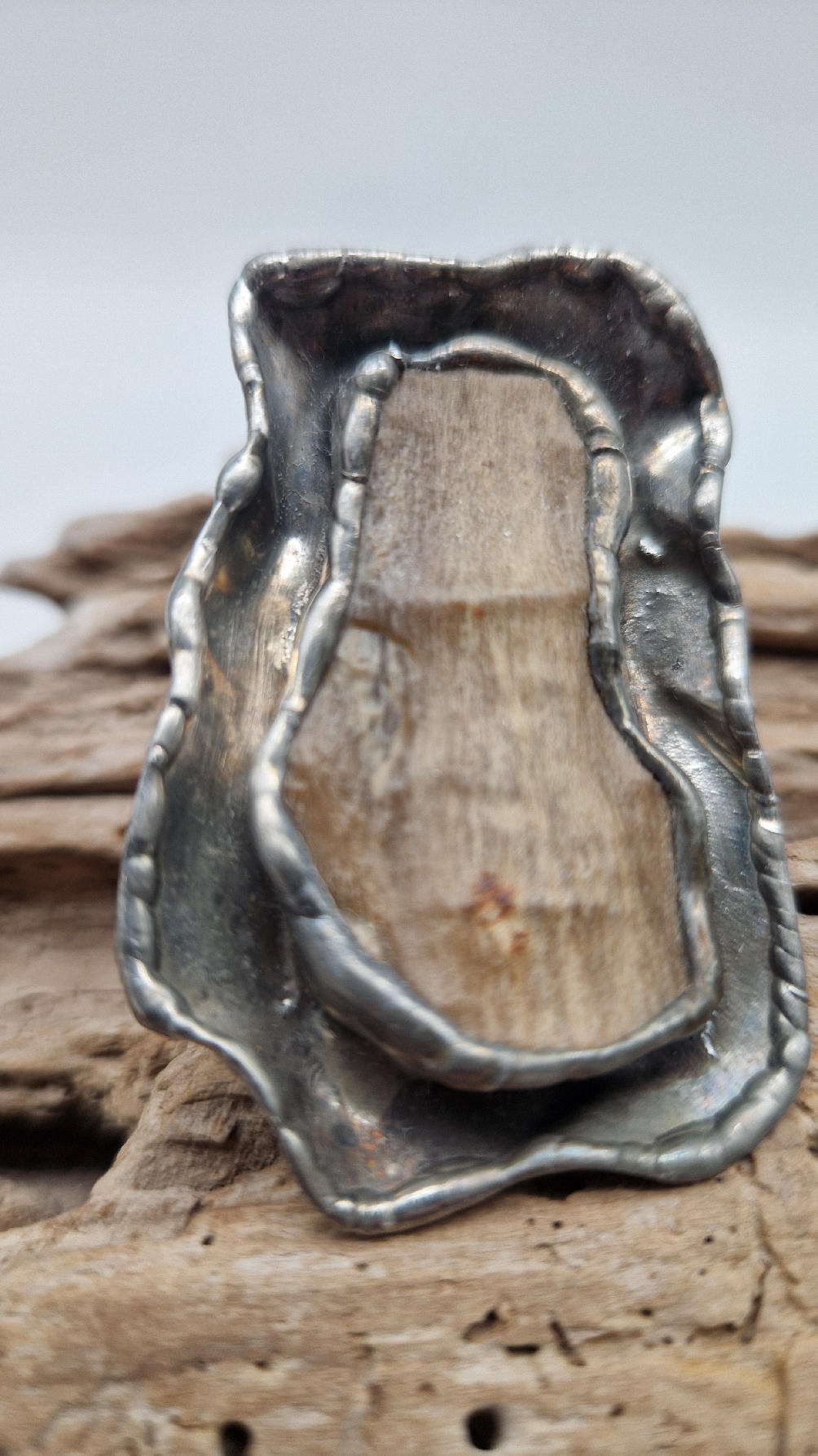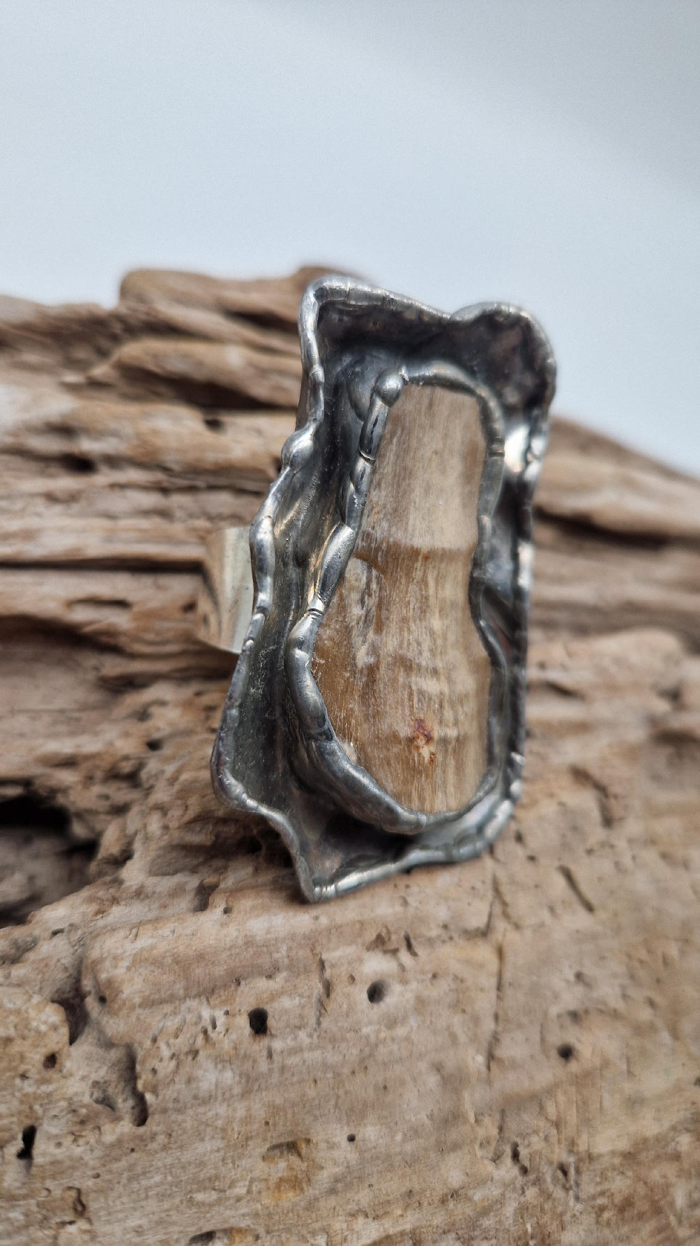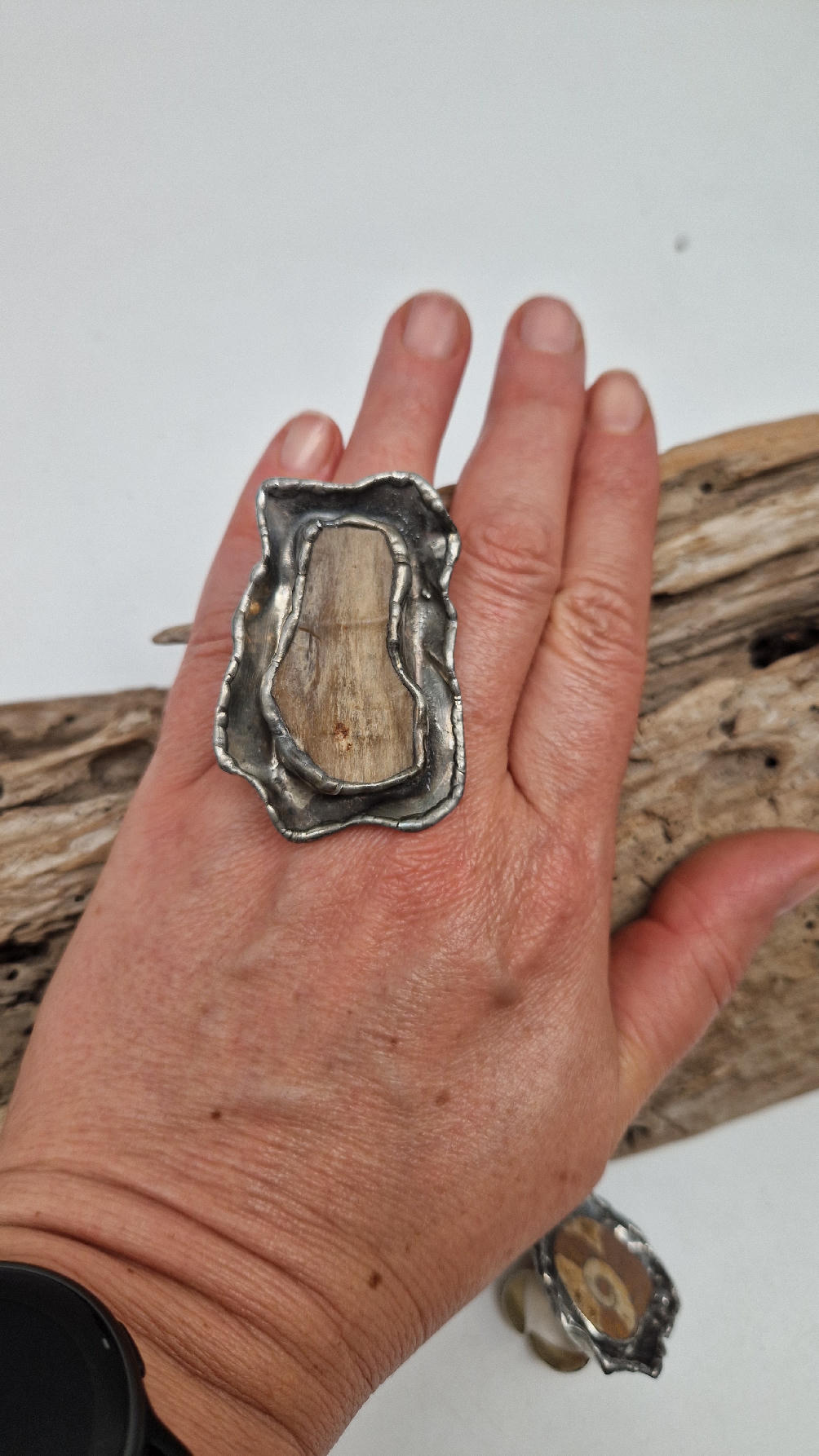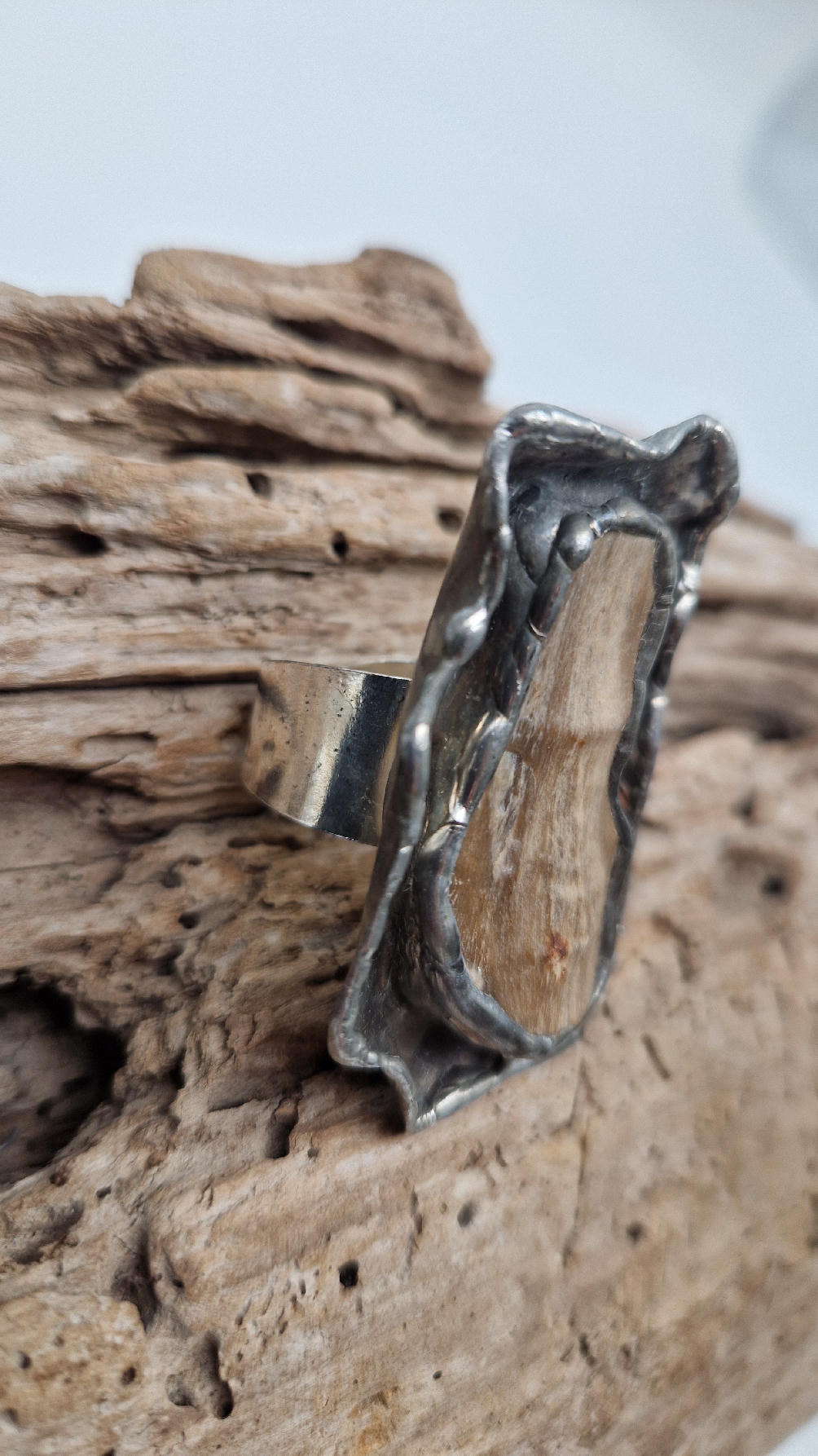 Niezwykle piękny, duży  pierścionek, którego oczkiem jest piękny, nieregularny i nieoszlifowany  kawałek skamieniałego drewna z polskiego roztocza, z urozmaiconym przekrojem, w kolorze cappuccino,  oprawiony w kutą i patynowaną miedź. Piękna metaloplastyka z pięknym kamieniem . Pierścionek ma regulowaną obrączkę, więc pasuje na każdy palec…ale możesz powiesić go na łańcuszku lub rzemieniu, jeśli nie lubisz pierścionków, a podoba Ci się forma i kamień…