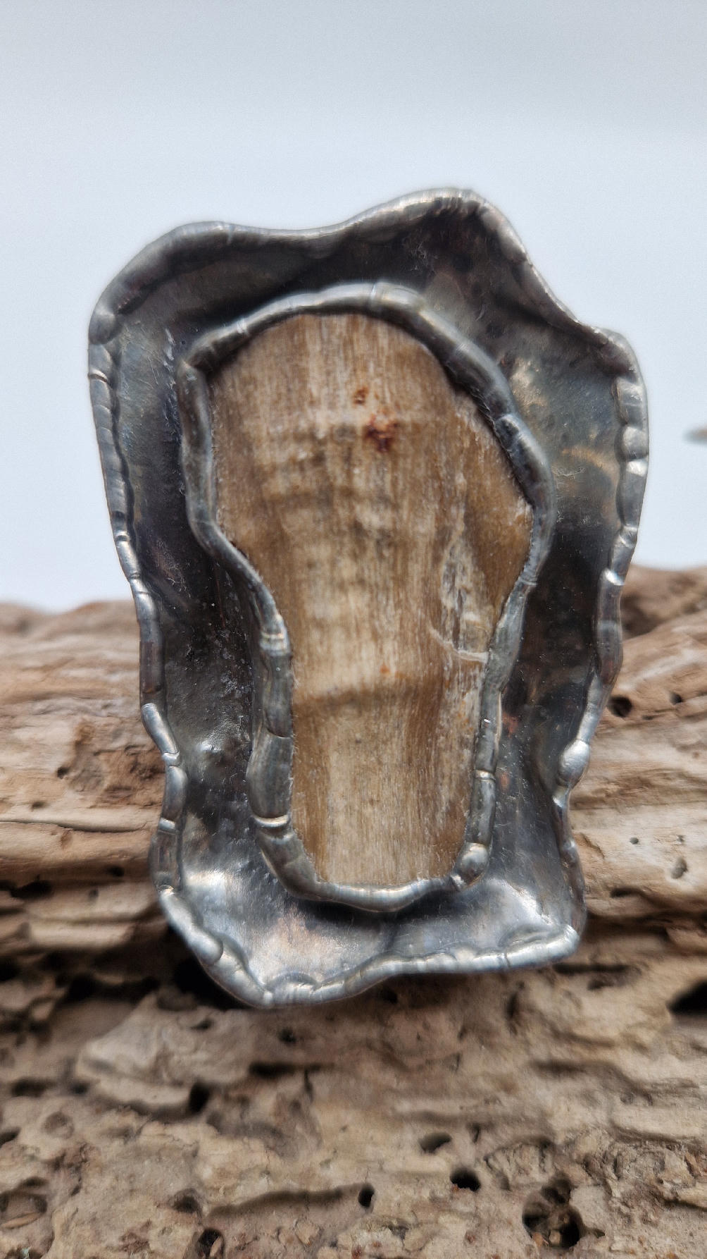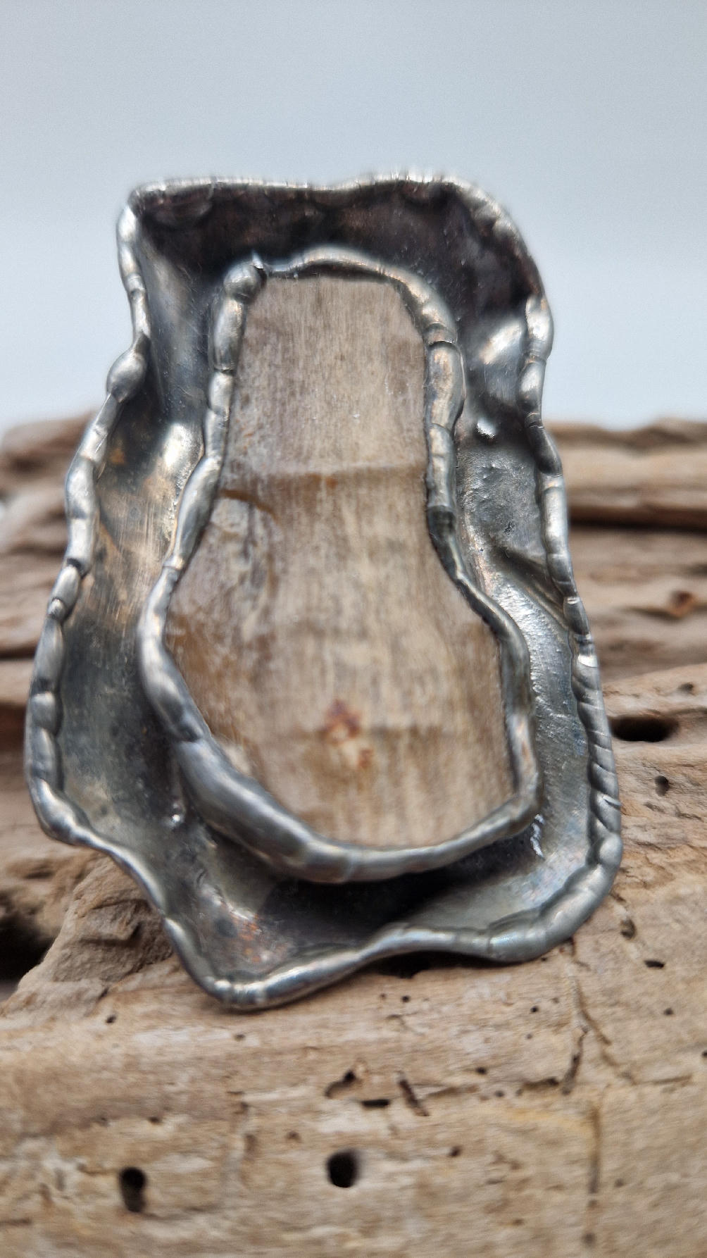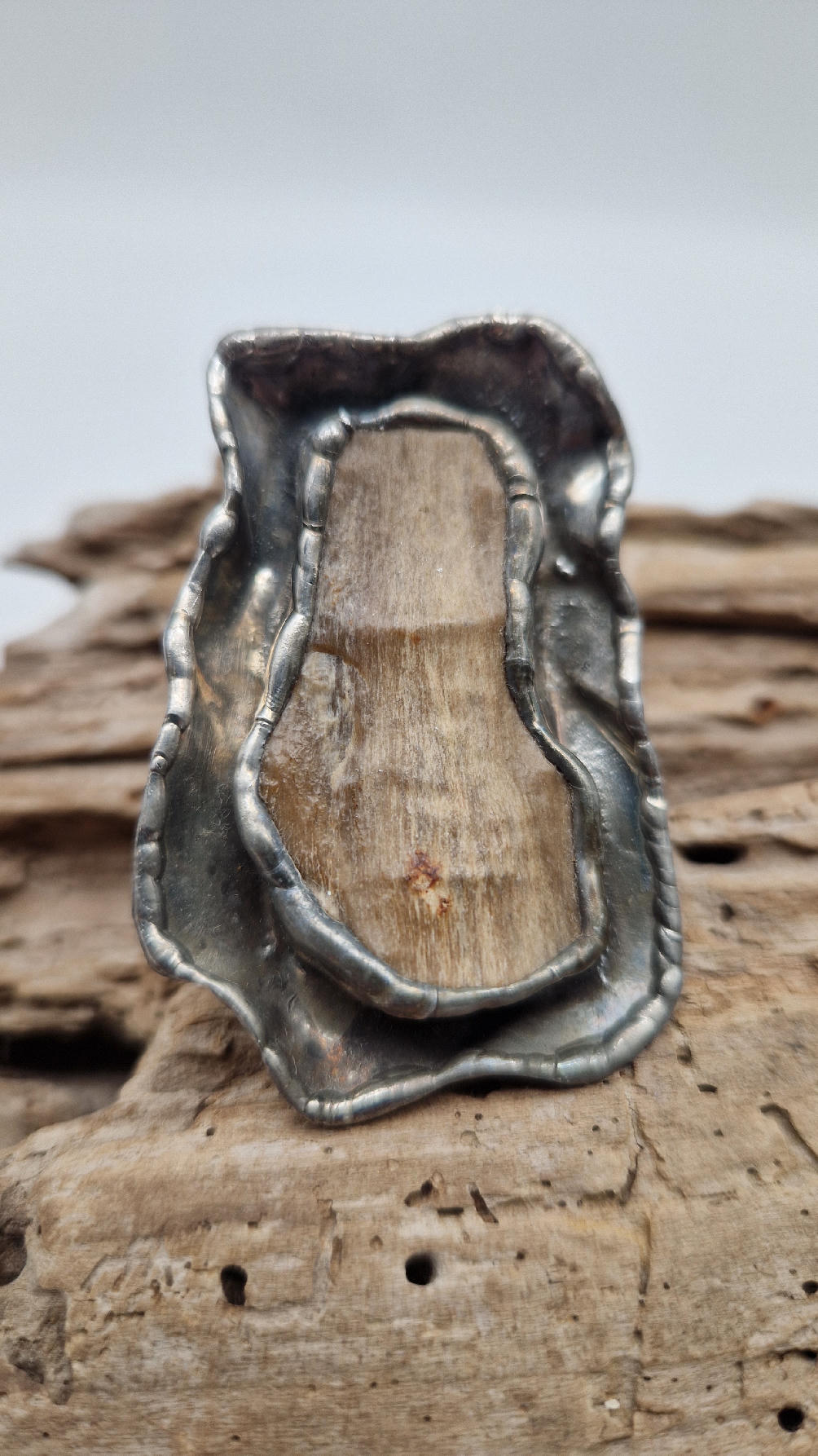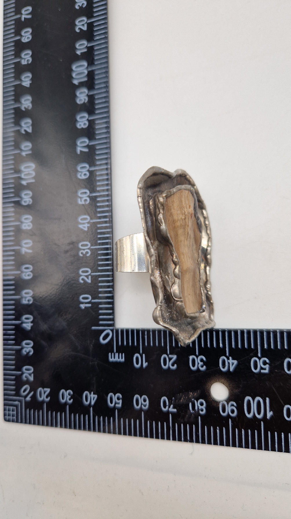 Niezwykle piękny, duży  pierścionek, którego oczkiem jest piękny, nieregularny i nieoszlifowany  kawałek skamieniałego drewna z polskiego roztocza, z urozmaiconym przekrojem, w kolorze cappuccino,  oprawiony w kutą i patynowaną miedź. Piękna metaloplastyka z pięknym kamieniem . Pierścionek ma regulowaną obrączkę, więc pasuje na każdy palec…ale możesz powiesić go na łańcuszku lub rzemieniu, jeśli nie lubisz pierścionków, a podoba Ci się forma i kamień…