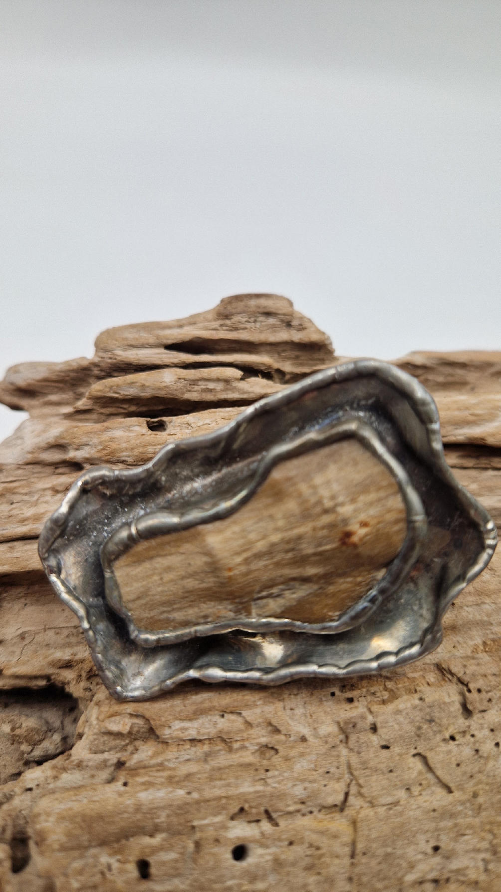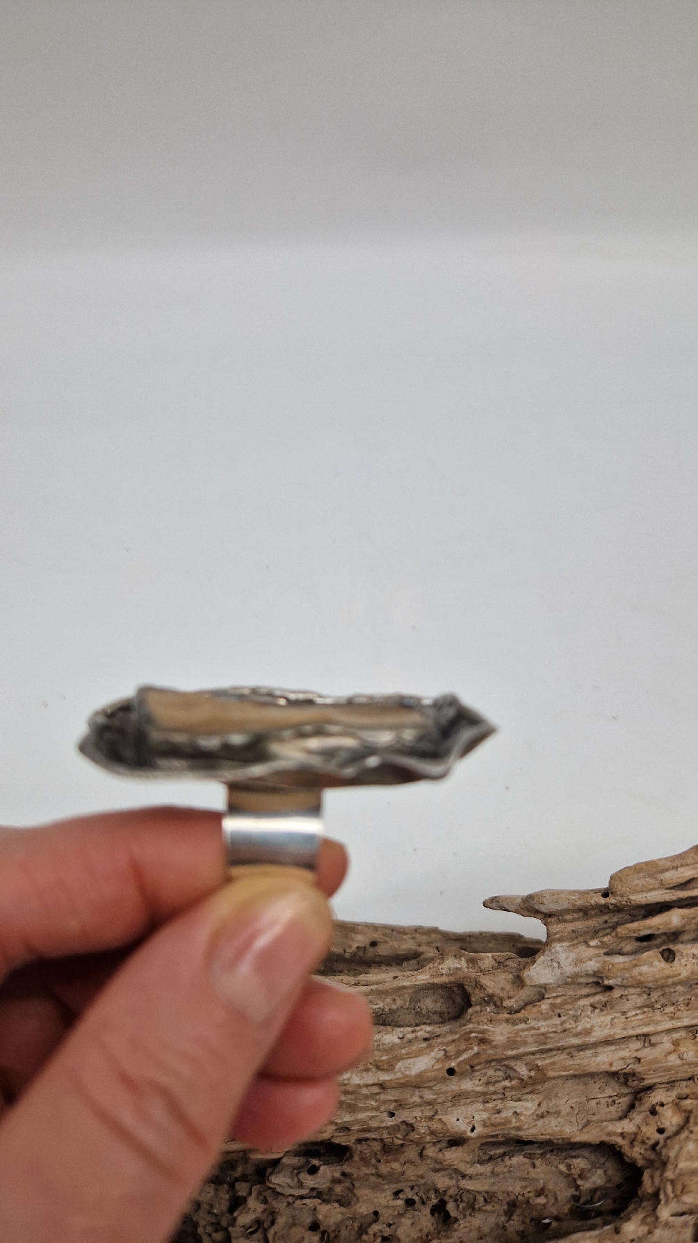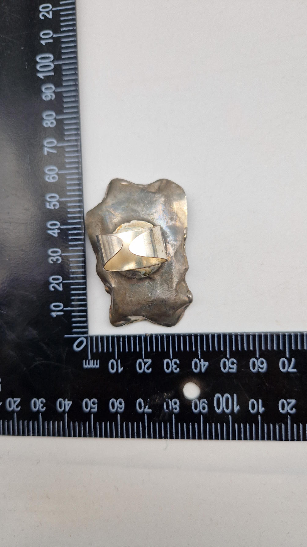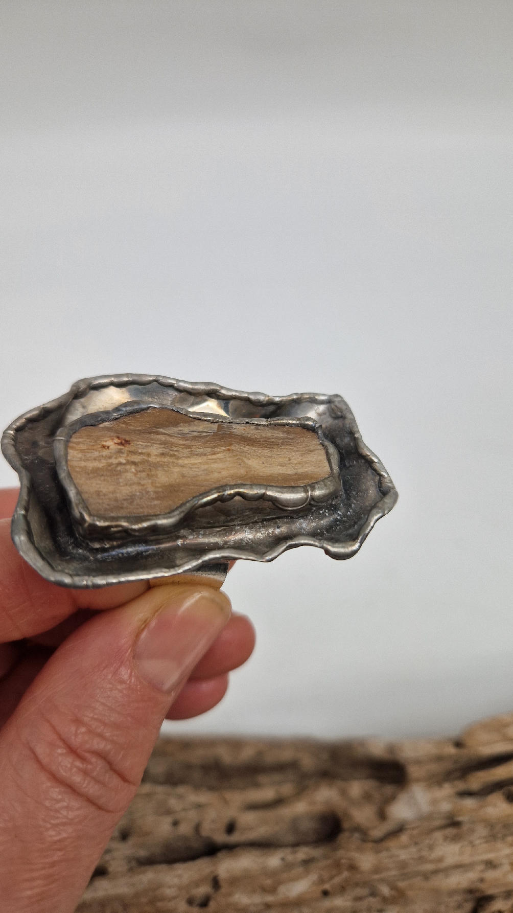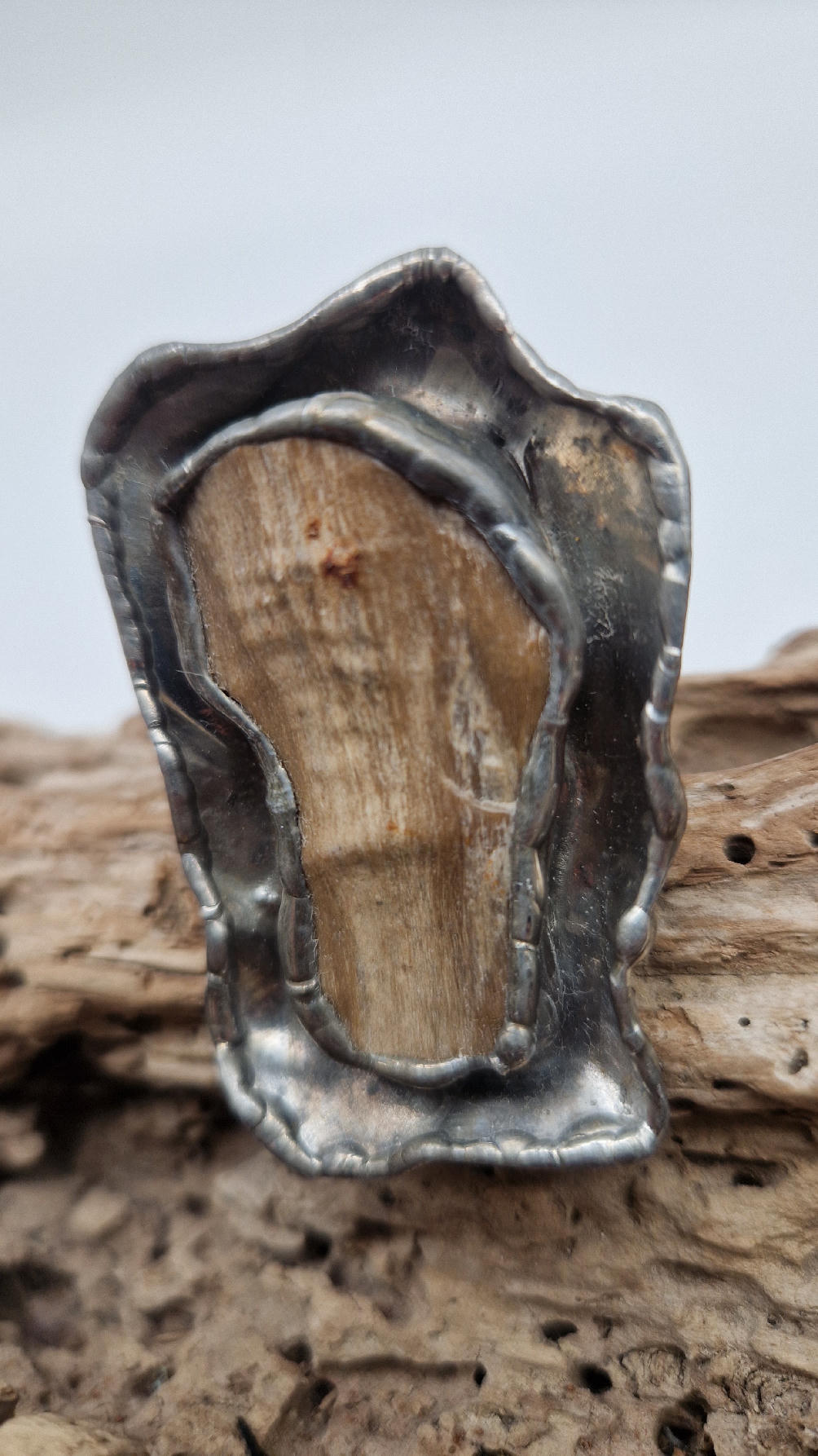 Niezwykle piękny, duży  pierścionek, którego oczkiem jest piękny, nieregularny i nieoszlifowany  kawałek skamieniałego drewna z polskiego roztocza, z urozmaiconym przekrojem, w kolorze cappuccino,  oprawiony w kutą i patynowaną miedź. Piękna metaloplastyka z pięknym kamieniem . Pierścionek ma regulowaną obrączkę, więc pasuje na każdy palec…ale możesz powiesić go na łańcuszku lub rzemieniu, jeśli nie lubisz pierścionków, a podoba Ci się forma i kamień…