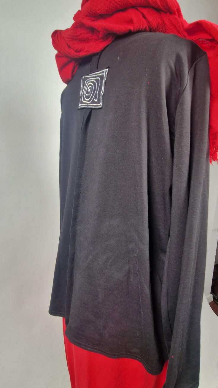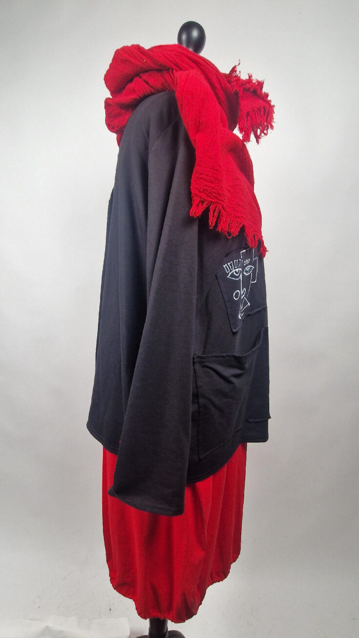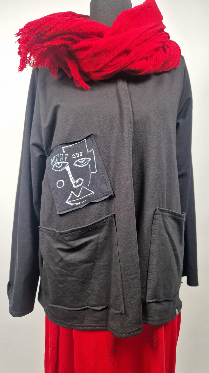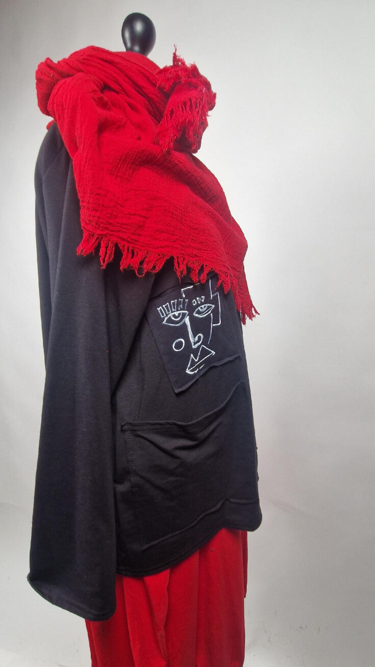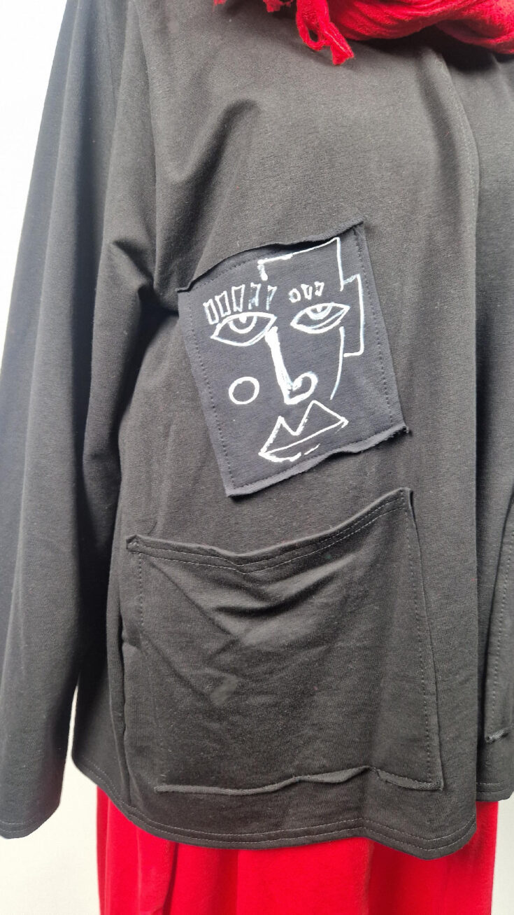 Kardigan uszyty z miękkiej, drapanej bawełny , z ręcznie malowanymi przeze mnie naszywkami z przodu i z tyłu, z asymetrycznymi kieszeniami z skóropodobnej, miękkiej tkaniny, wygodny jak bluza, elegancki i sportowy jednocześnie, bardzo zgrabny i oryginalny COŚ, taki trochę otulak, ale bez kaptura i krótki, taki…totalnie uniwersalny, ma 120 cm w biuście, ale stworzyłam go jako narzutkę bezrozmiarową, taką dla wszystkich.