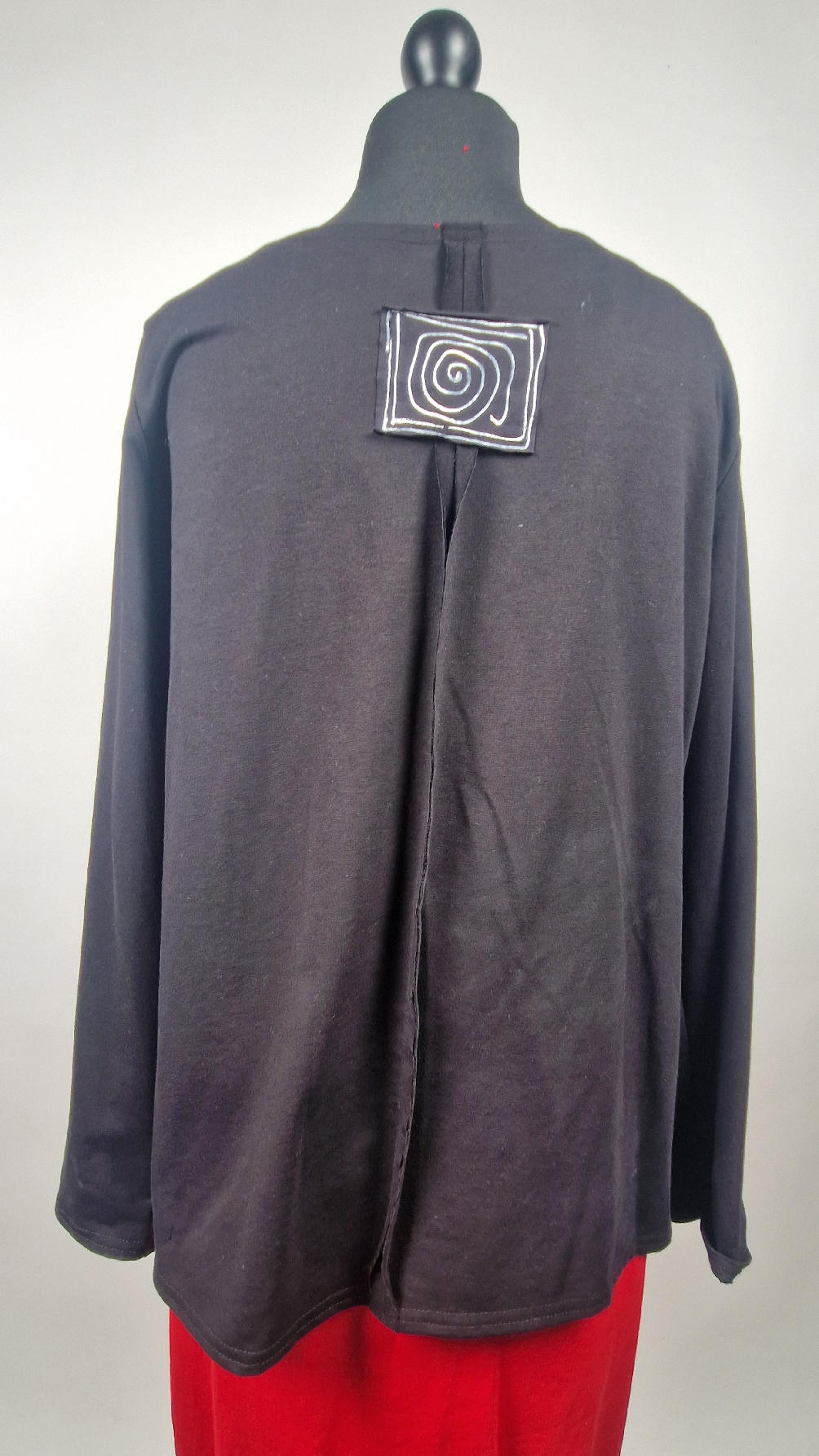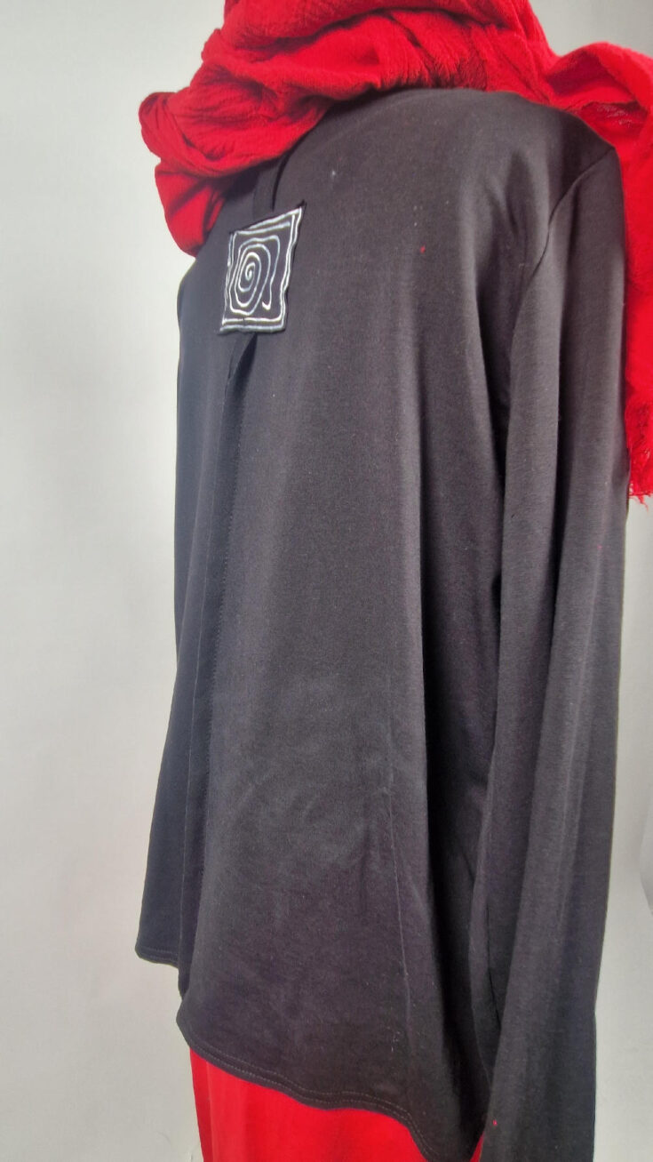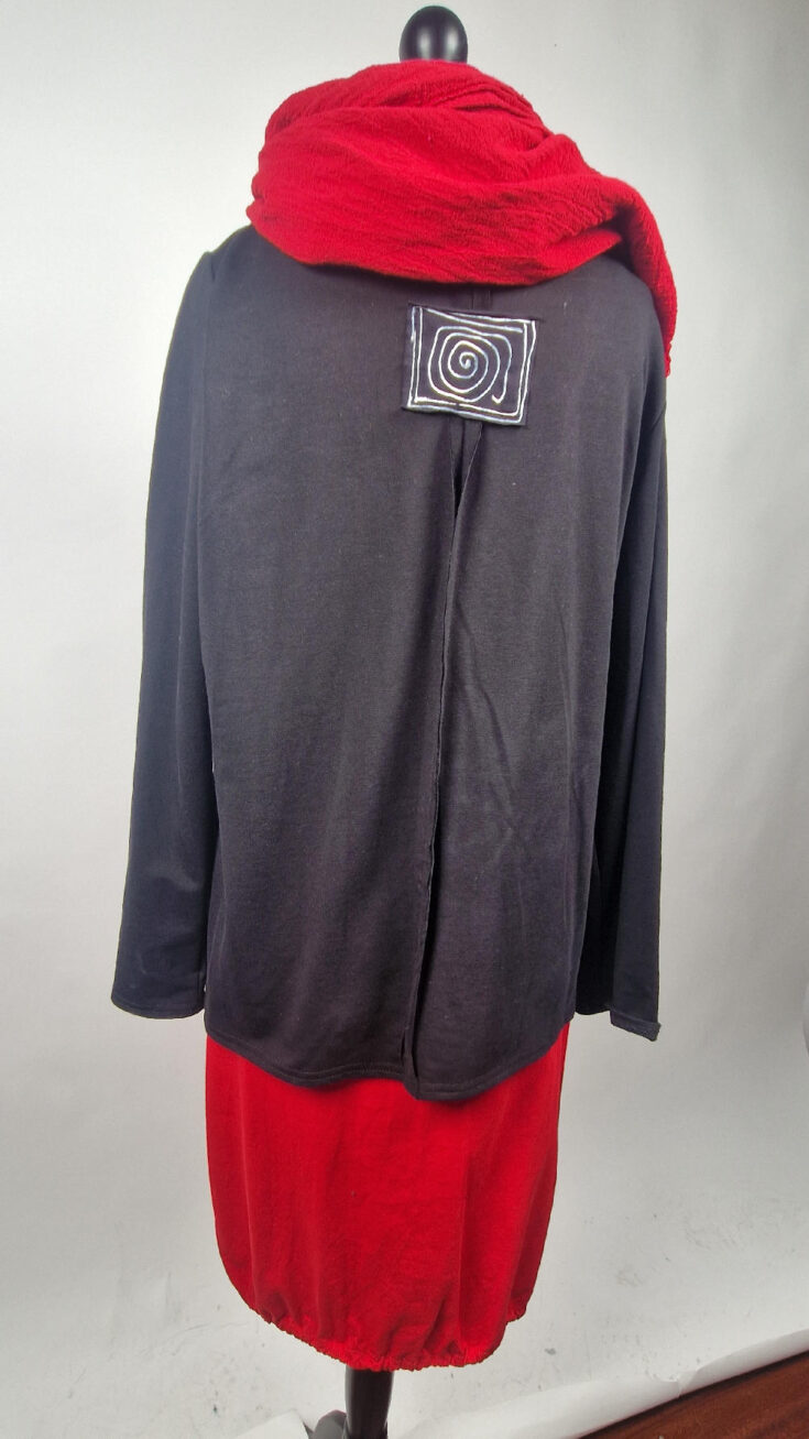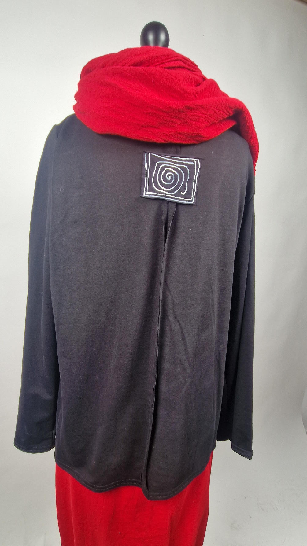 Kardigan uszyty z miękkiej, drapanej bawełny , z ręcznie malowanymi przeze mnie naszywkami z przodu i z tyłu, z asymetrycznymi kieszeniami z skóropodobnej, miękkiej tkaniny, wygodny jak bluza, elegancki i sportowy jednocześnie, bardzo zgrabny i oryginalny COŚ, taki trochę otulak, ale bez kaptura i krótki, taki…totalnie uniwersalny, ma 120 cm w biuście, ale stworzyłam go jako narzutkę bezrozmiarową, taką dla wszystkich.