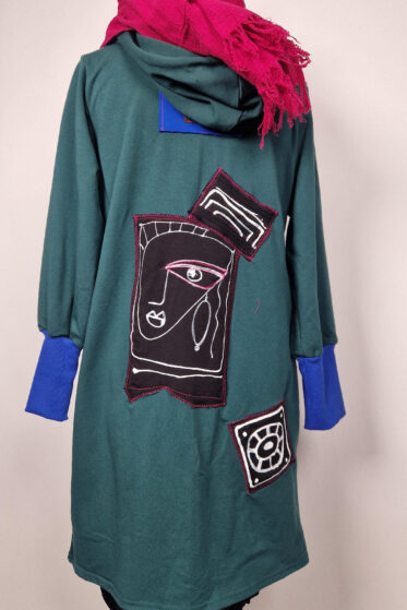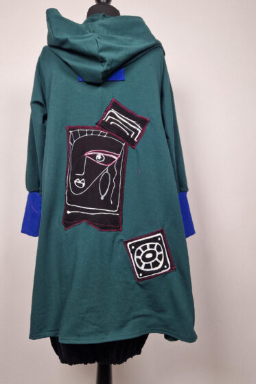 Ręcznie malowany, uszyty z miękkiej bawełny z pętelką, wygodny jak bluza, elegancki i sportowy jednocześnie, bardzo zgrabny i oryginalny COŚ, z dwoma dużymi kieszeniami, taki trochę otulak, ale bez kaptura i krótki, taki…totalnie uniwersalny, ma 120 cm w biuście, ale stworzyłam go jako narzutkę bezrozmiarową, taką dla wszystkich.