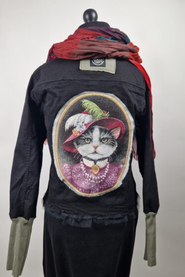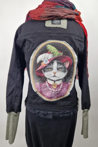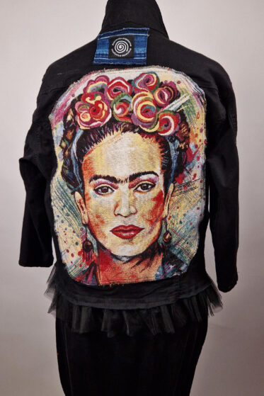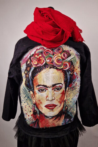 Obłędna zupełnie niezwyczajna katana z elastycznego jeansu, którego główną dekoracją jest gobelinowa aplikacja z wizerunkiem Fridy Kahlo. Katana jest pozbawiona paska na dole , za to ma falbankę z czarnego tiulu, tiulem są też wykończone rękawy…żeby bylo wygodnie i oczywiście oryginalnie…, które sprawią, że pokochasz swoją Fridkę od pierwszego spojrzenia