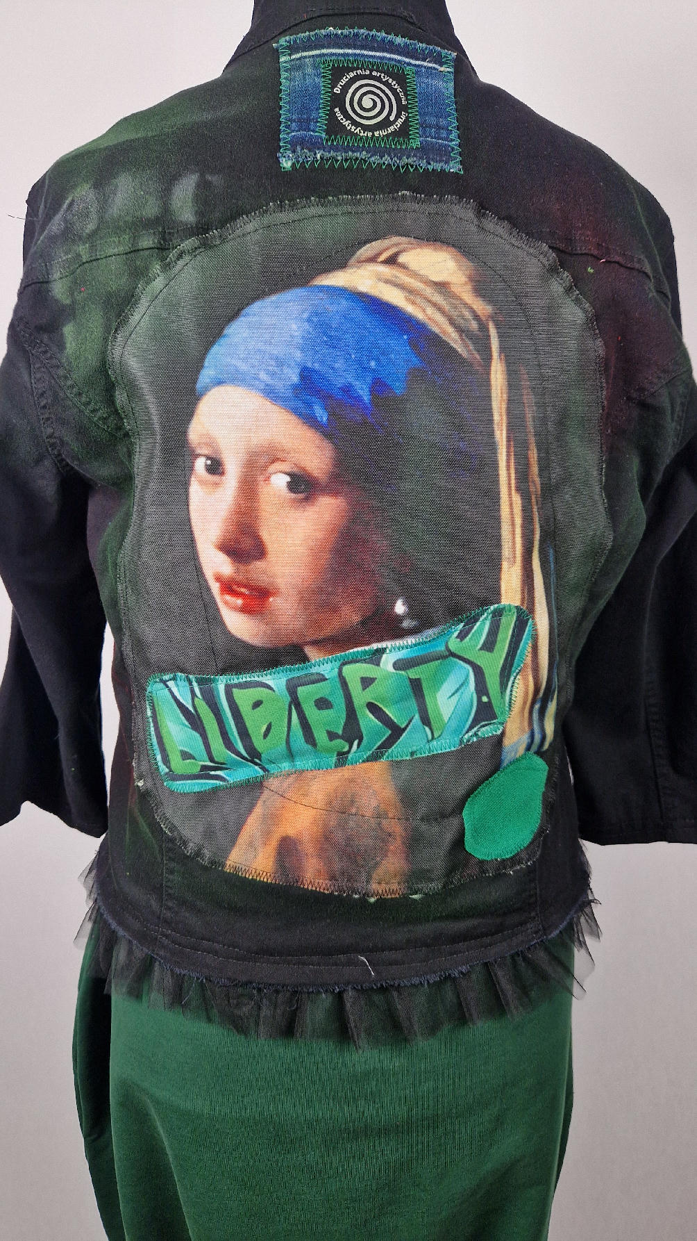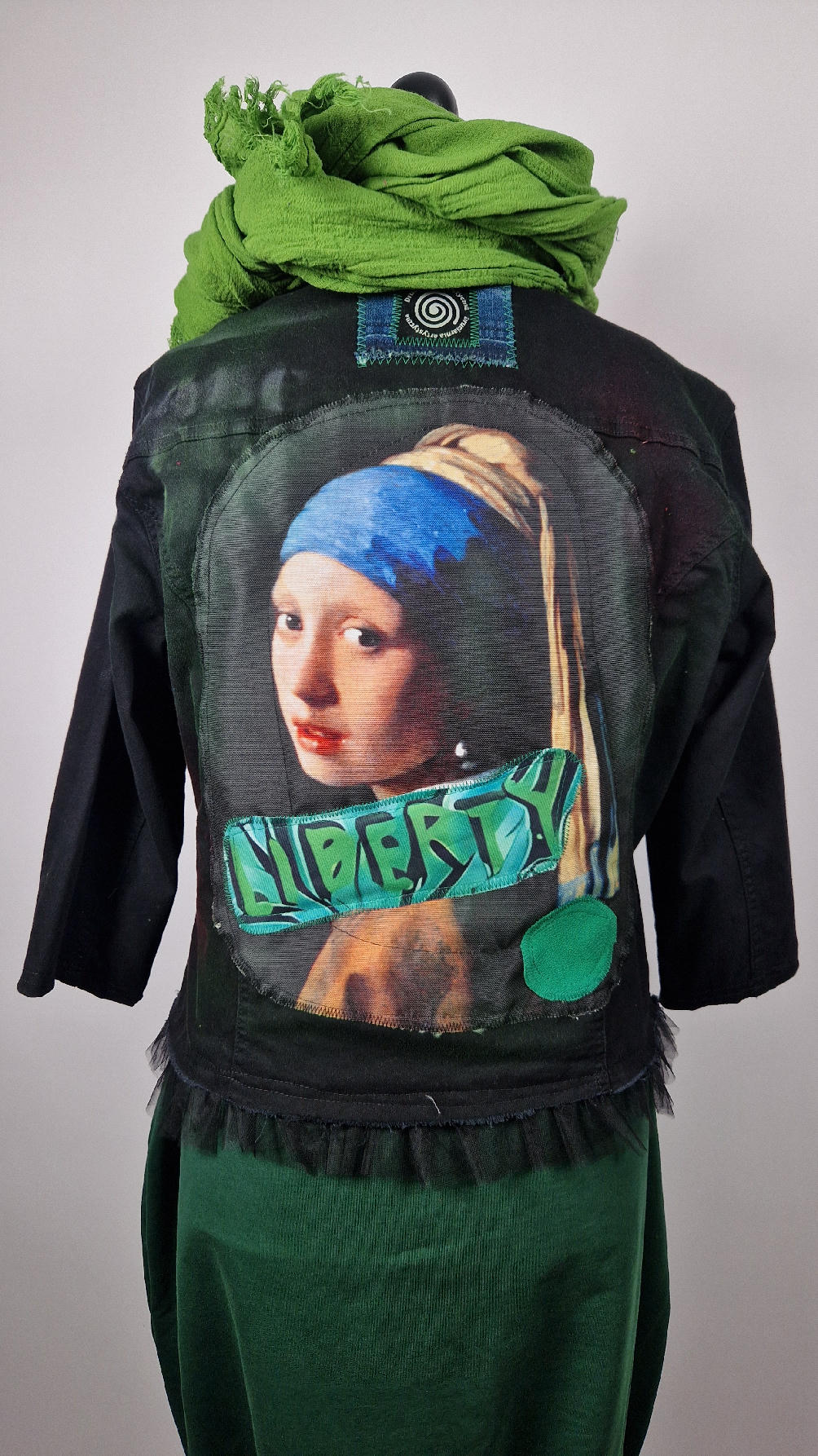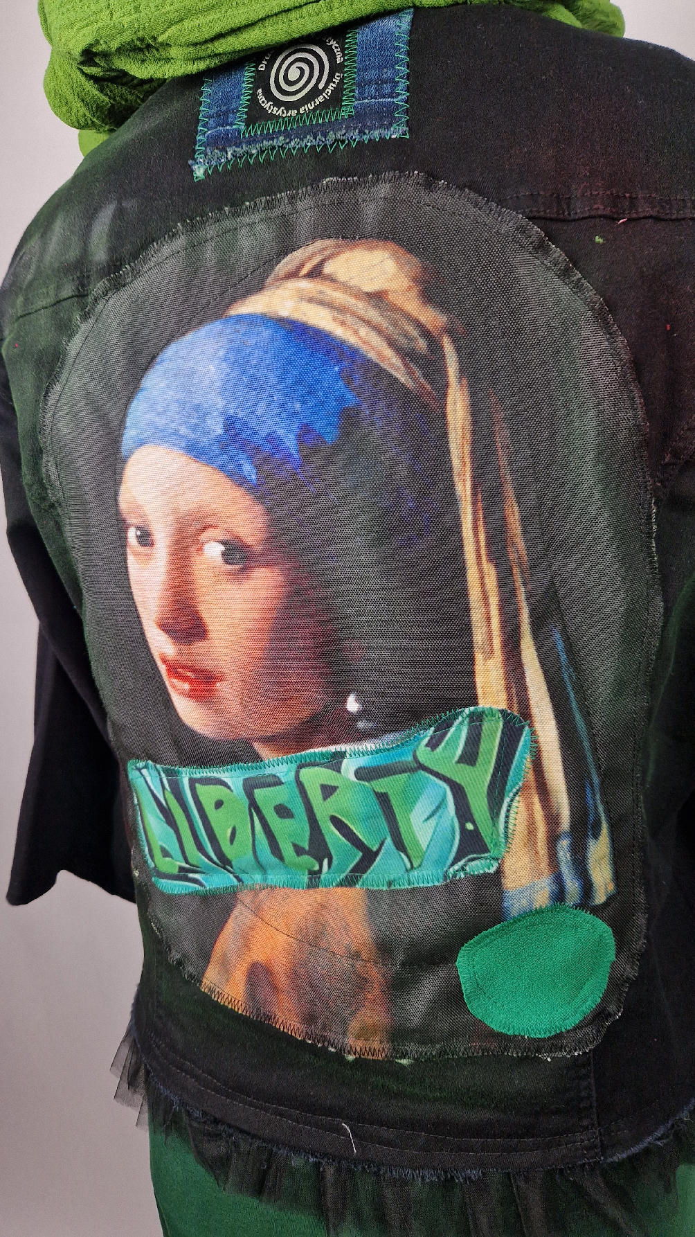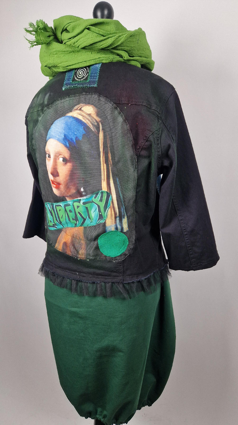 Katana z elastycznego , czarnego jeansu, którego główną dekoracją jest dziewczyna z perłą, ale z napisami, taka po mojemu.. Katana jest pomalowana ciut na zielono, pozbawiona jest paska na dole , za to ma falbankę z czarnego tiulu, ..żeby bylo wygodnie i oczywiście oryginalnie…, Ma też rękawy 3/4, żeby wystawić mankiety od bluzki, albo założyć sobie zarękawki, takie do koloru szalika…