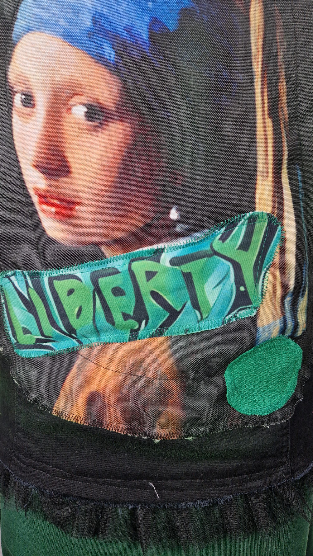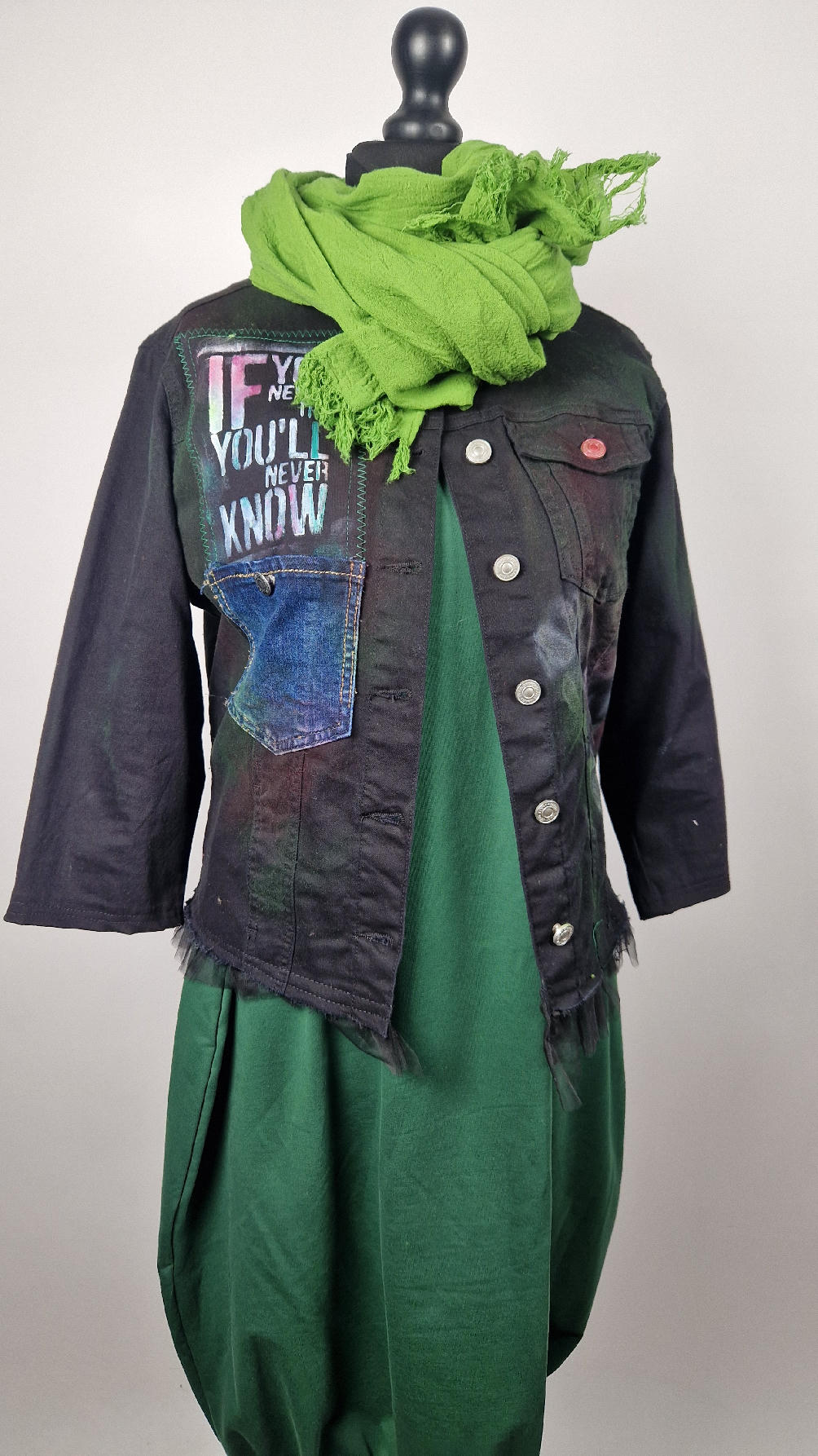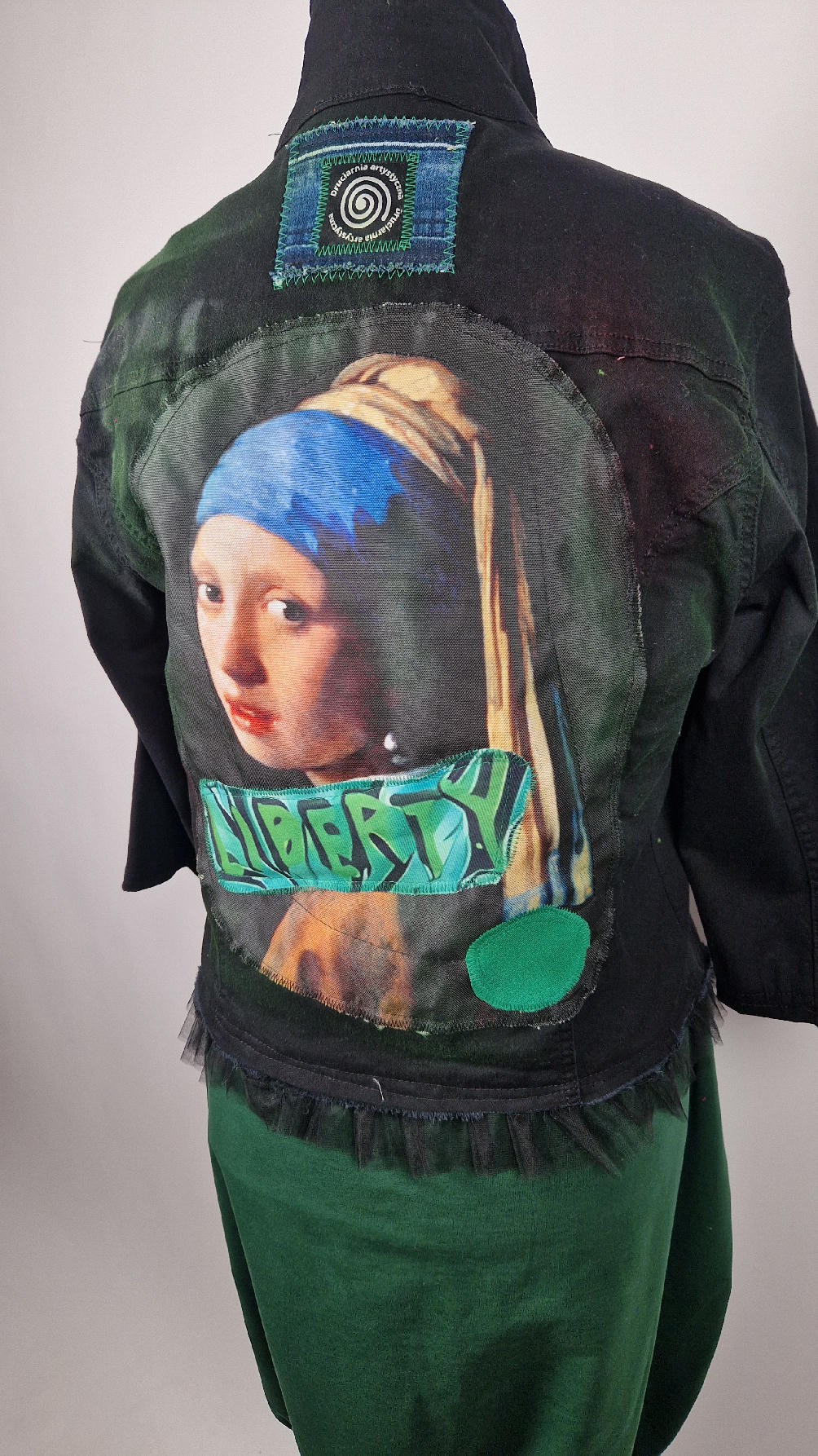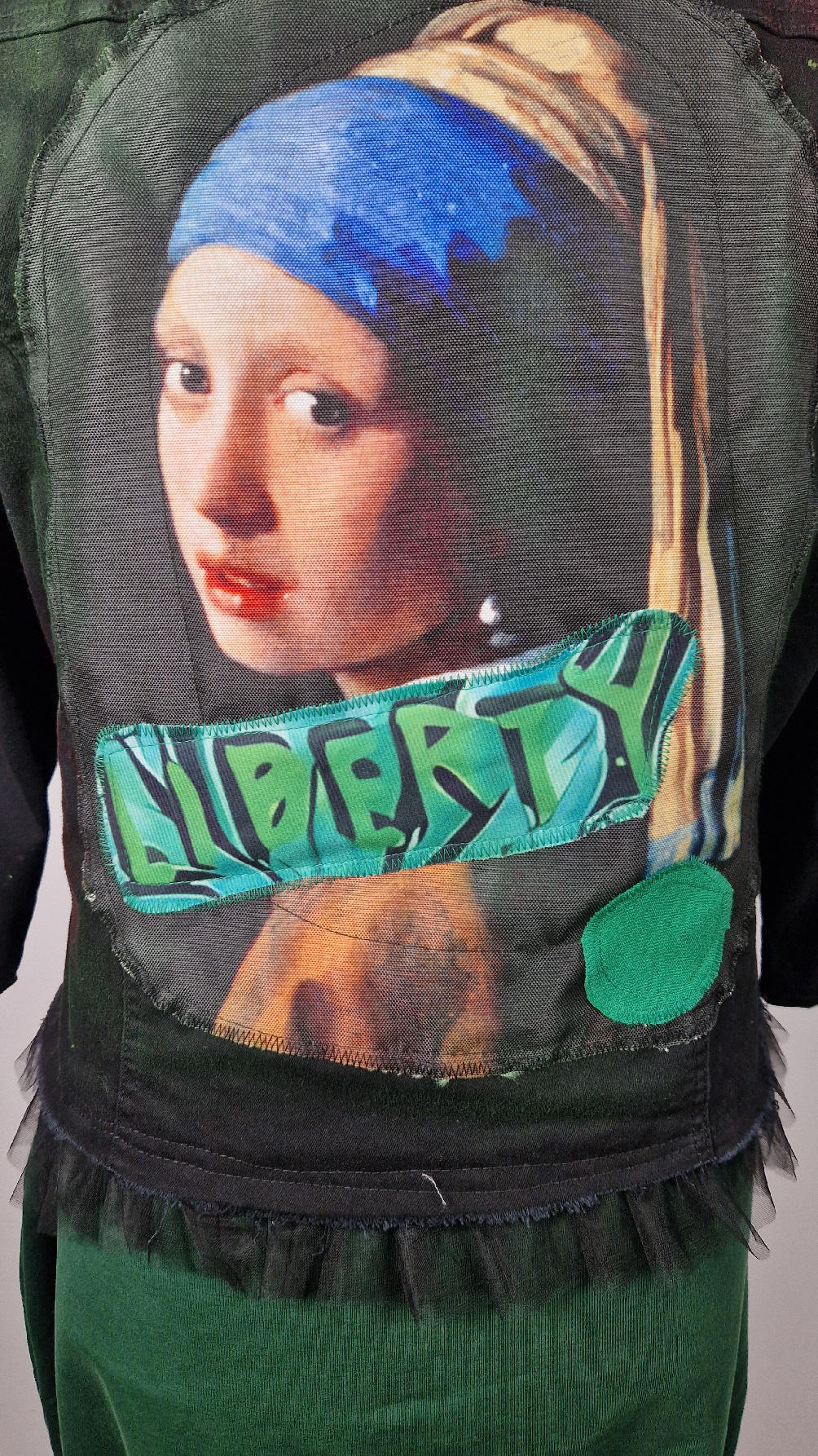 Katana z elastycznego , czarnego jeansu, którego główną dekoracją jest dziewczyna z perłą, ale z napisami, taka po mojemu.. Katana jest pomalowana ciut na zielono, pozbawiona jest paska na dole , za to ma falbankę z czarnego tiulu, ..żeby bylo wygodnie i oczywiście oryginalnie…, Ma też rękawy 3/4, żeby wystawić mankiety od bluzki, albo założyć sobie zarękawki, takie do koloru szalika…