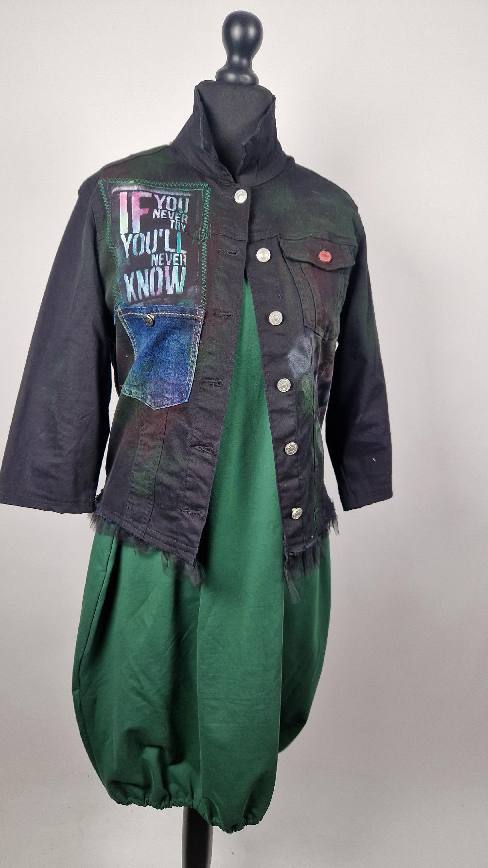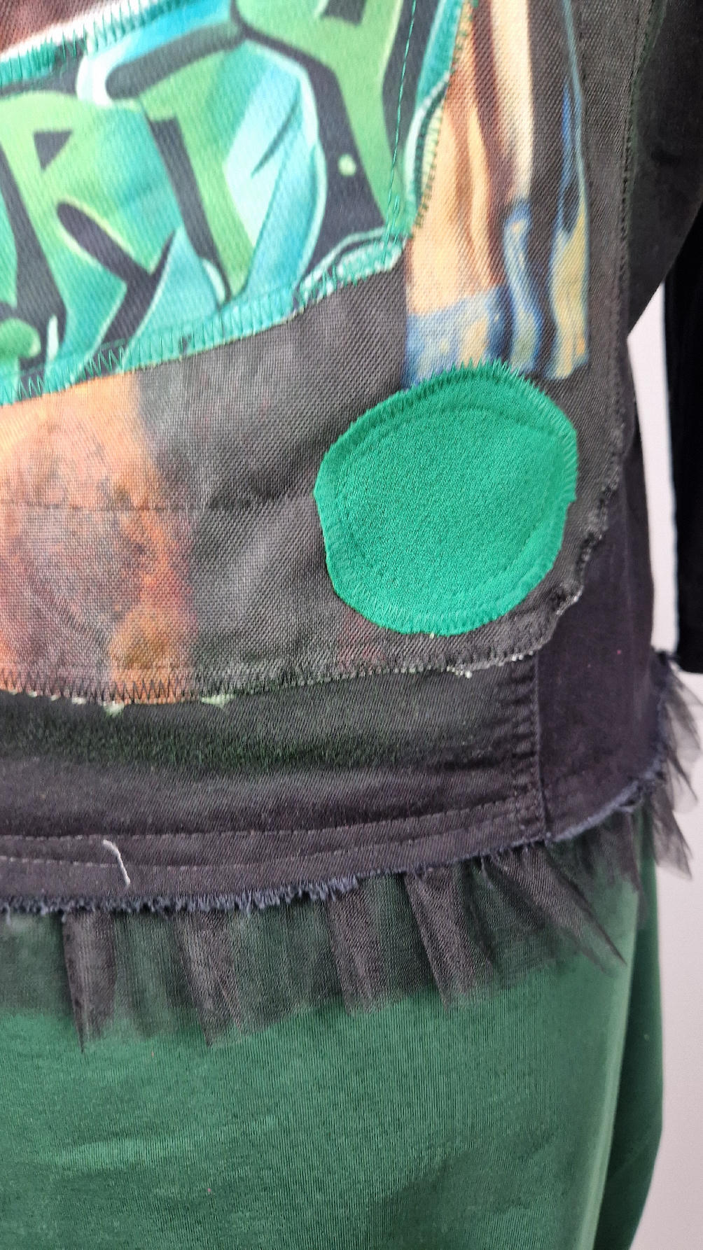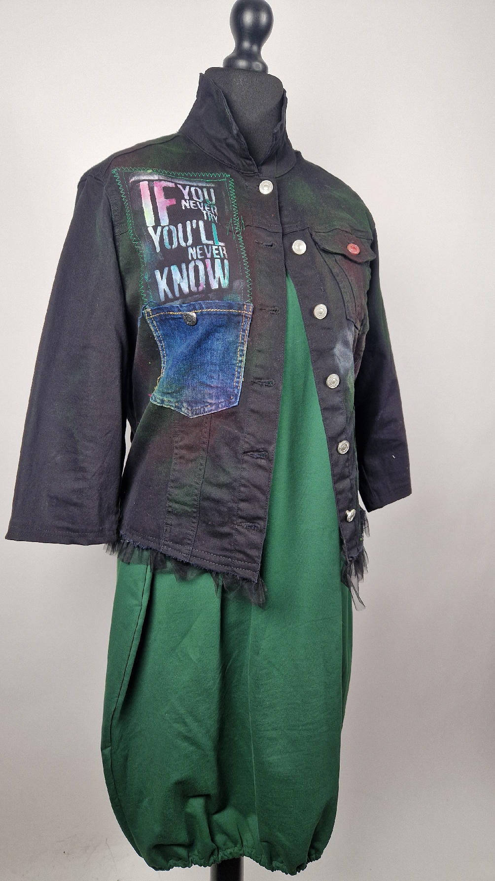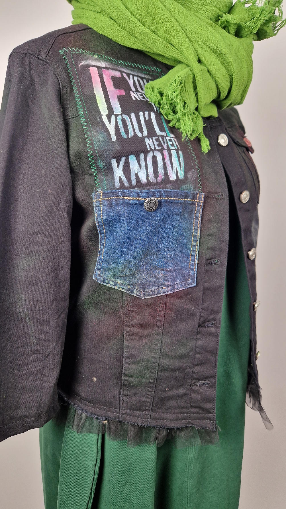 Katana z elastycznego , czarnego jeansu, którego główną dekoracją jest dziewczyna z perłą, ale z napisami, taka po mojemu.. Katana jest pomalowana ciut na zielono, pozbawiona jest paska na dole , za to ma falbankę z czarnego tiulu, ..żeby bylo wygodnie i oczywiście oryginalnie…, Ma też rękawy 3/4, żeby wystawić mankiety od bluzki, albo założyć sobie zarękawki, takie do koloru szalika…