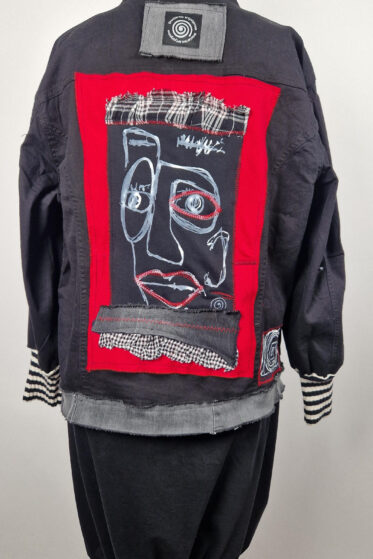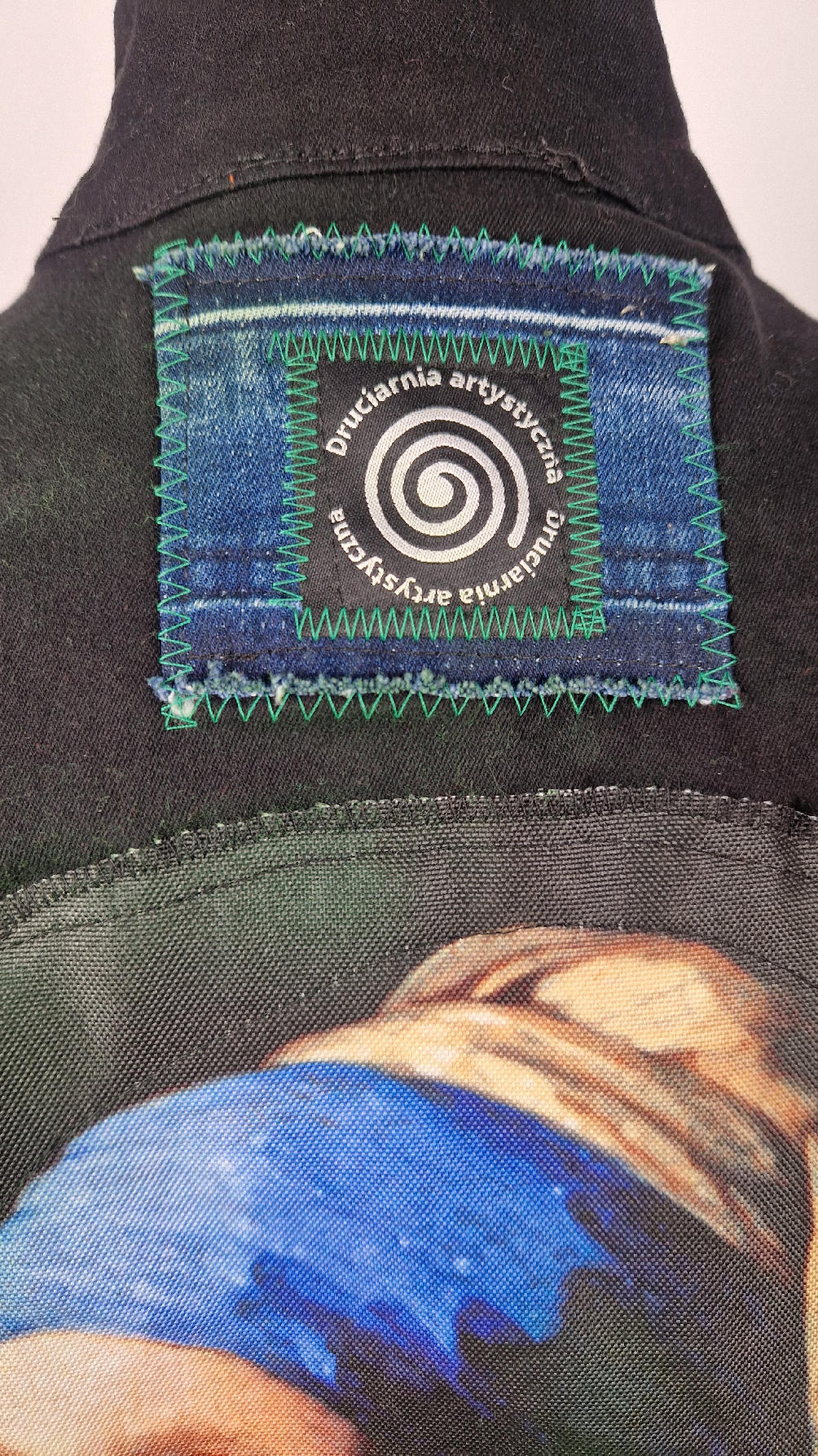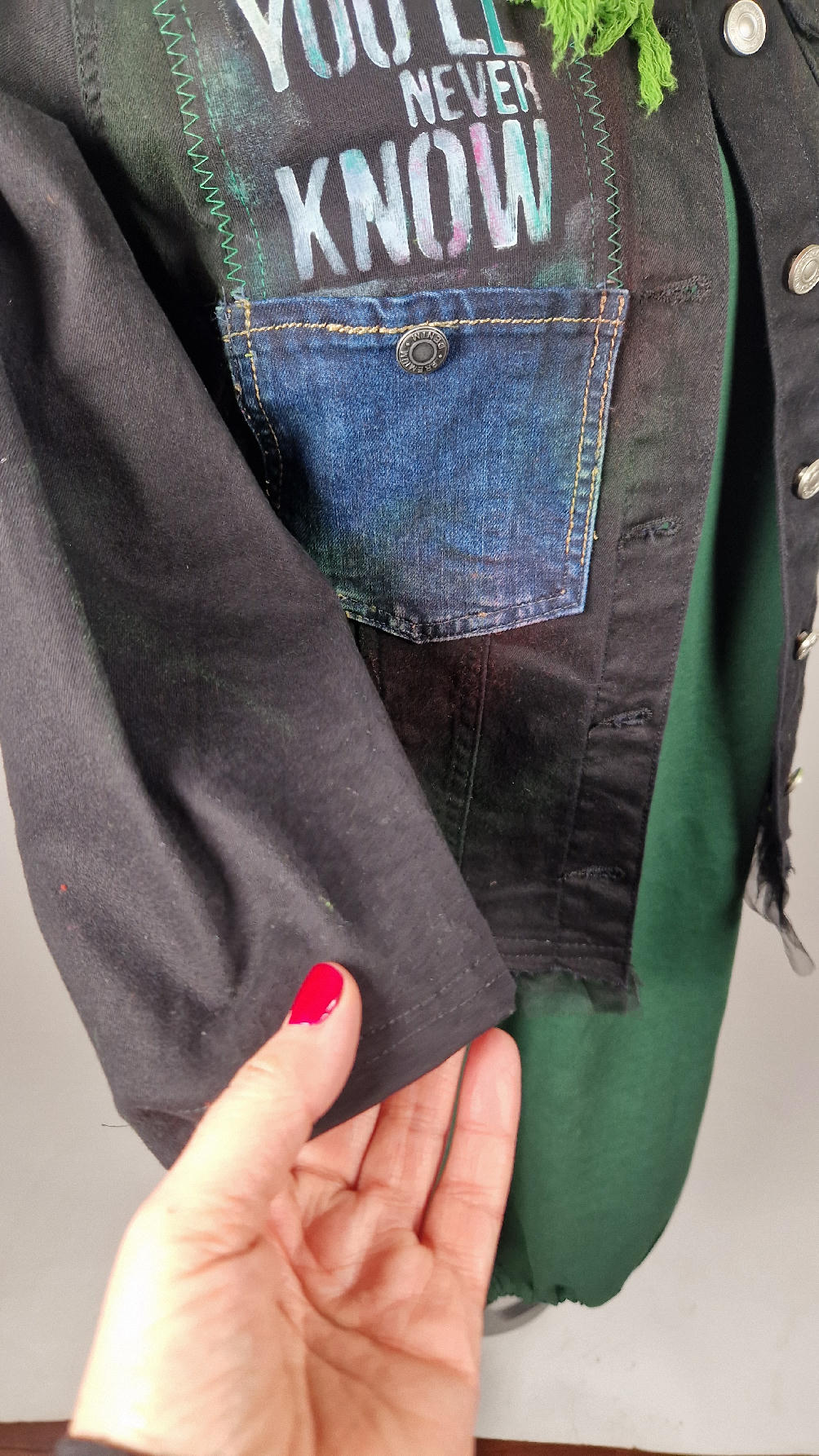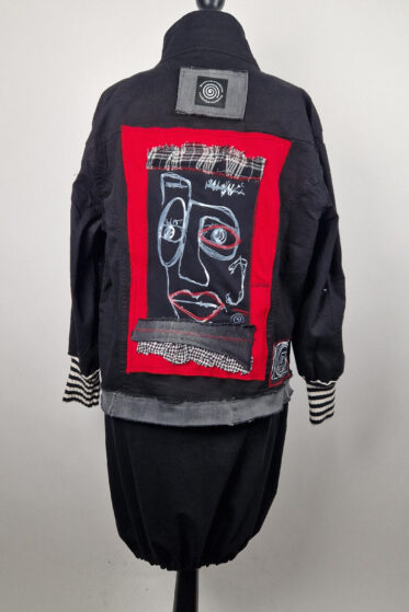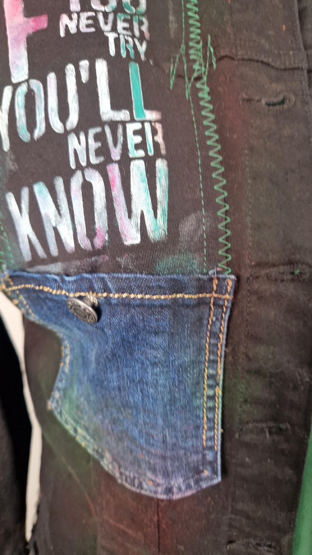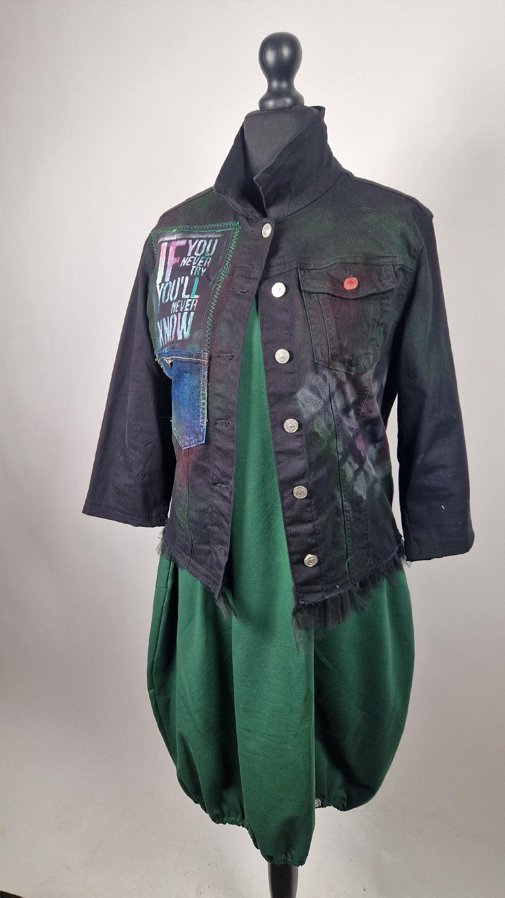 Katana z elastycznego , czarnego jeansu, którego główną dekoracją jest dziewczyna z perłą, ale z napisami, taka po mojemu.. Katana jest pomalowana ciut na zielono, pozbawiona jest paska na dole , za to ma falbankę z czarnego tiulu, ..żeby bylo wygodnie i oczywiście oryginalnie…, Ma też rękawy 3/4, żeby wystawić mankiety od bluzki, albo założyć sobie zarękawki, takie do koloru szalika…