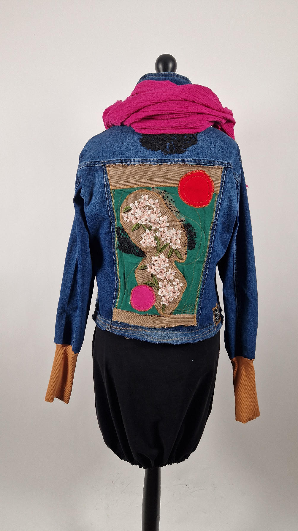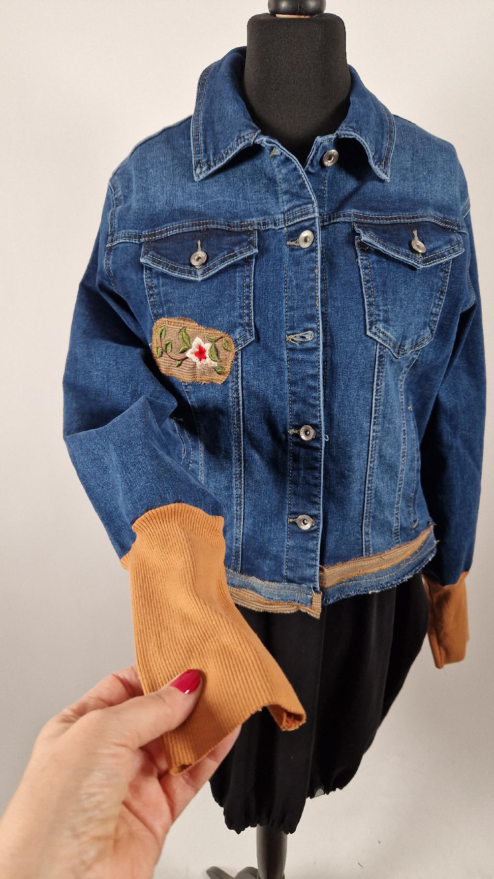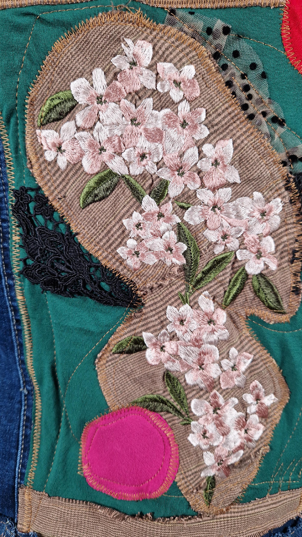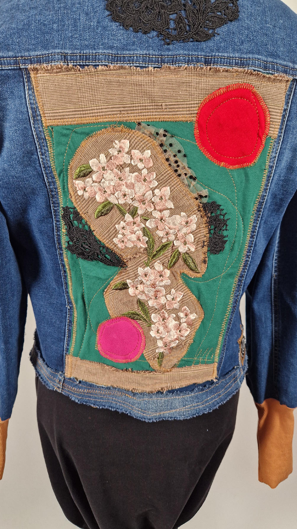 Piękna megakolorowa katana z unikatowym kolażem tkanin na plecach, mocna zieleń, pięknie współgra z ciemnym jeansem, kratka, haftowane kwiatki, koronki, gipiura, do tego jeansowe wykończenie i kropki…, miodowe mankiety ,przeszycia i wstawki…śliczna, wyjątkowa, wygodna, bo ze streczem, jedna, jedyna , niepowtarzalna!