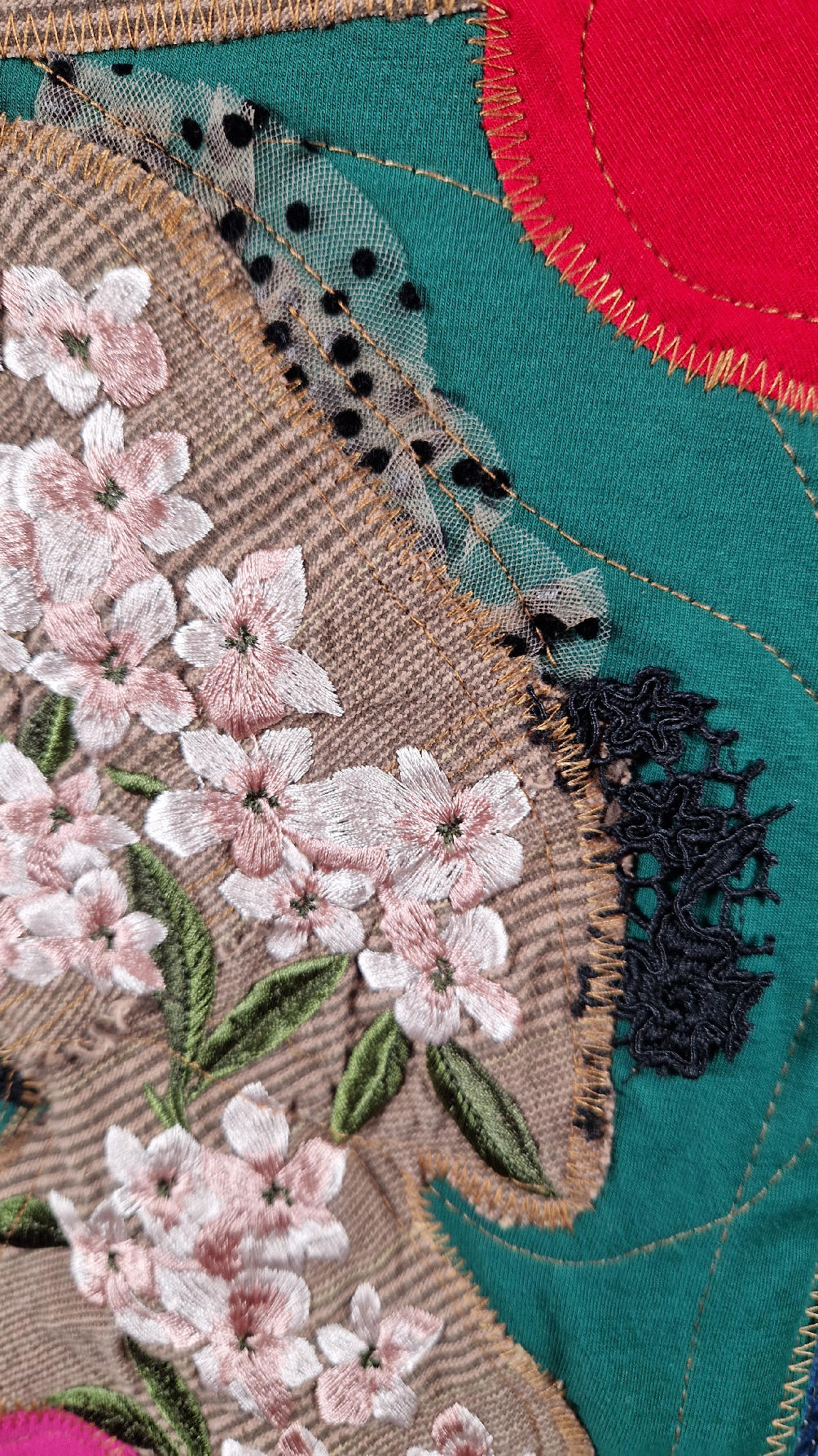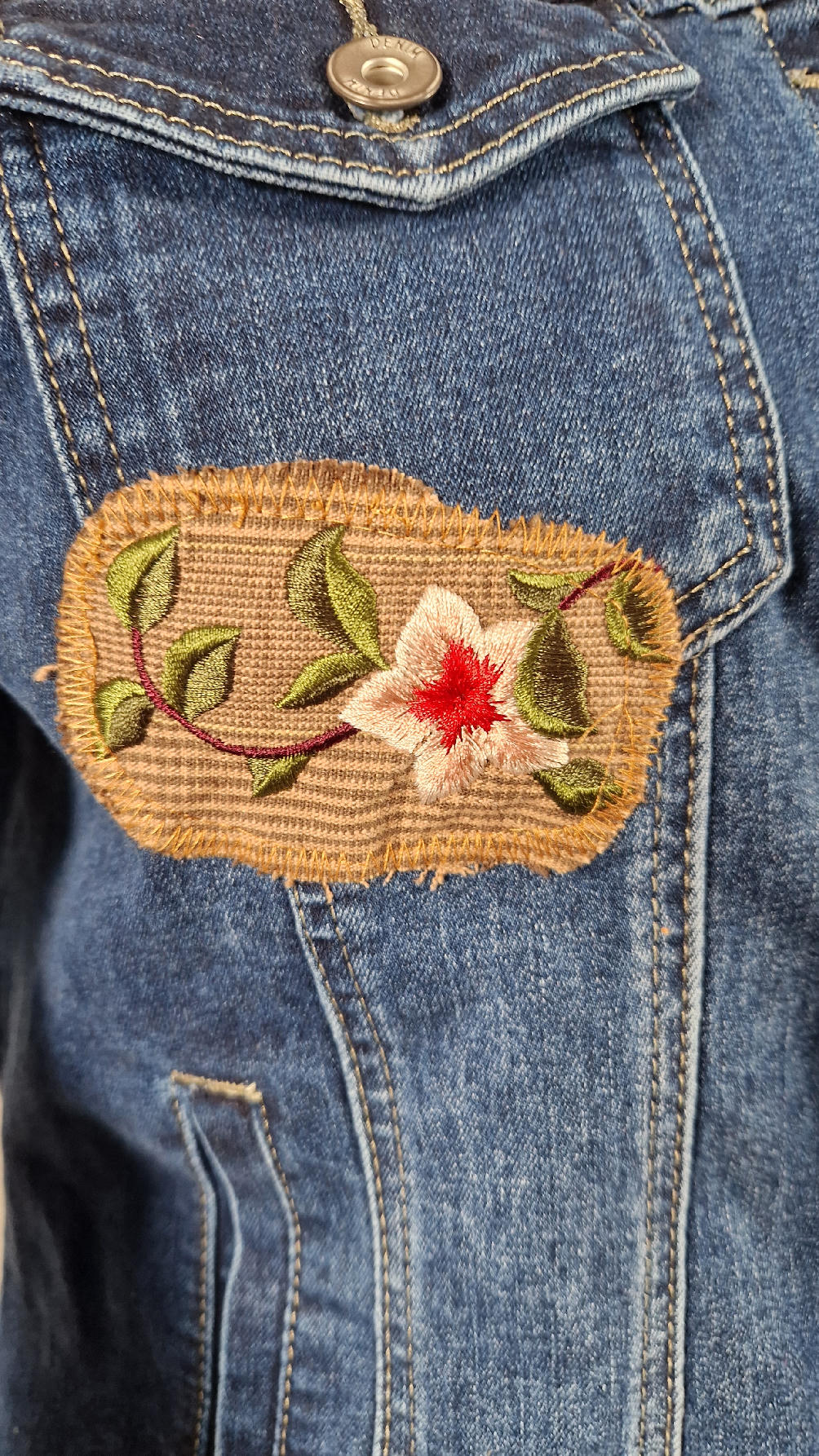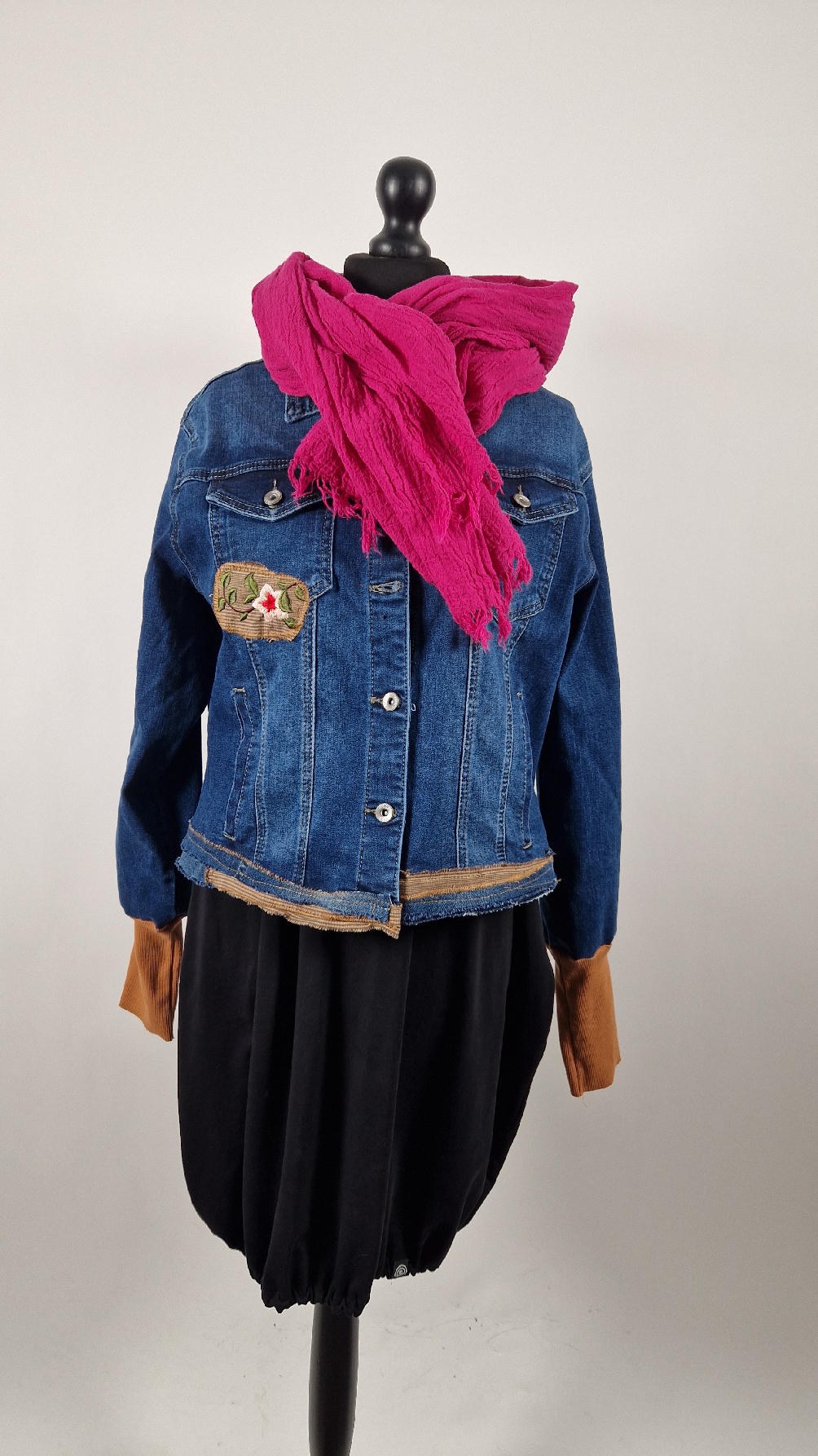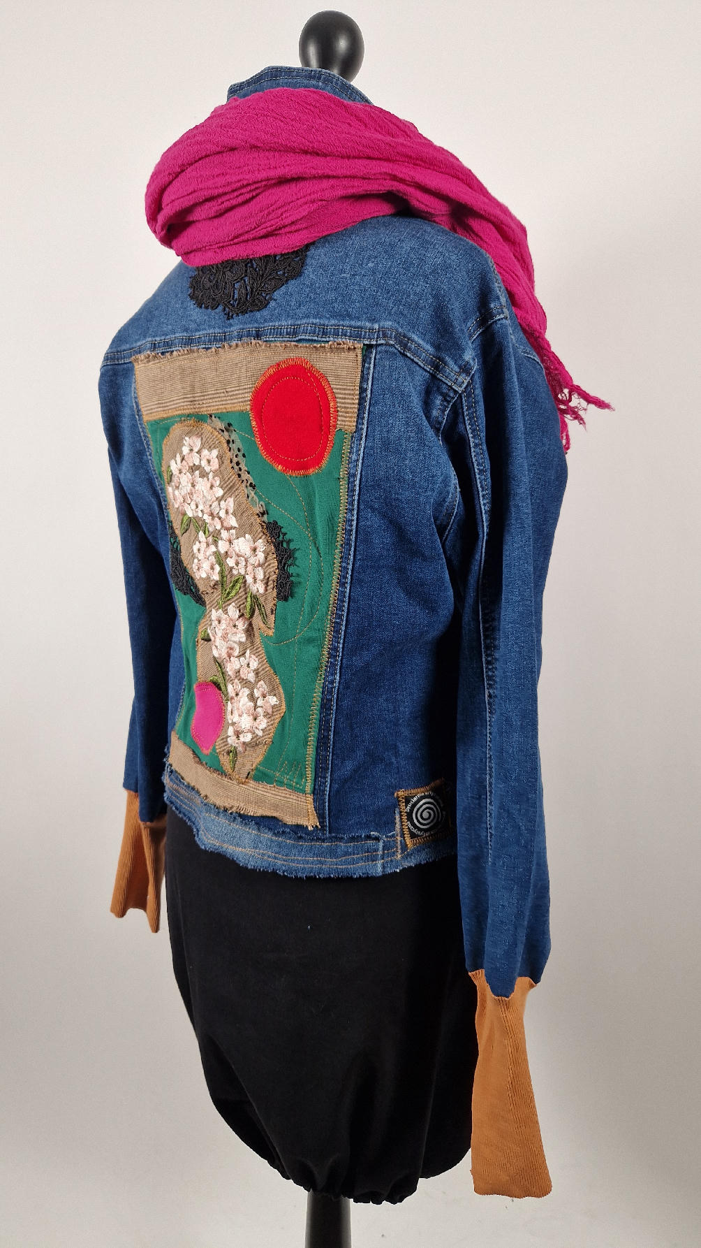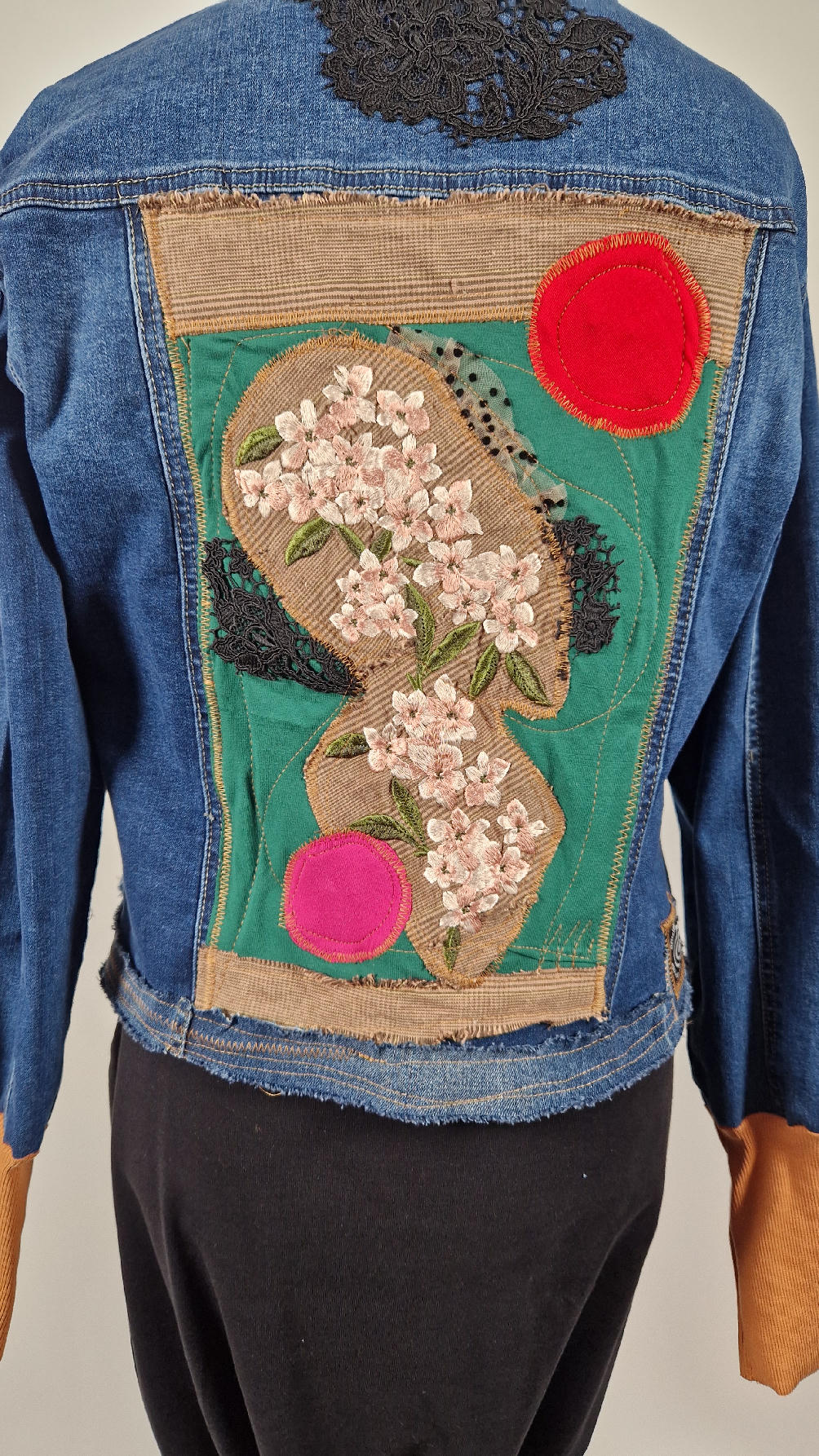 Piękna megakolorowa katana z unikatowym kolażem tkanin na plecach, mocna zieleń, pięknie współgra z ciemnym jeansem, kratka, haftowane kwiatki, koronki, gipiura, do tego jeansowe wykończenie i kropki…, miodowe mankiety ,przeszycia i wstawki…śliczna, wyjątkowa, wygodna, bo ze streczem, jedna, jedyna , niepowtarzalna!