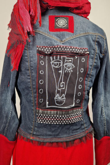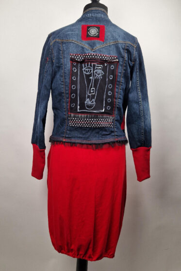 Katana z kolażem tkanin tworzących uroczy portret, z dopasowaną do kompozycji falbanką, z długimi, elastycznymi mankietami, śliczna i wyjątkowa.