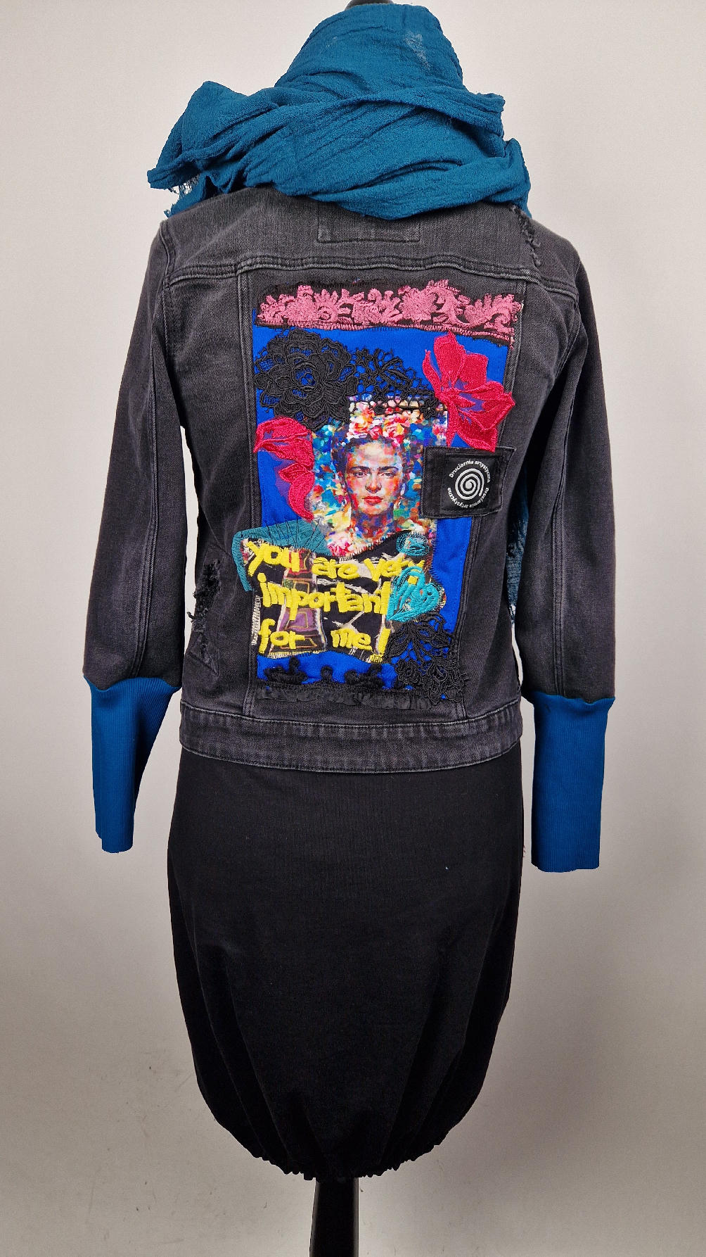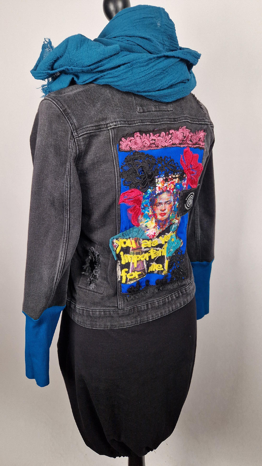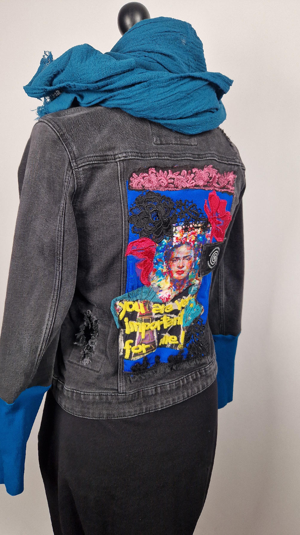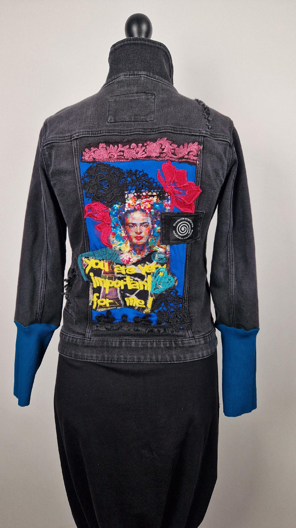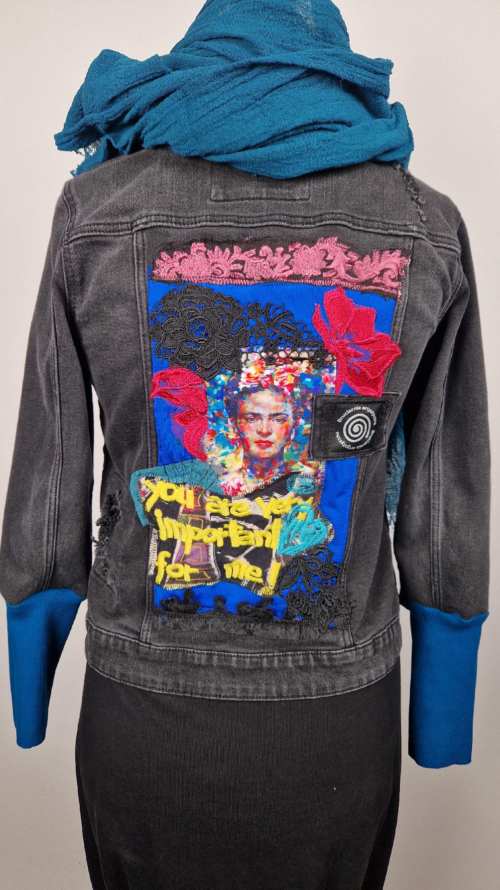 Katana z czarnego, poprzecieranego jeansu, z turkusowymi mankietami, z pięknym kolażem tkanin na plecach z Fridą, z koronkami, z kwiatami, z gipiurą, z fajowym napisem, z miękkimi mankietami .