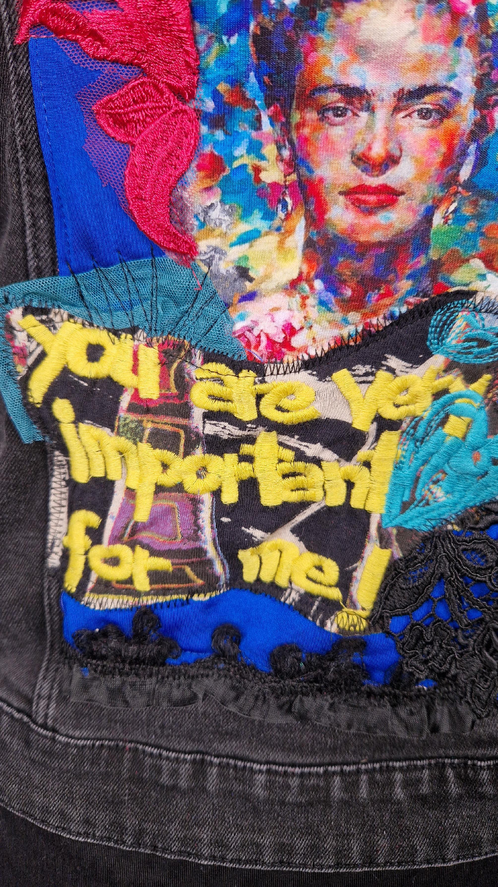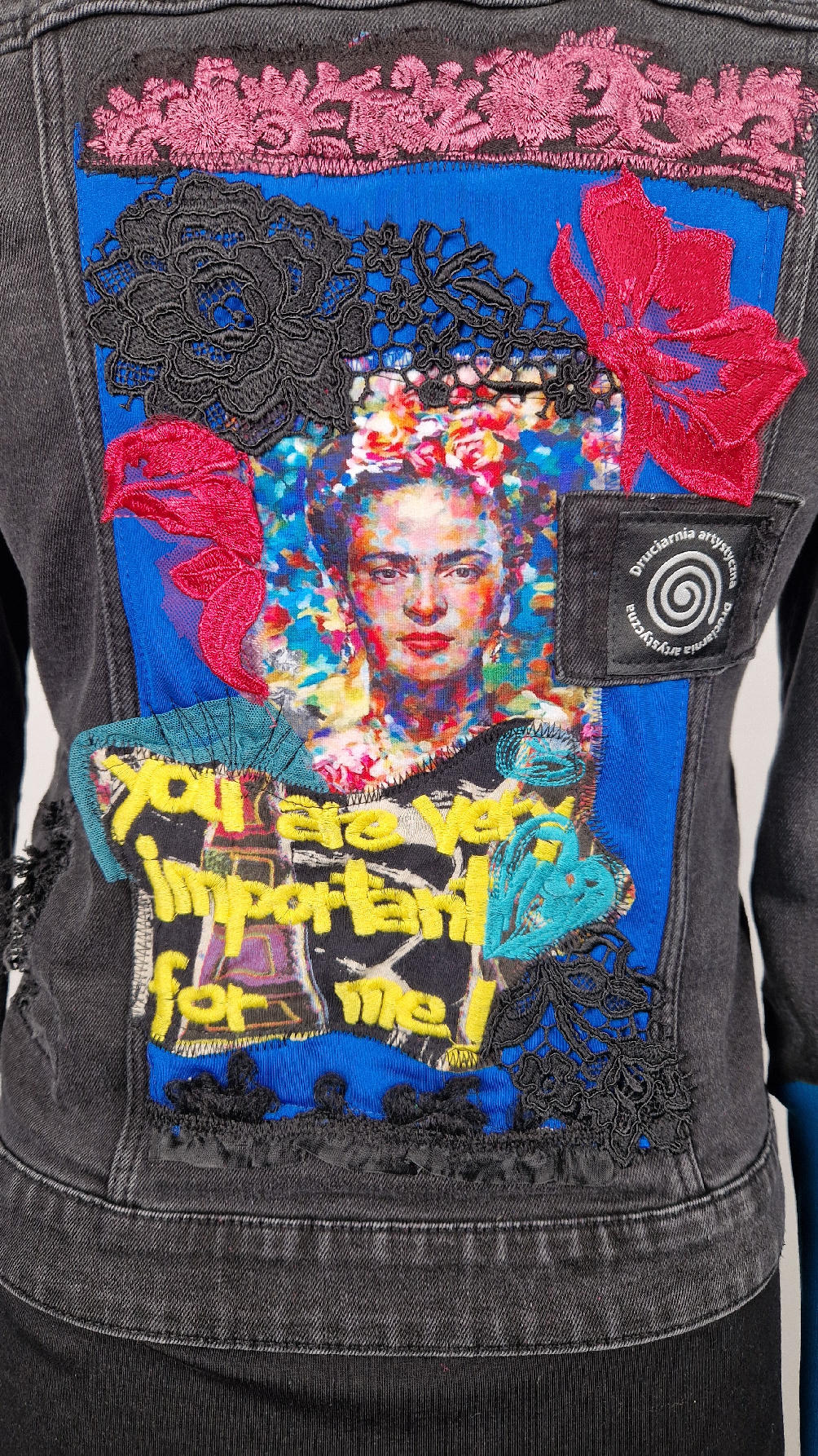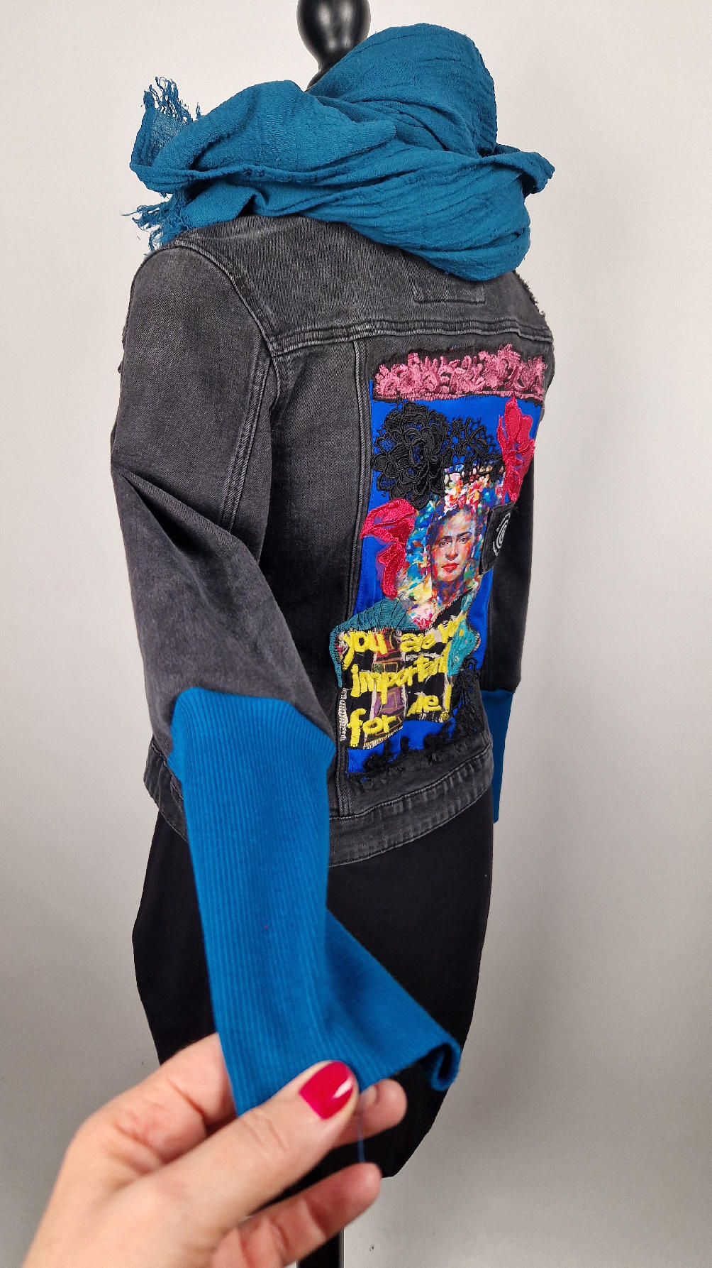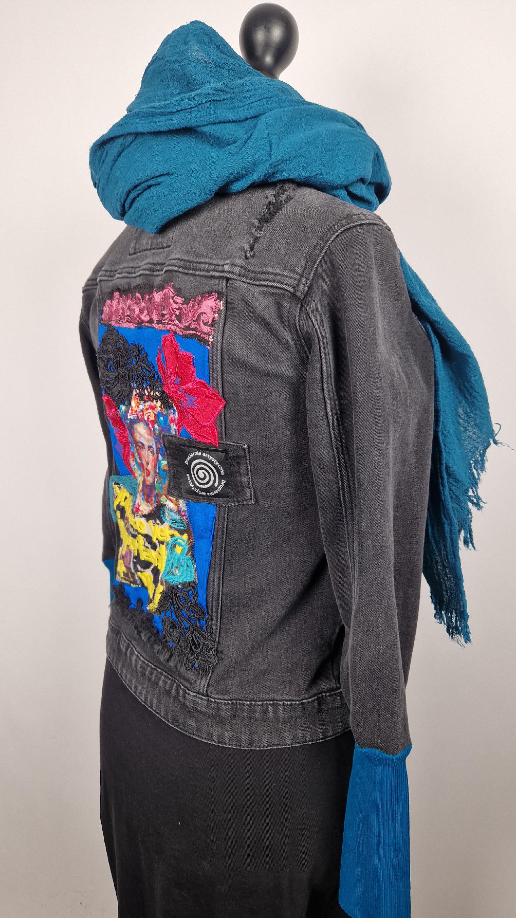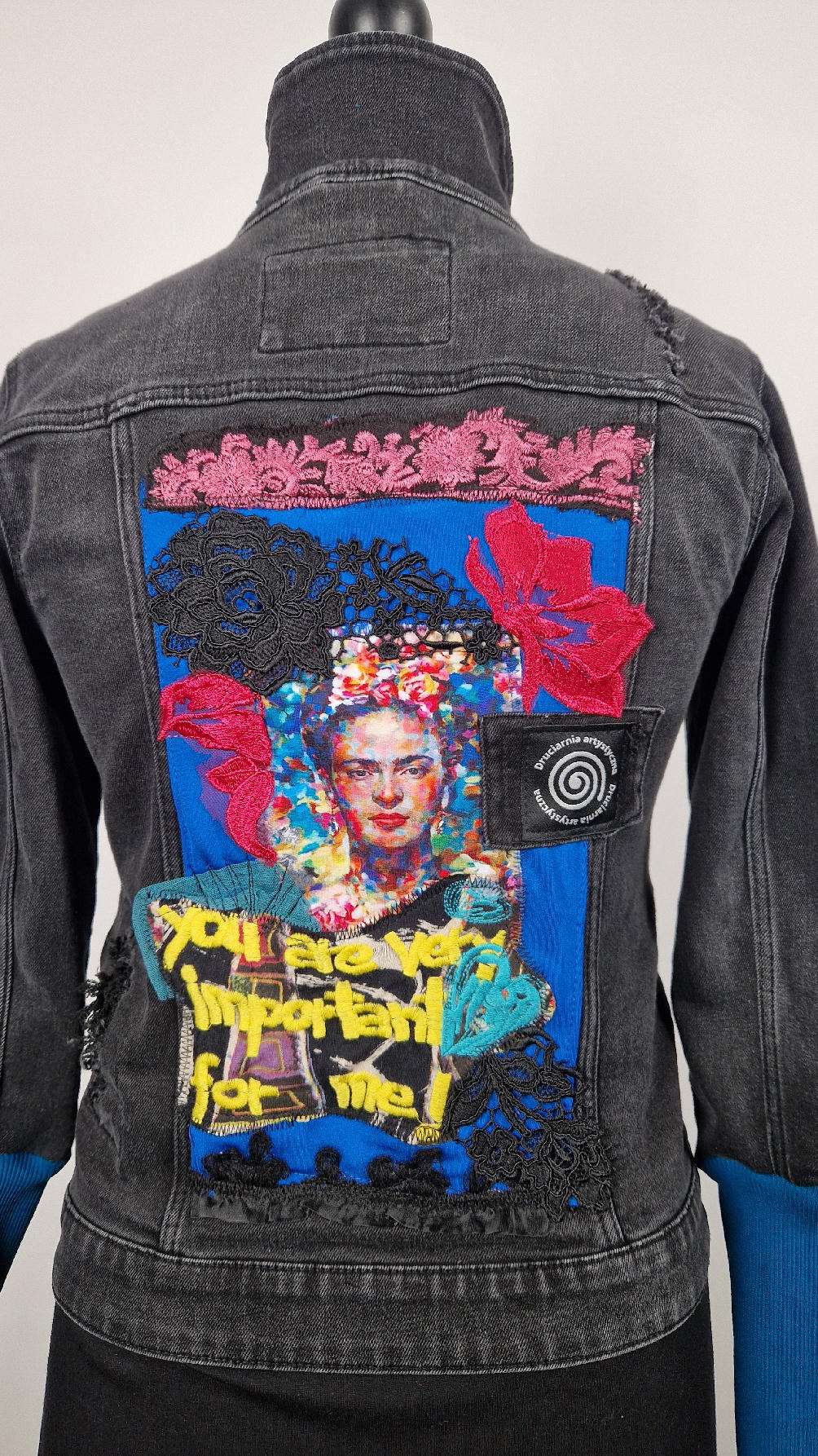 Katana z czarnego, poprzecieranego jeansu, z turkusowymi mankietami, z pięknym kolażem tkanin na plecach z Fridą, z koronkami, z kwiatami, z gipiurą, z fajowym napisem, z miękkimi mankietami .
