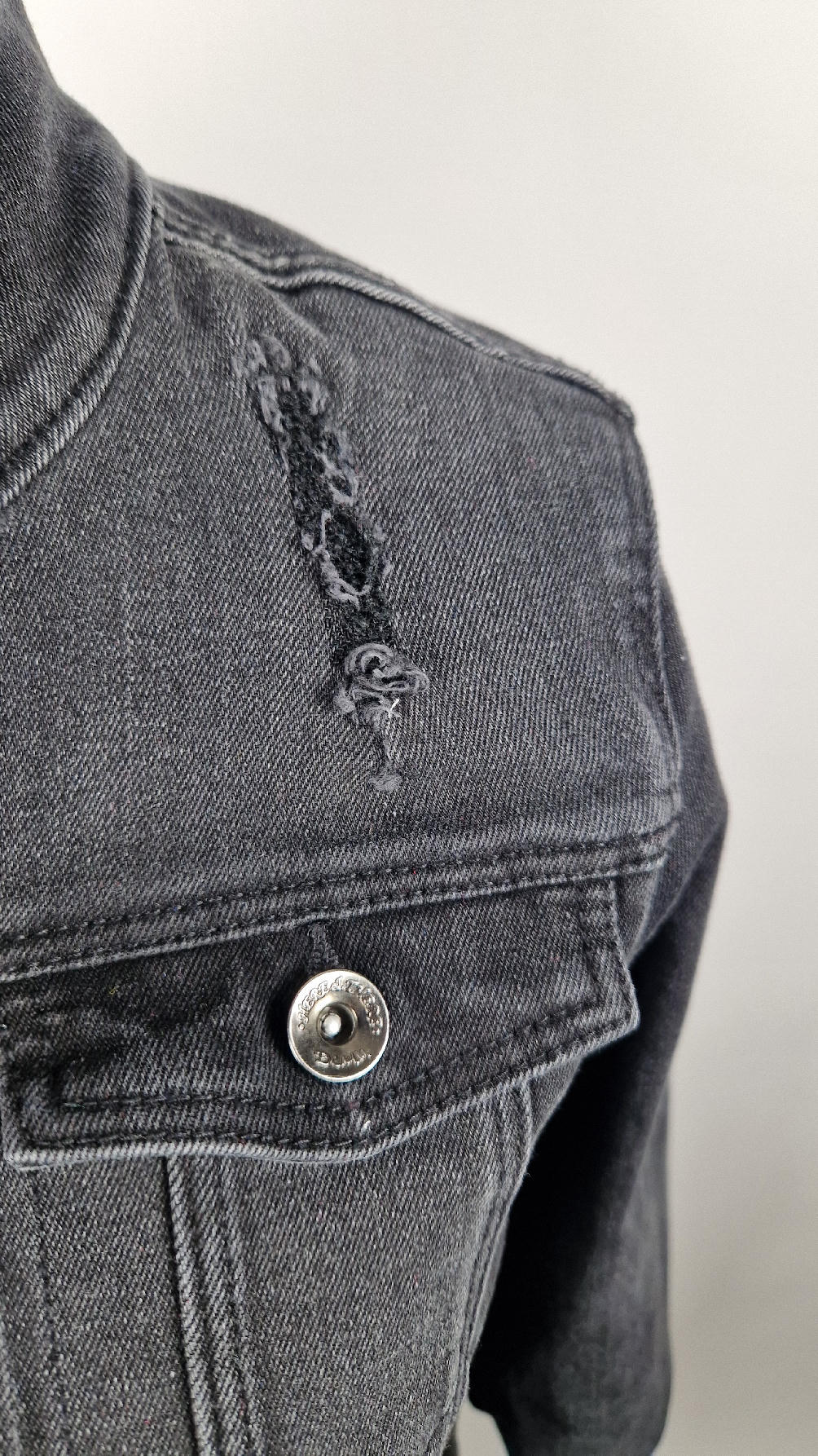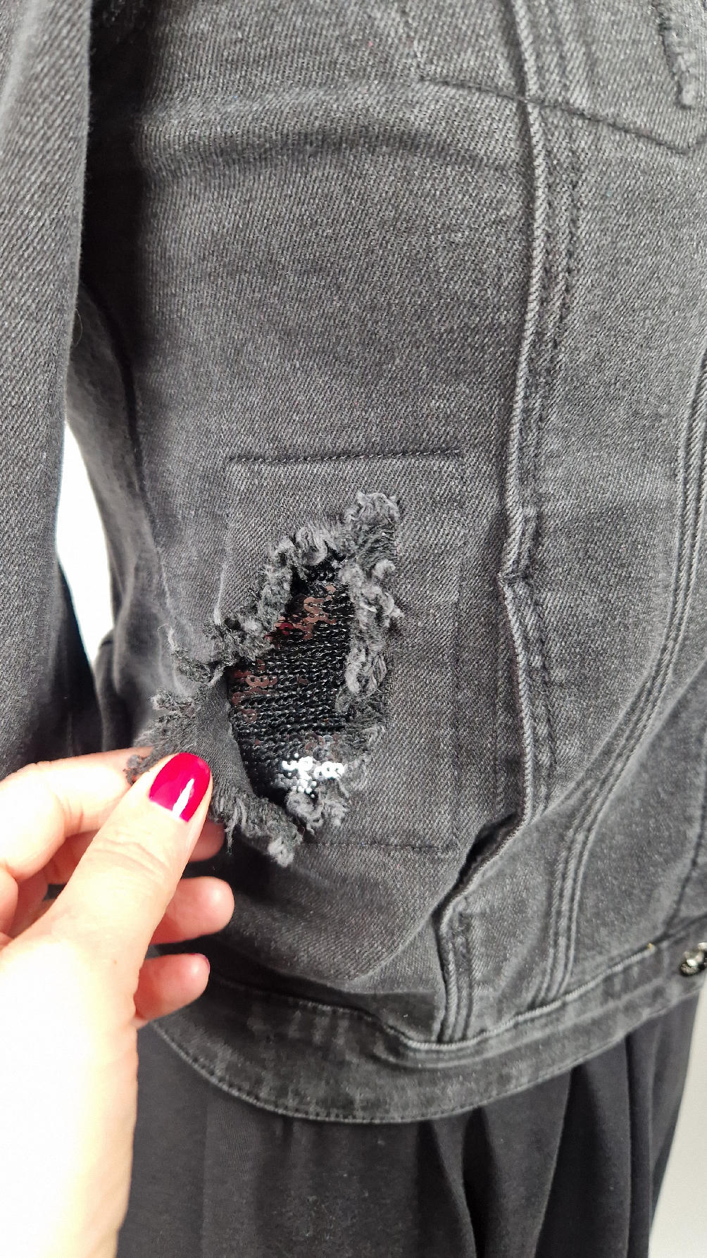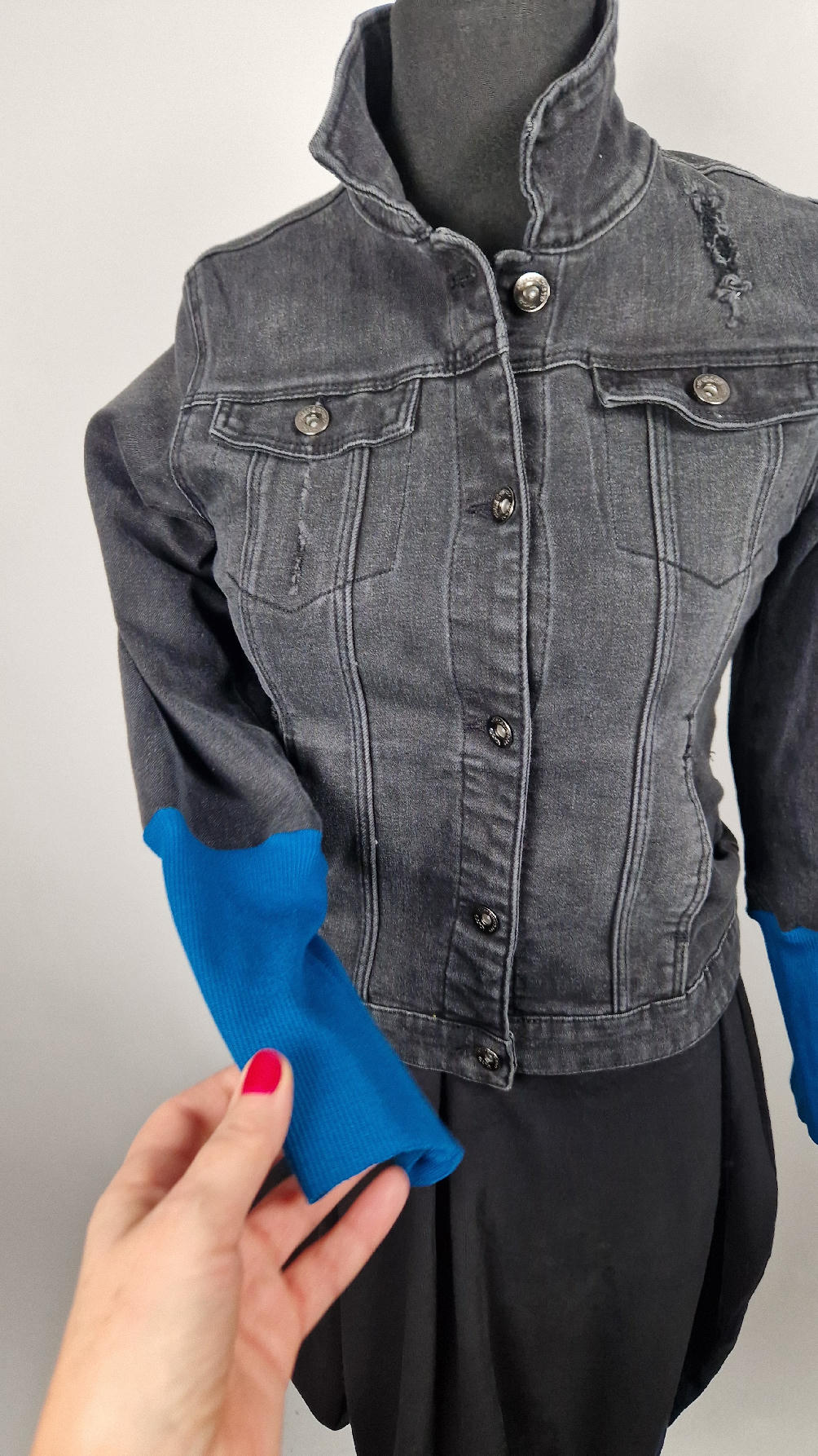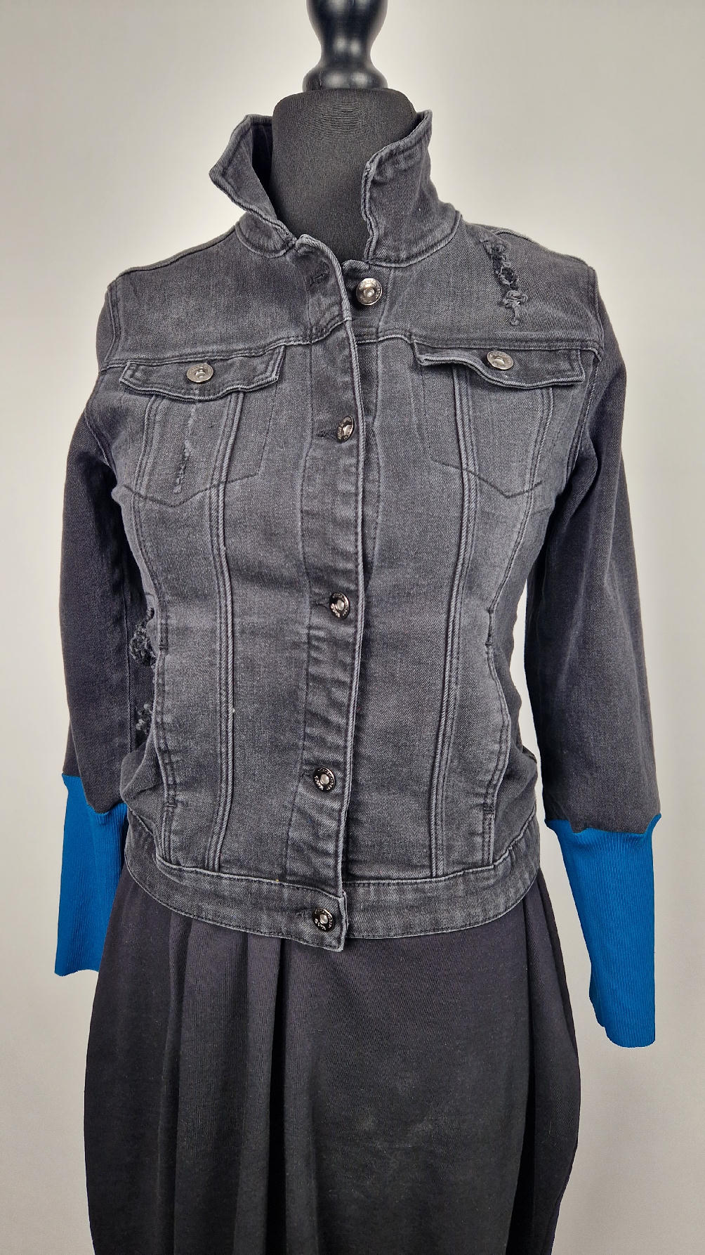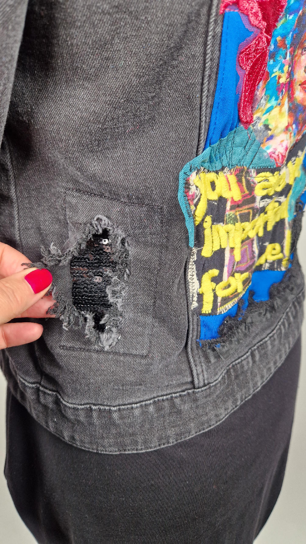 Katana z czarnego, poprzecieranego jeansu, z turkusowymi mankietami, z pięknym kolażem tkanin na plecach z Fridą, z koronkami, z kwiatami, z gipiurą, z fajowym napisem, z miękkimi mankietami .