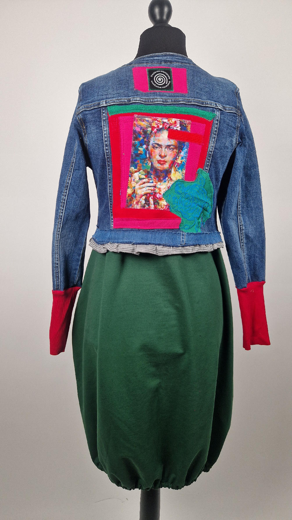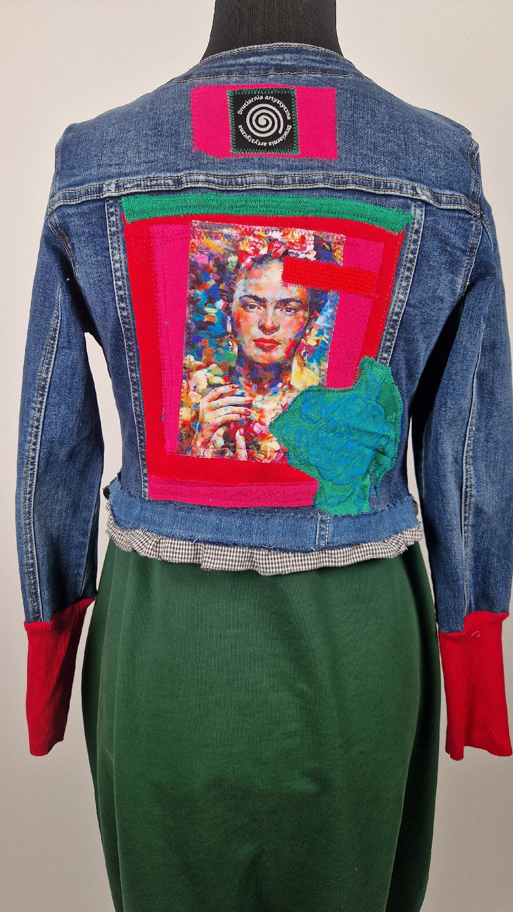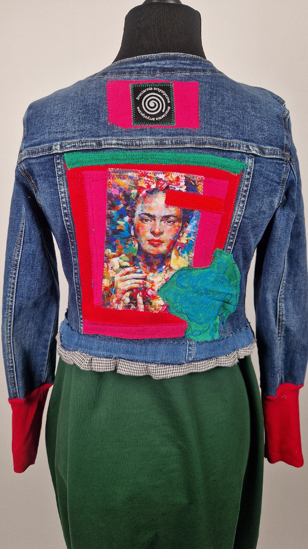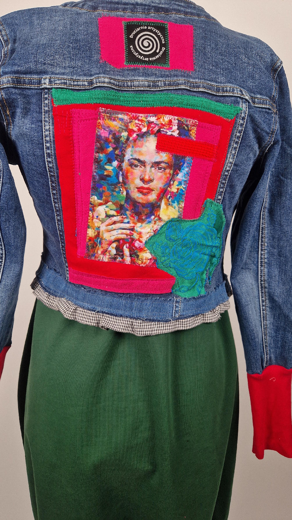 Obłędna zupełnie niezwyczajna katana z elastycznego jeansu, którego główną dekoracją jest kolaż tkanin z portretem Fridy, do tego mix meksykańskich kolorów…Katana jest pozbawiona paska na dole, ma falbankę w kratkę, ma długie, miękkie czerwone mankiety, żeby było miękko i wygodnie i oczywiście oryginalnie…, dodatki, które sprawią, że pokochasz swoją Fridkę od pierwszego spojrzenia