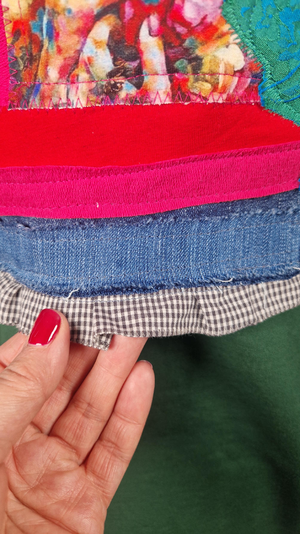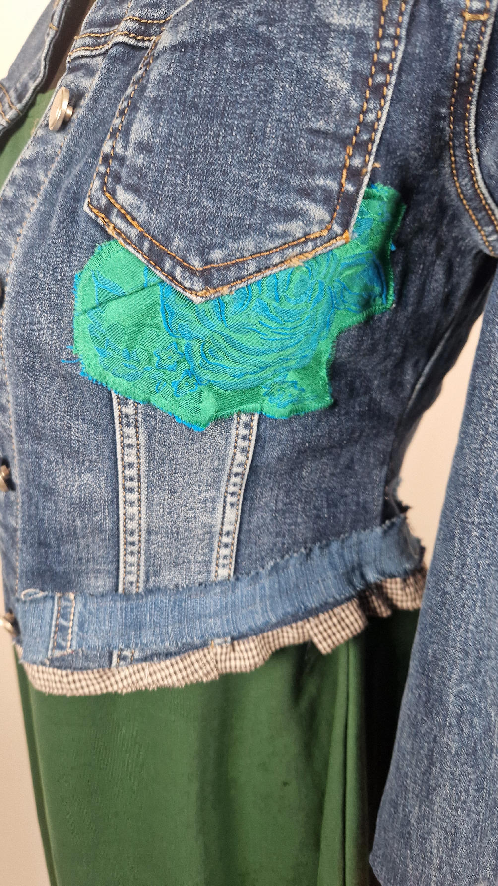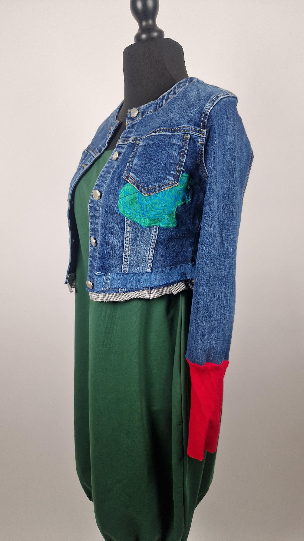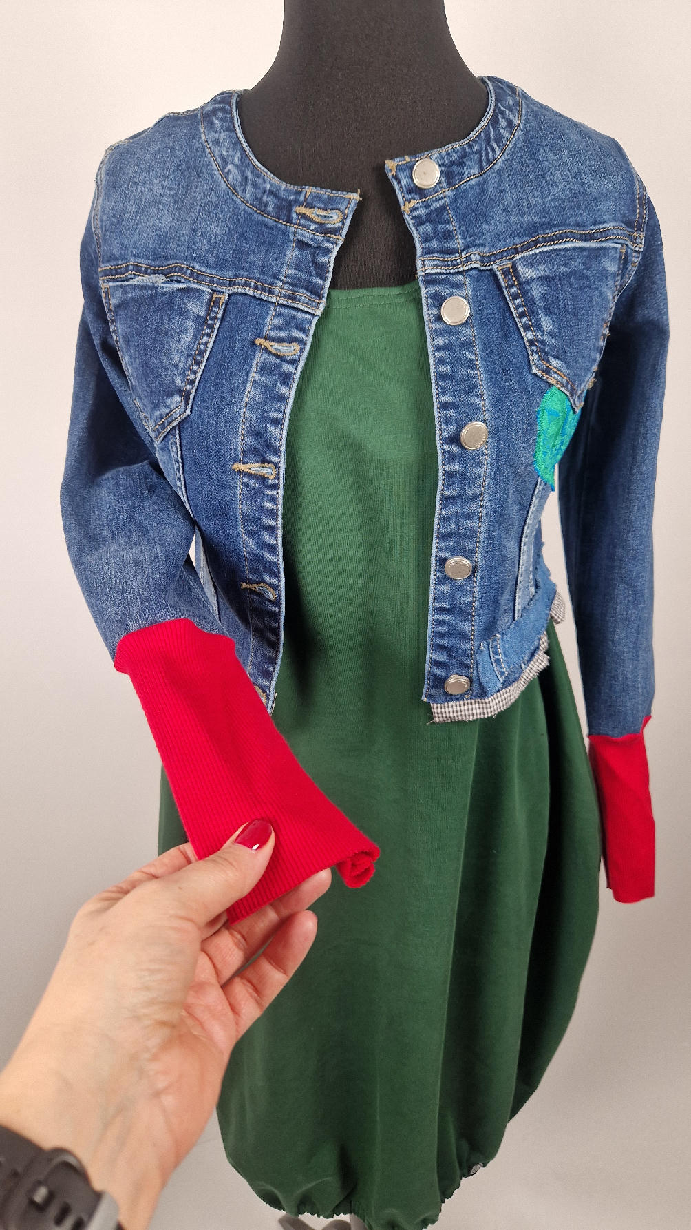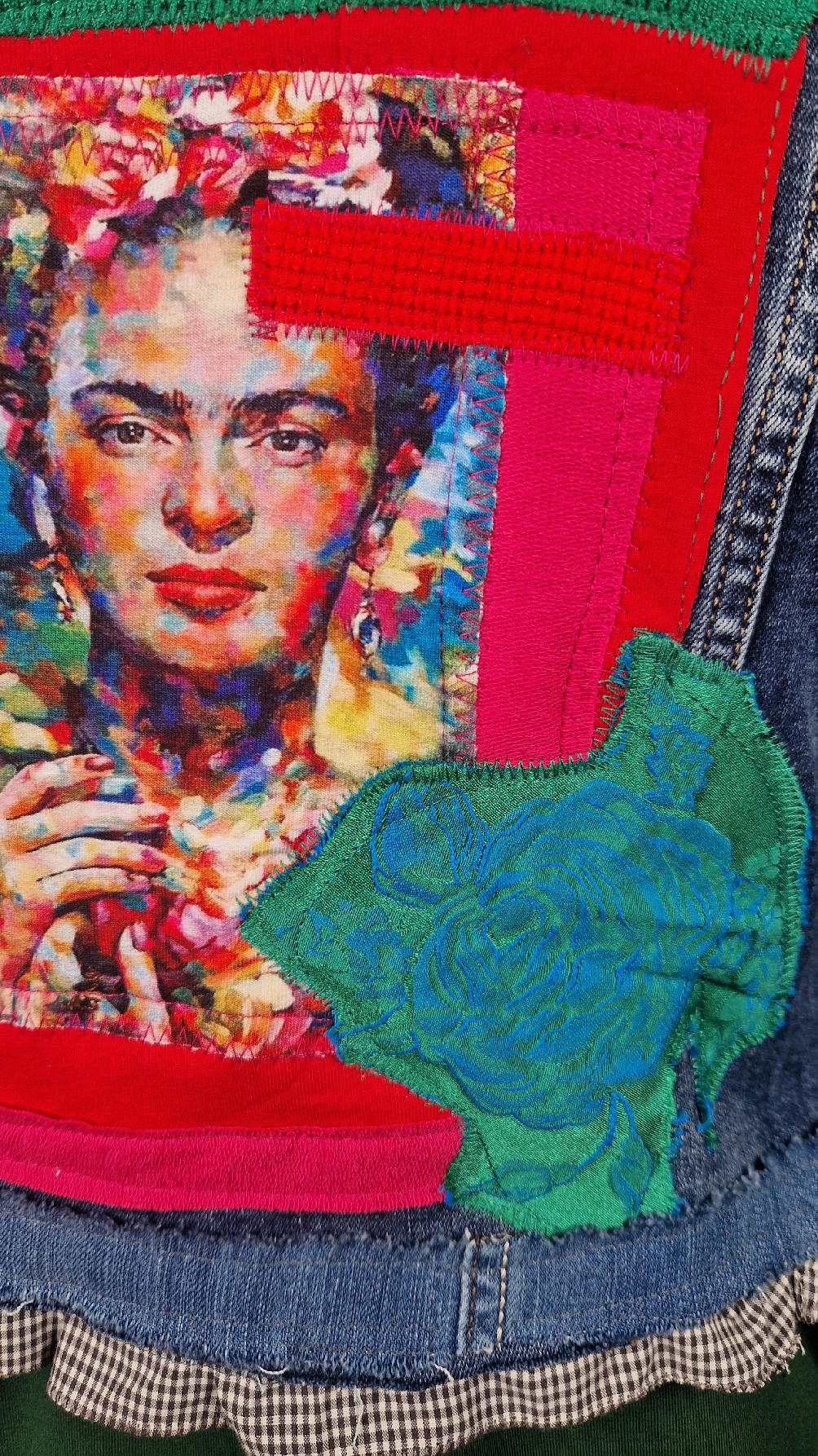Obłędna zupełnie niezwyczajna katana z elastycznego jeansu, którego główną dekoracją jest kolaż tkanin z portretem Fridy, do tego mix meksykańskich kolorów…Katana jest pozbawiona paska na dole, ma falbankę w kratkę, ma długie, miękkie czerwone mankiety, żeby było miękko i wygodnie i oczywiście oryginalnie…, dodatki, które sprawią, że pokochasz swoją Fridkę od pierwszego spojrzenia