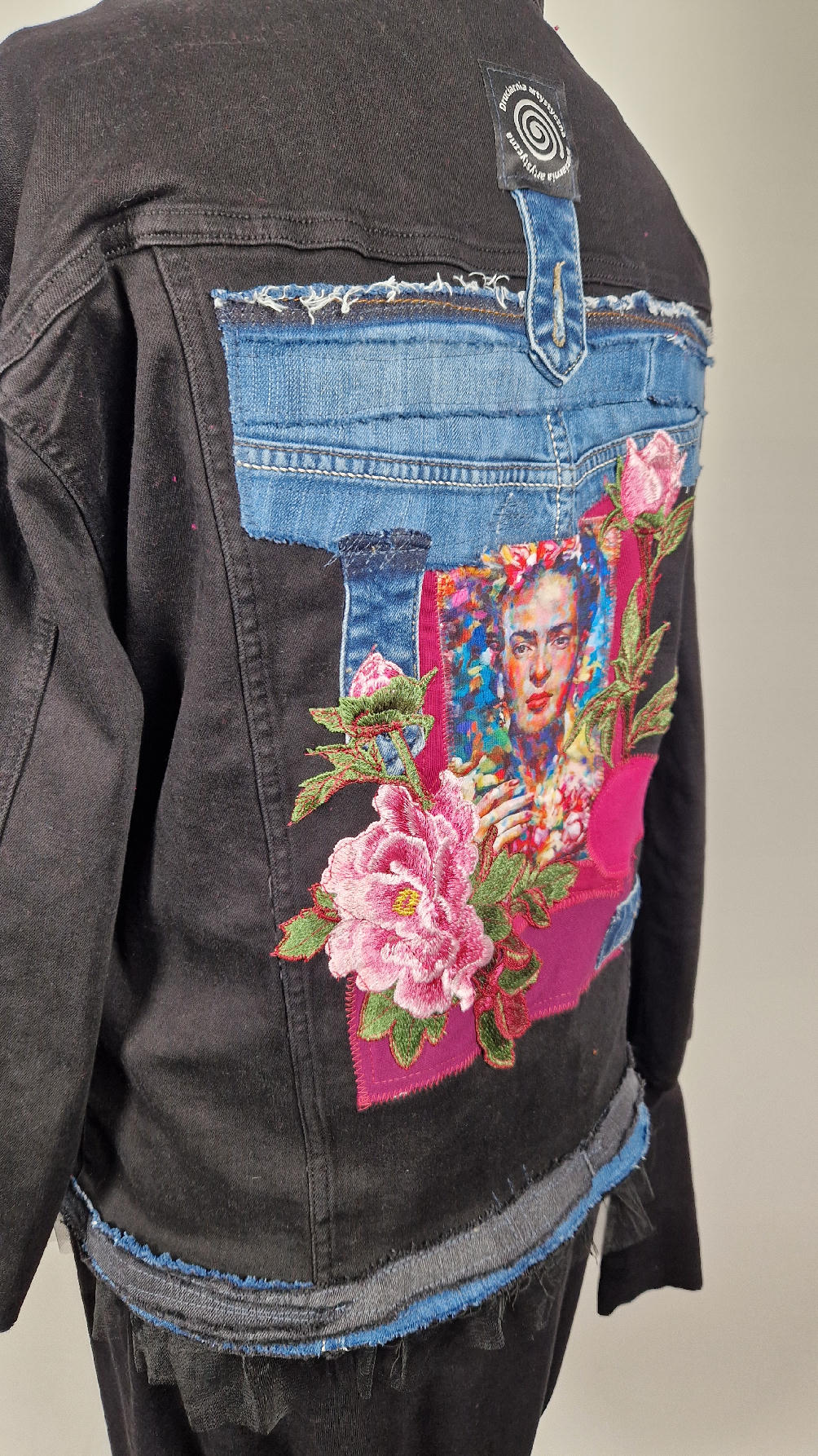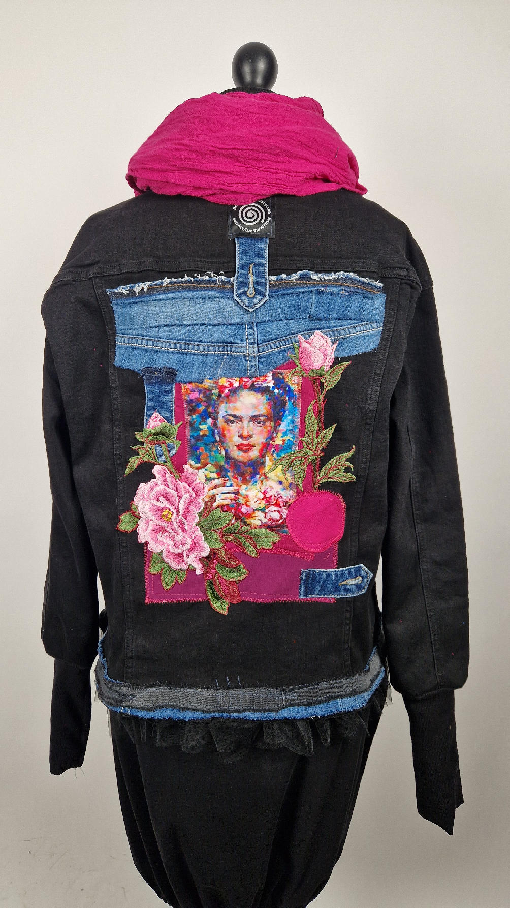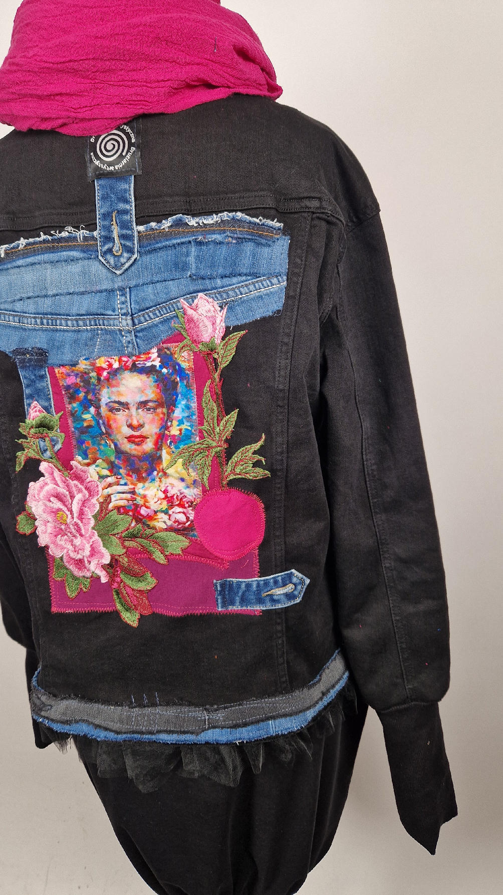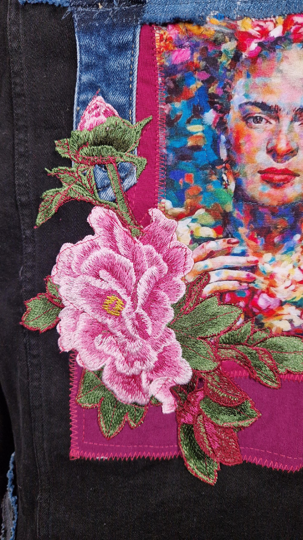 Katana z megaelastycznego,  miękkiego, czarnego jeansu, którego główną dekoracją jest mój autorski, unikatowy i niepowtarzalny kolaż tkanin na plecach, z  portretem Fridy, z kwiatami, z do tego falbanki, jeans na dole…Katana  ma długie, czarne  mankiety,  żeby było miękko i wygodnie i oczywiście oryginalnie…, które sprawią, że pokochasz swoją katankę od pierwszego spojrzenia