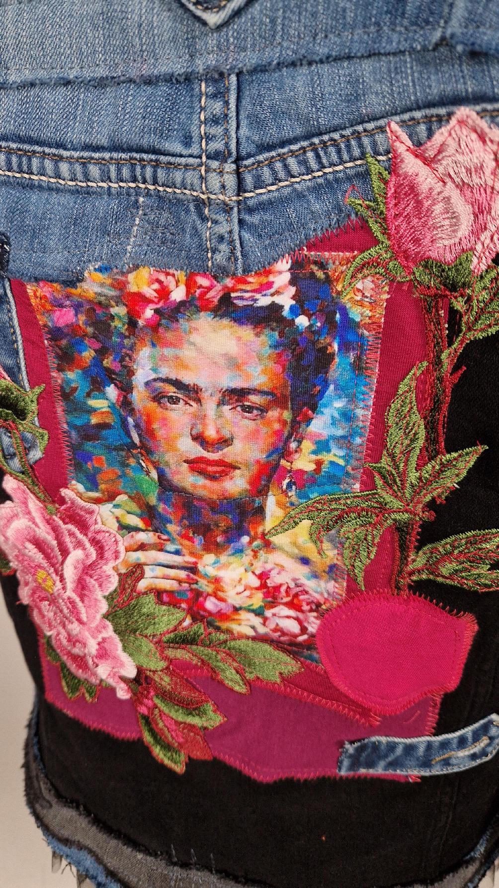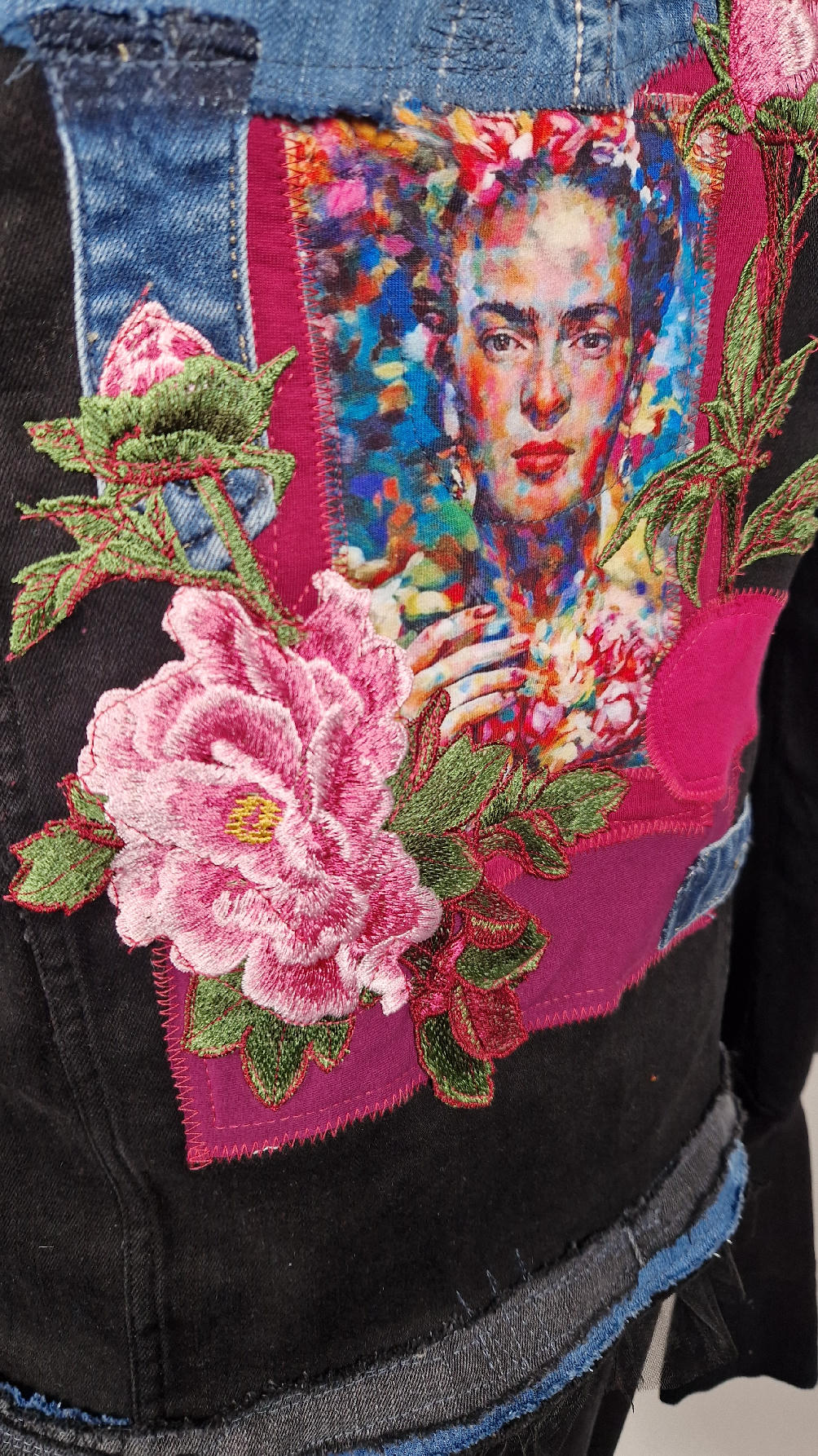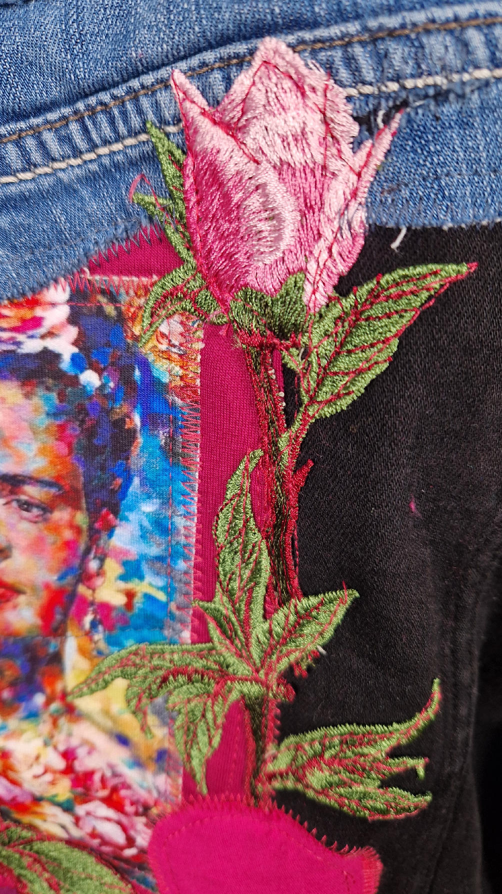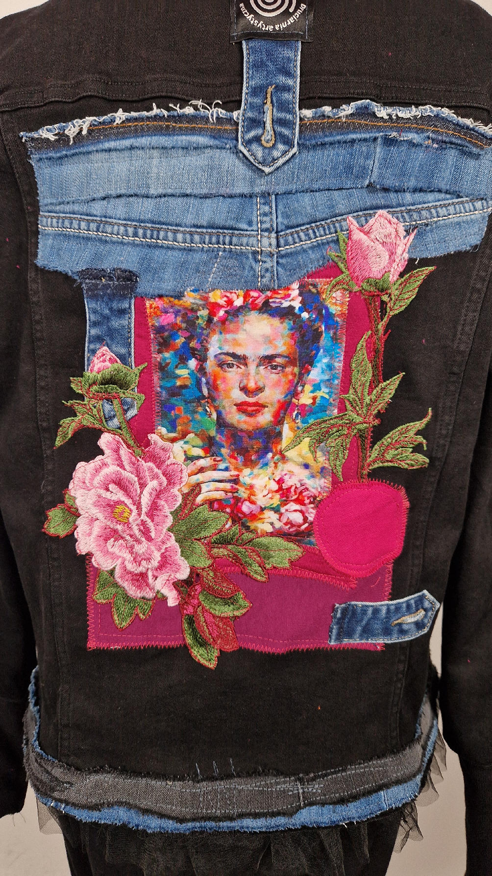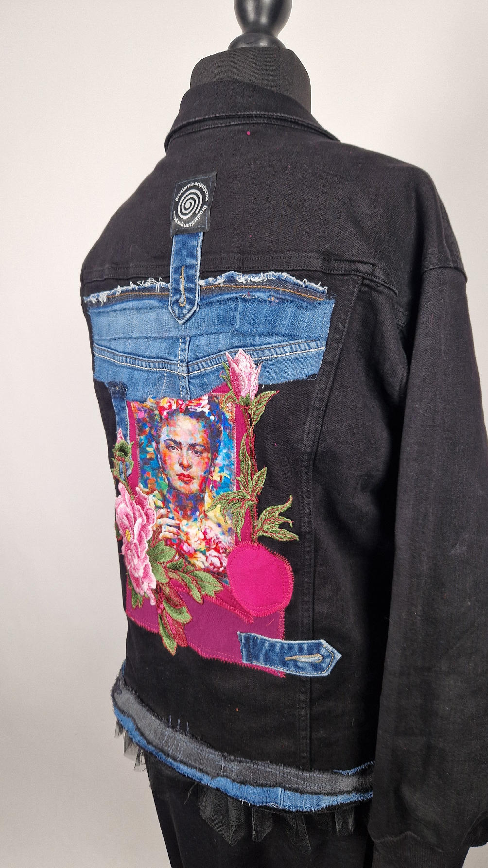 Katana z megaelastycznego,  miękkiego, czarnego jeansu, którego główną dekoracją jest mój autorski, unikatowy i niepowtarzalny kolaż tkanin na plecach, z  portretem Fridy, z kwiatami, z do tego falbanki, jeans na dole…Katana  ma długie, czarne  mankiety,  żeby było miękko i wygodnie i oczywiście oryginalnie…, które sprawią, że pokochasz swoją katankę od pierwszego spojrzenia