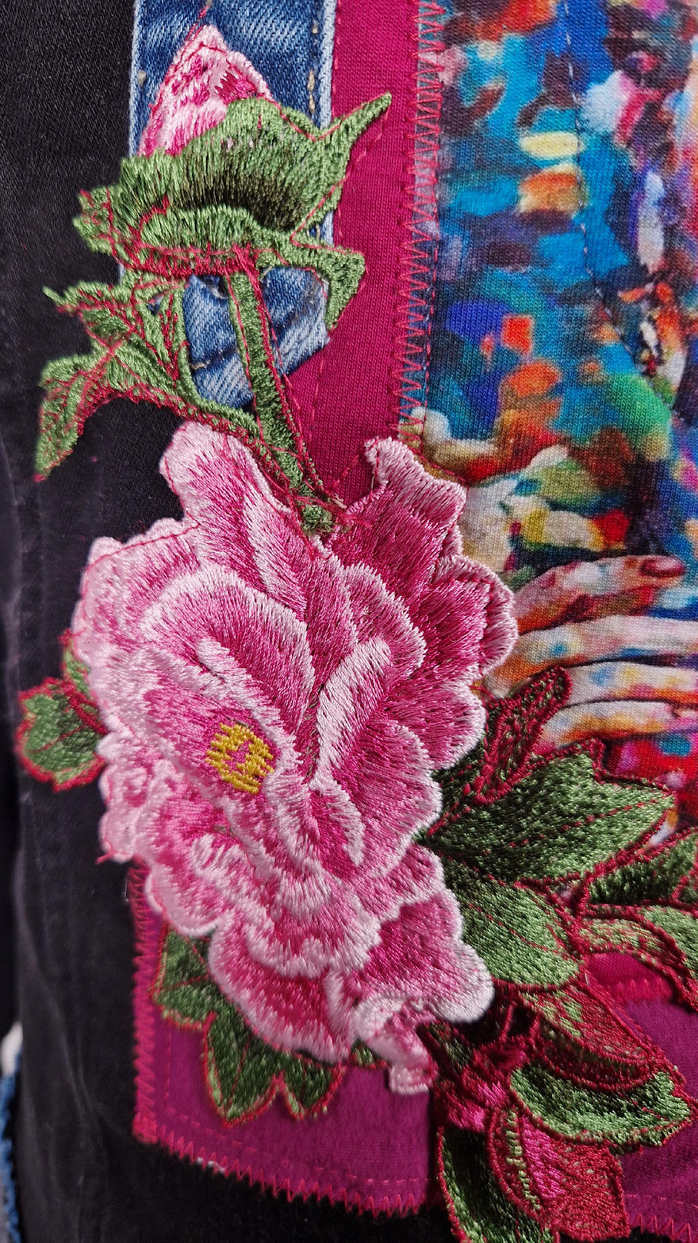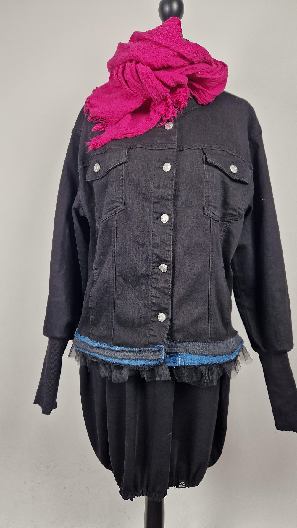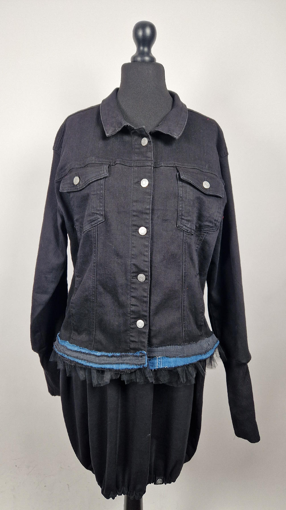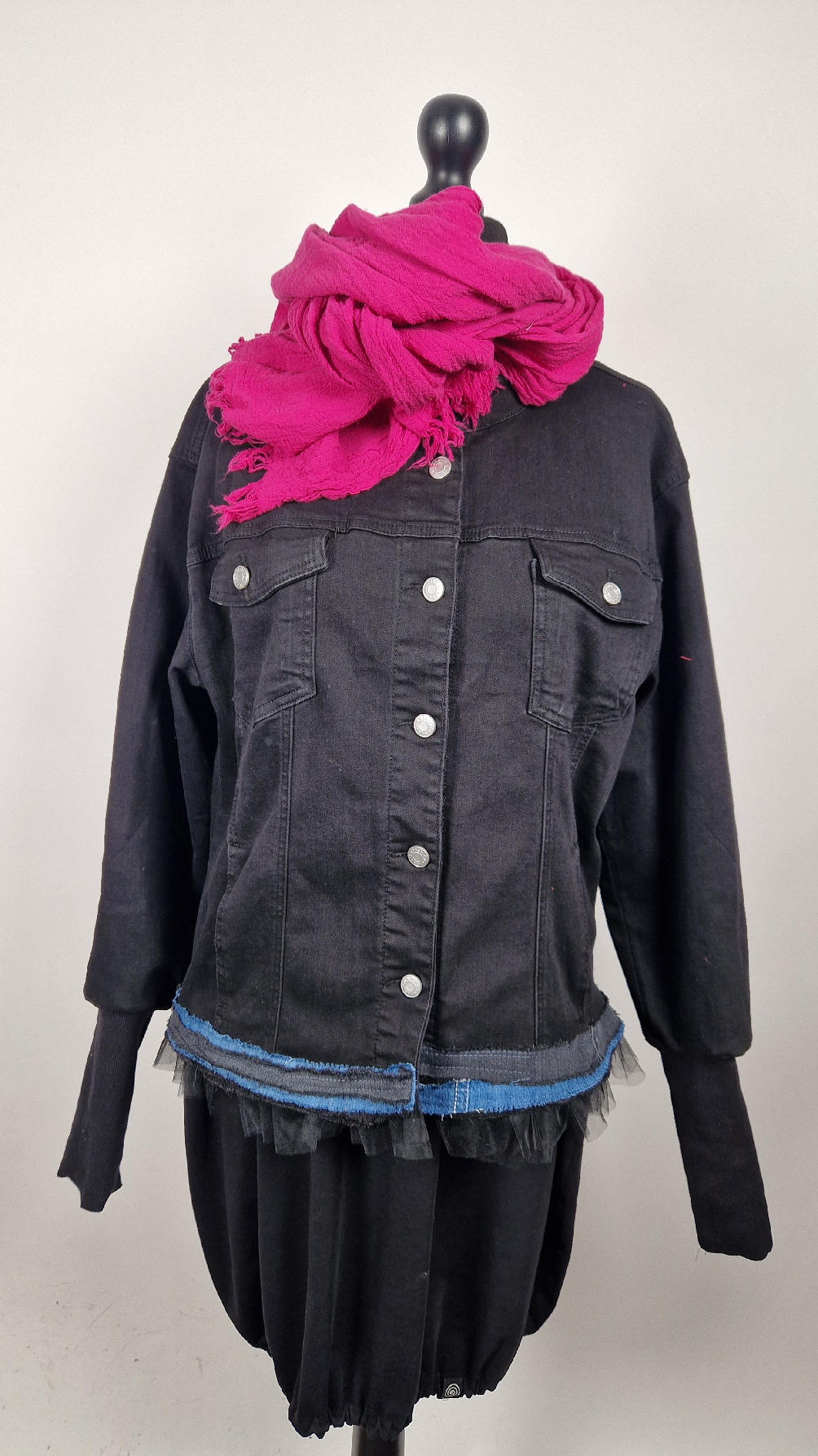 Katana z megaelastycznego,  miękkiego, czarnego jeansu, którego główną dekoracją jest mój autorski, unikatowy i niepowtarzalny kolaż tkanin na plecach, z  portretem Fridy, z kwiatami, z do tego falbanki, jeans na dole…Katana  ma długie, czarne  mankiety,  żeby było miękko i wygodnie i oczywiście oryginalnie…, które sprawią, że pokochasz swoją katankę od pierwszego spojrzenia