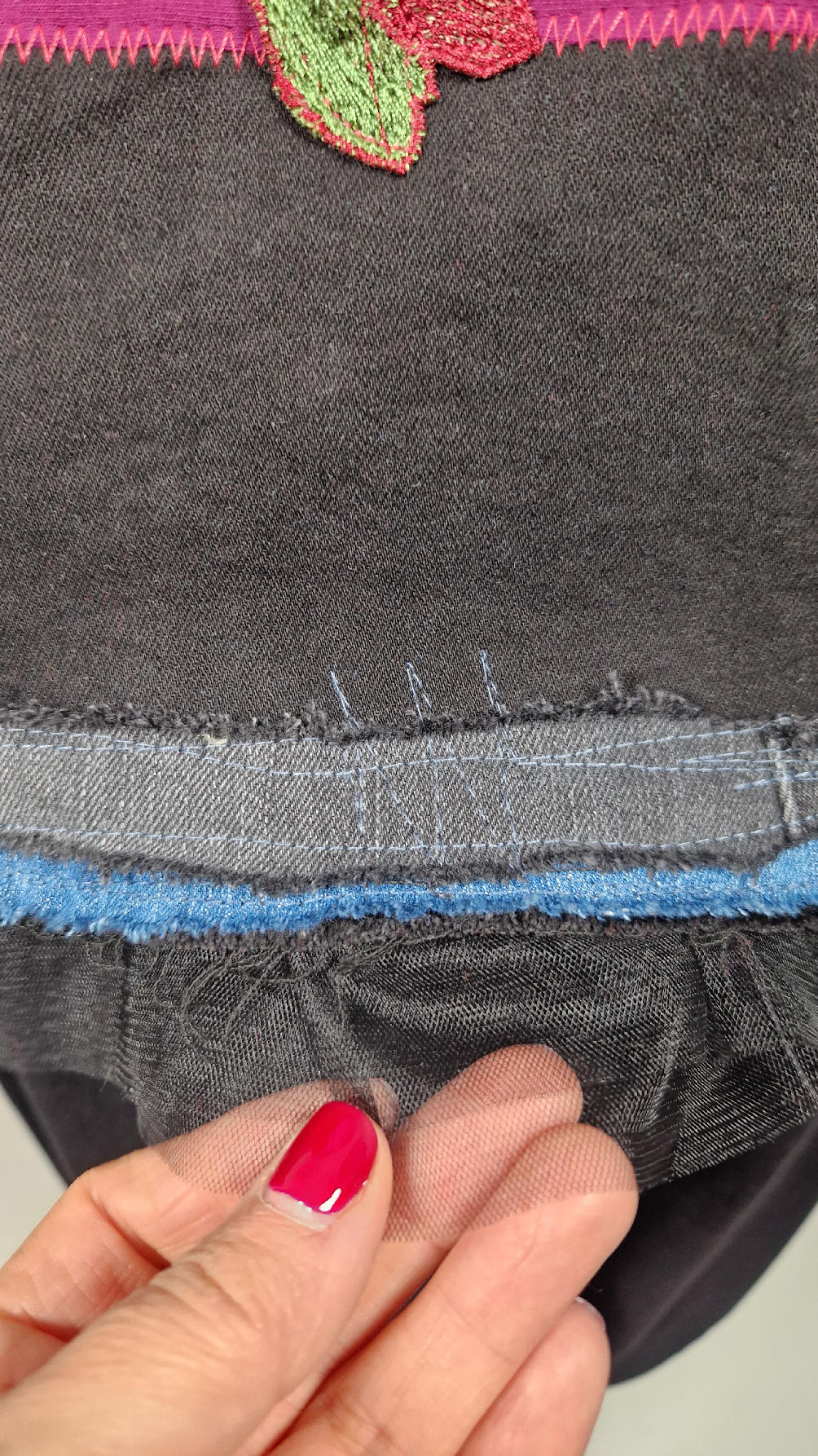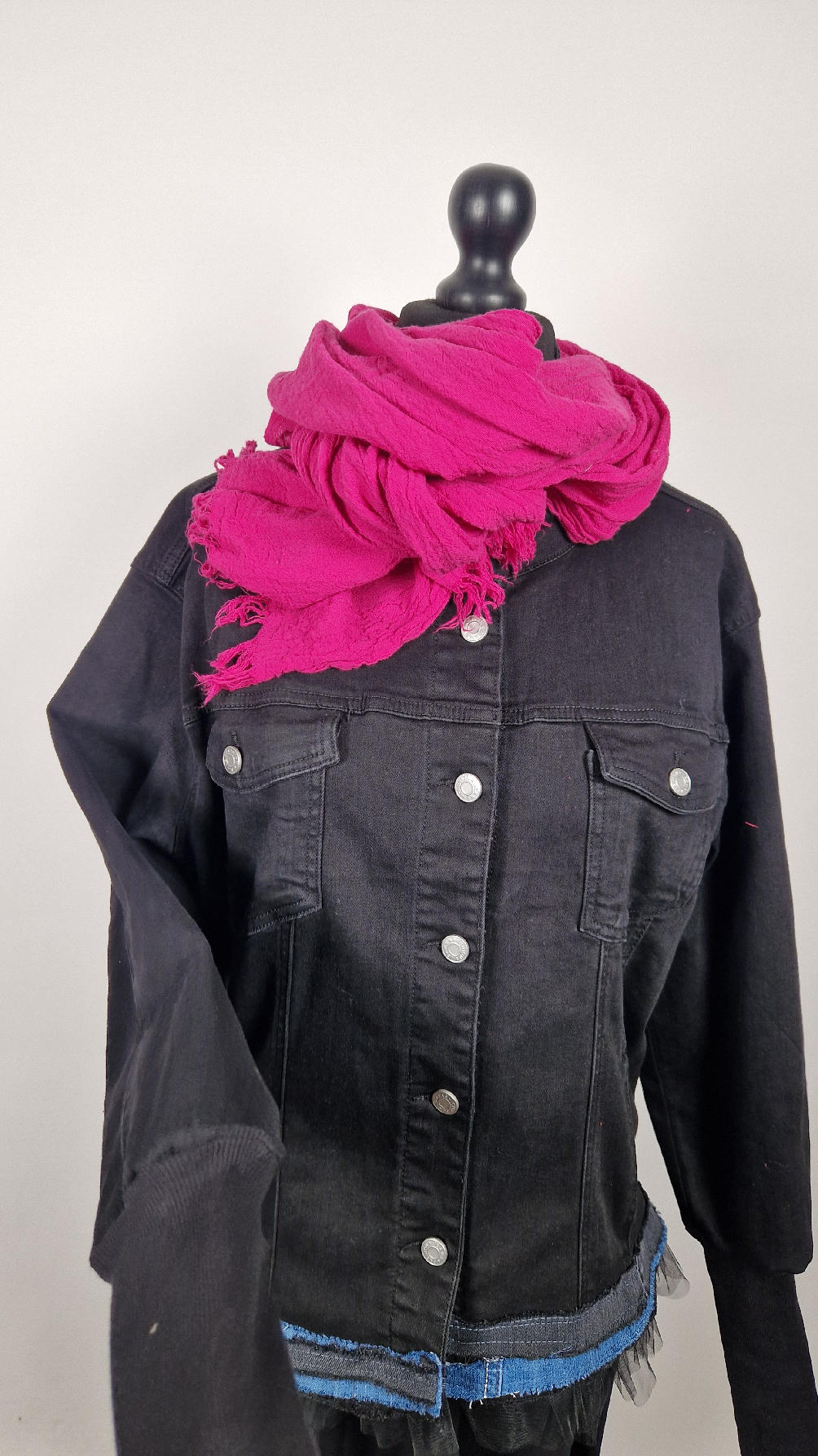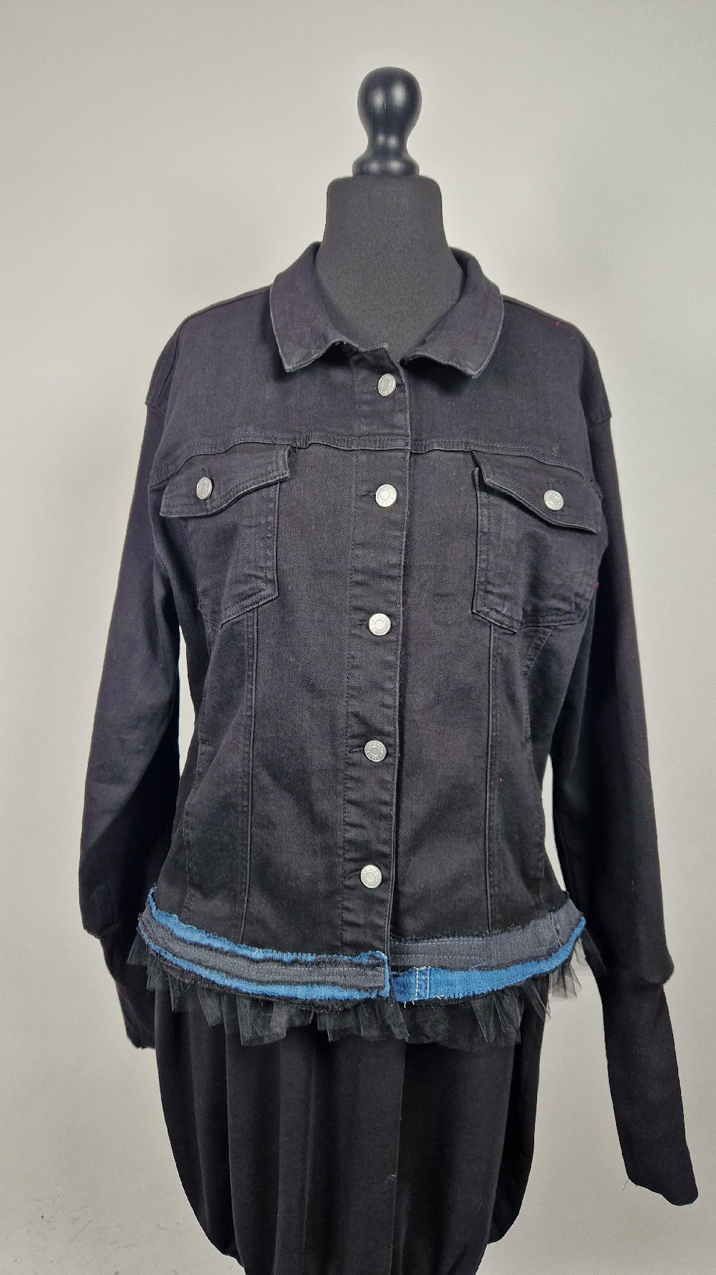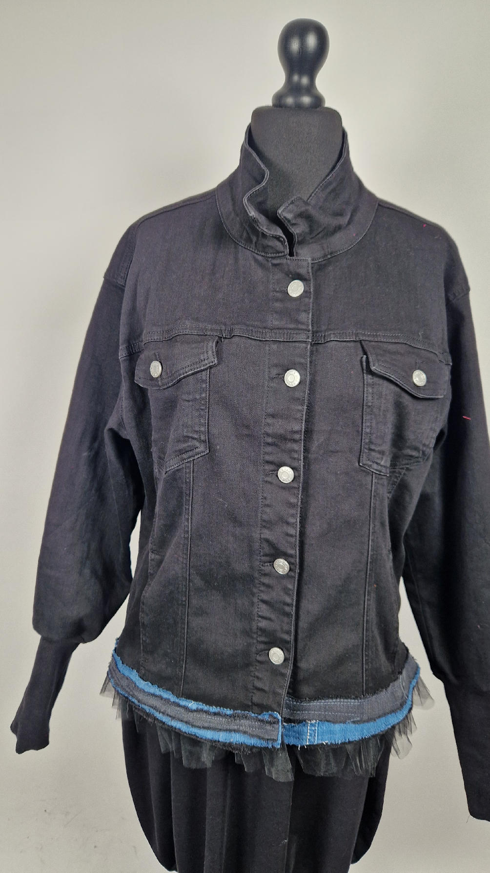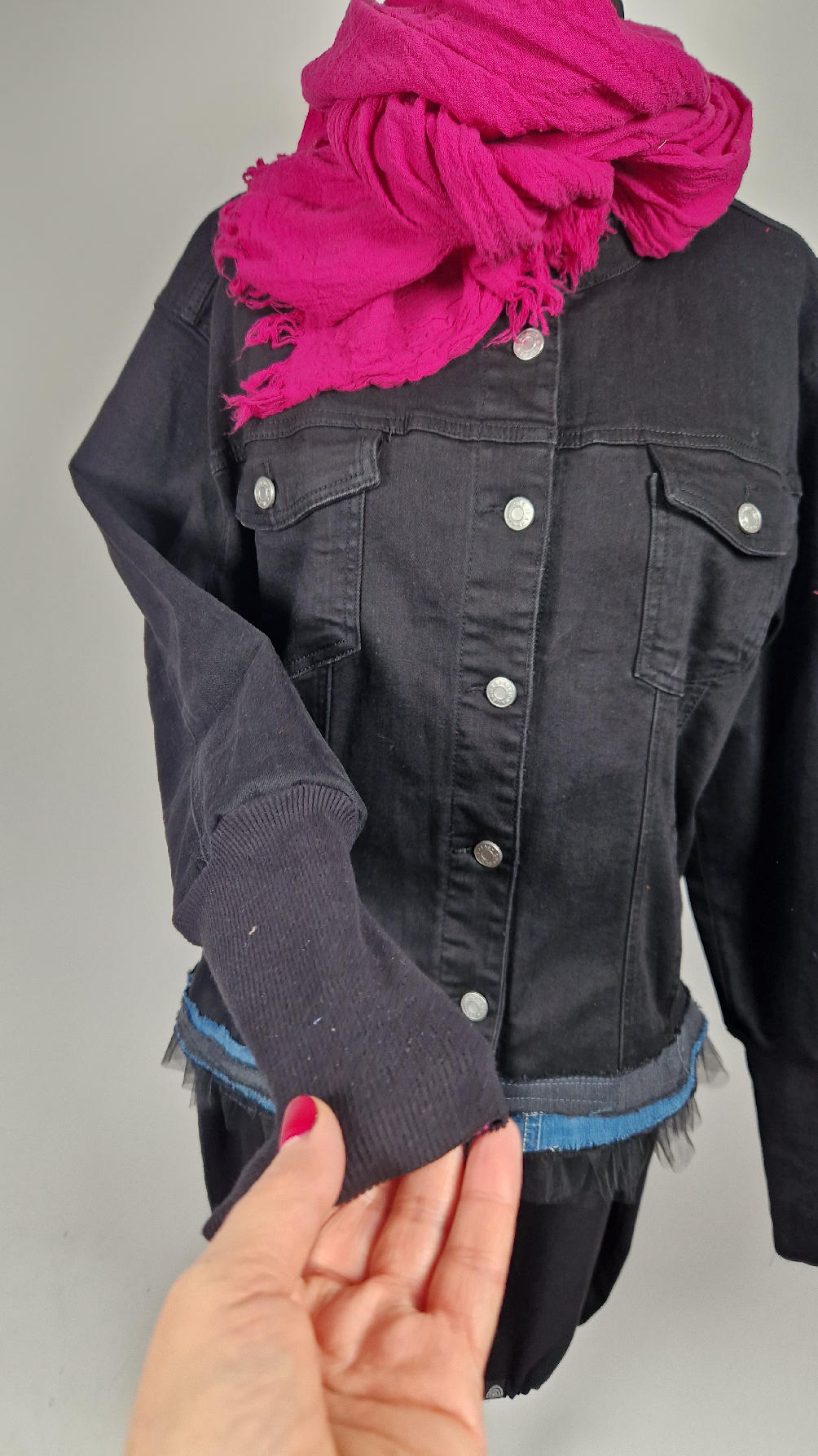 Katana z megaelastycznego,  miękkiego, czarnego jeansu, którego główną dekoracją jest mój autorski, unikatowy i niepowtarzalny kolaż tkanin na plecach, z  portretem Fridy, z kwiatami, z do tego falbanki, jeans na dole…Katana  ma długie, czarne  mankiety,  żeby było miękko i wygodnie i oczywiście oryginalnie…, które sprawią, że pokochasz swoją katankę od pierwszego spojrzenia