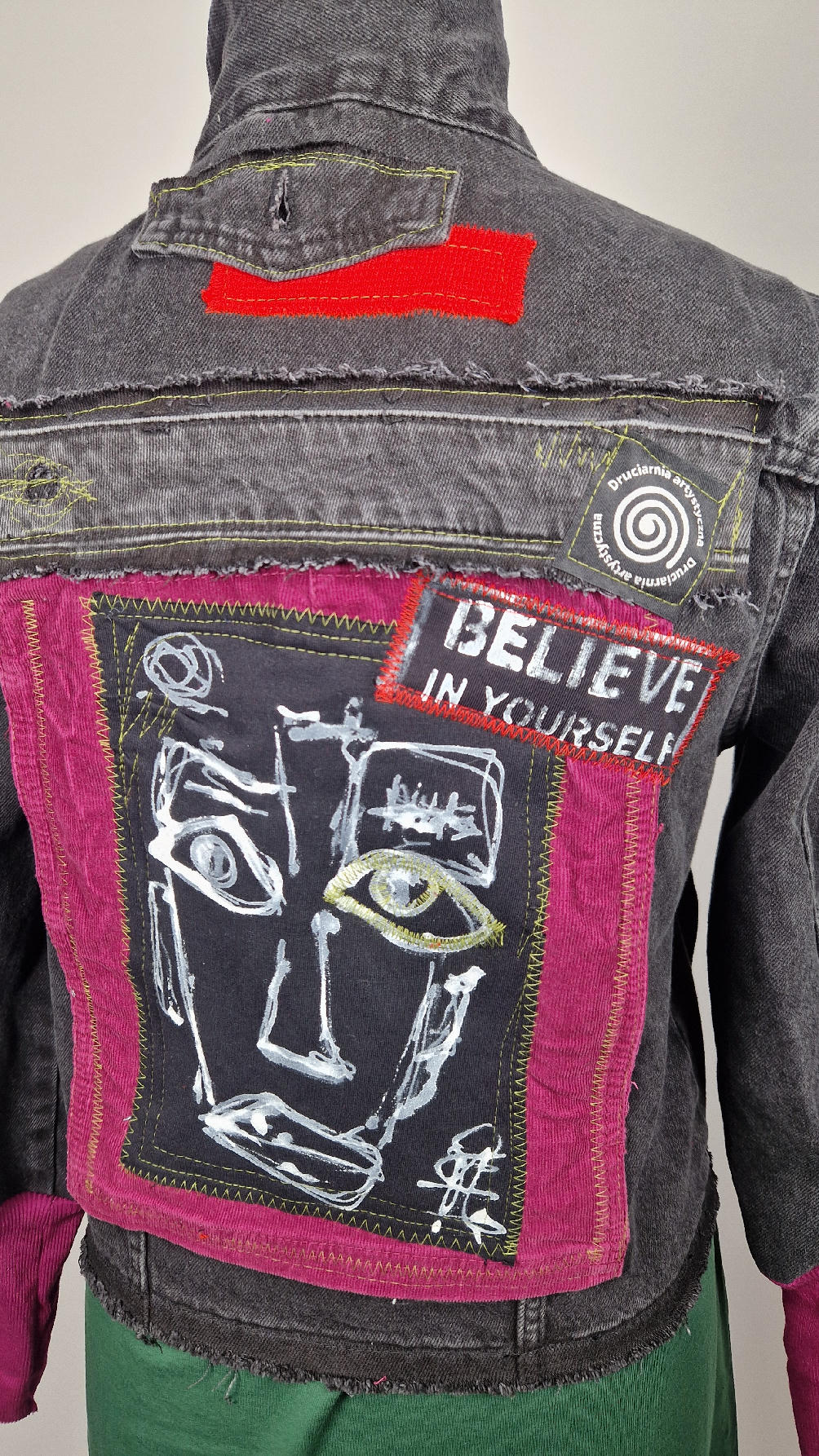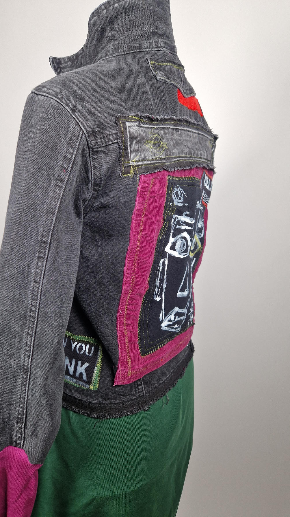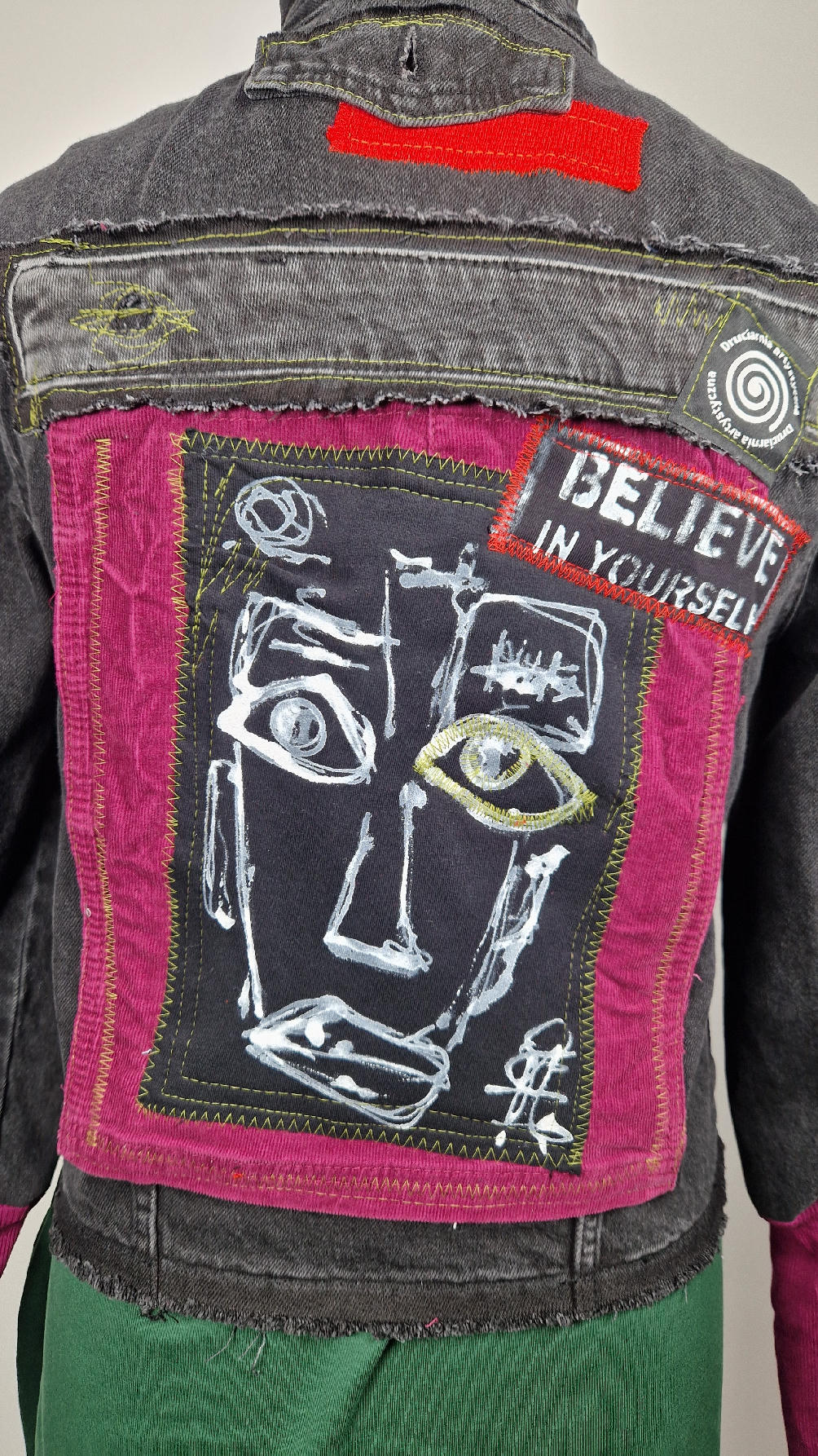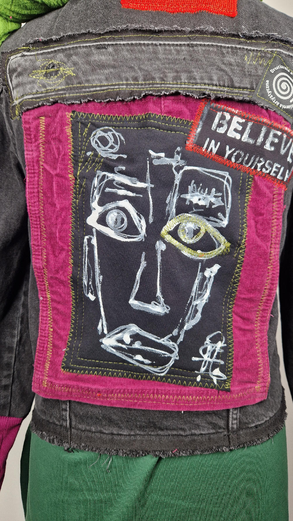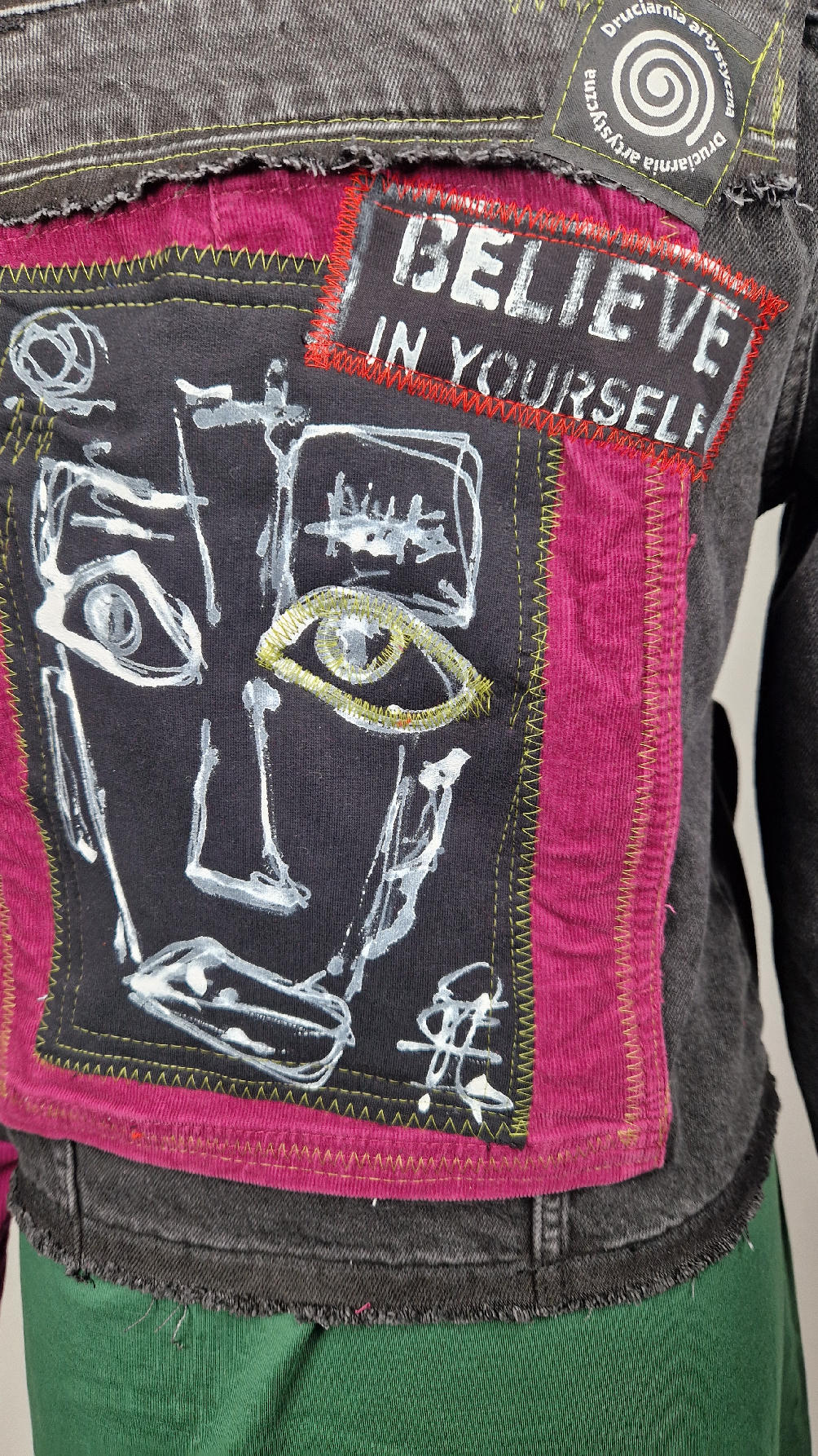 Czarna jeansowa katana, ze sztruksem na plecach, z napisami, z zielonymi przeszyciami, z fajowym portrecikiem Jean Lucka… na dole nie ma paska i nie ma falbanki- taka mniej słodka… rękawy wykończone są miękkimi ściągaczami , w identycznym kolorze jak sztruks na plecach. Fajnie mi wyszła.
