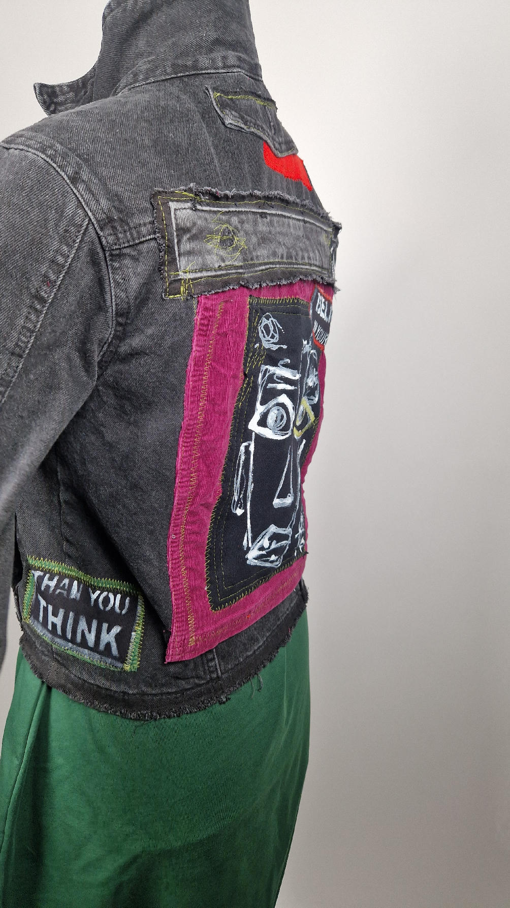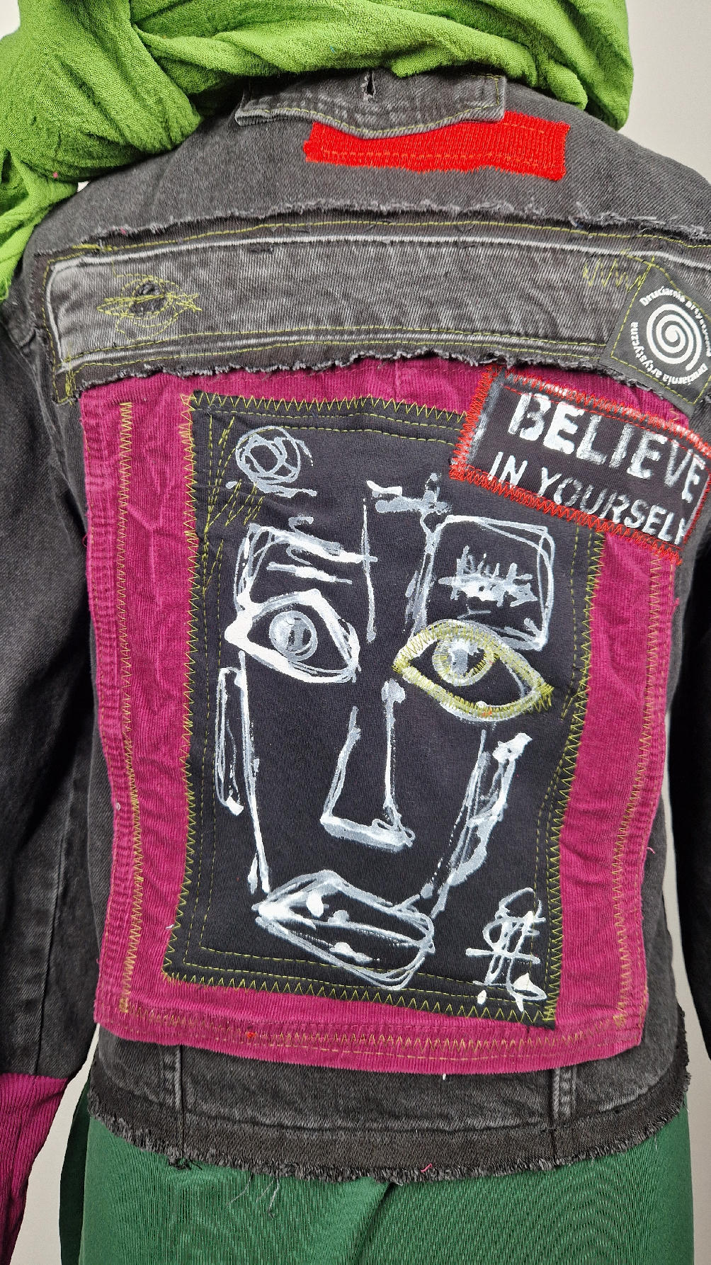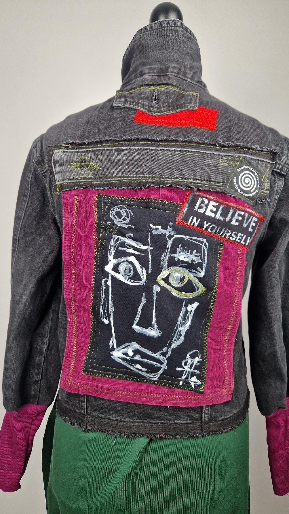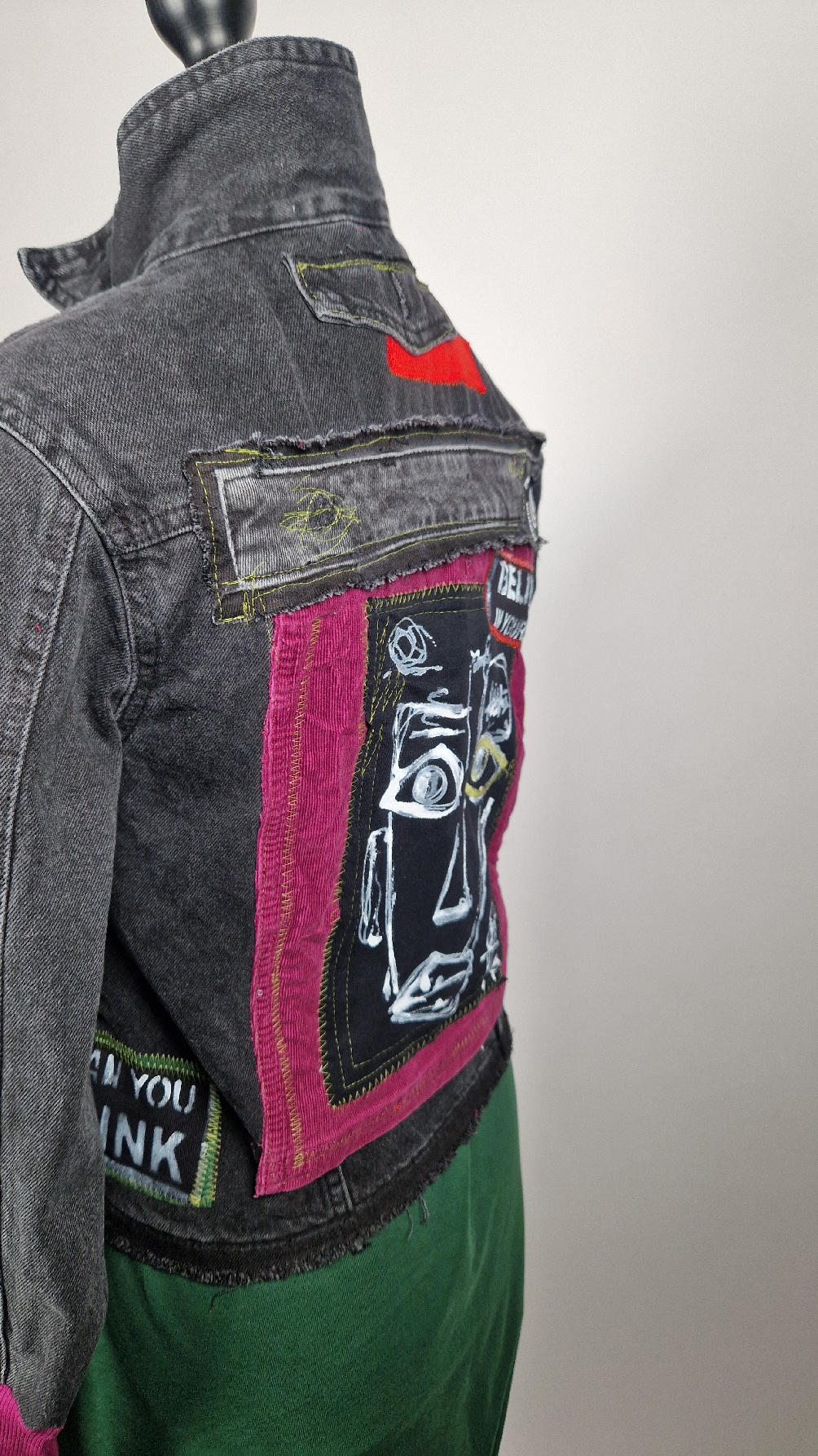 Czarna jeansowa katana, ze sztruksem na plecach, z napisami, z zielonymi przeszyciami, z fajowym portrecikiem Jean Lucka… na dole nie ma paska i nie ma falbanki- taka mniej słodka… rękawy wykończone są miękkimi ściągaczami , w identycznym kolorze jak sztruks na plecach. Fajnie mi wyszła.