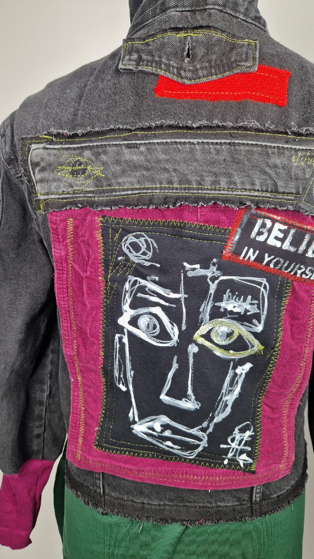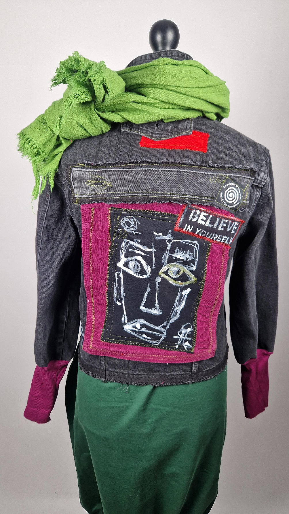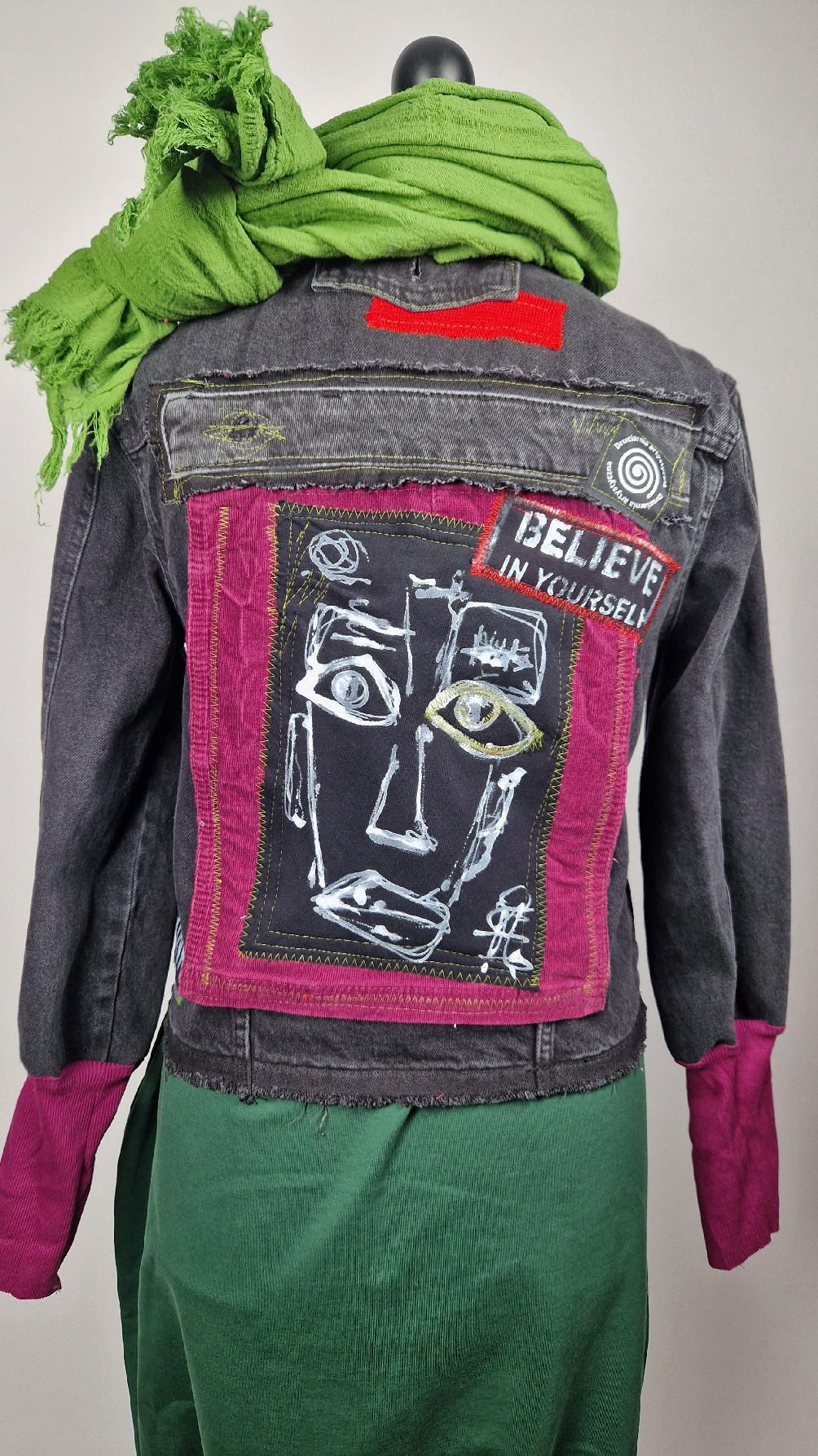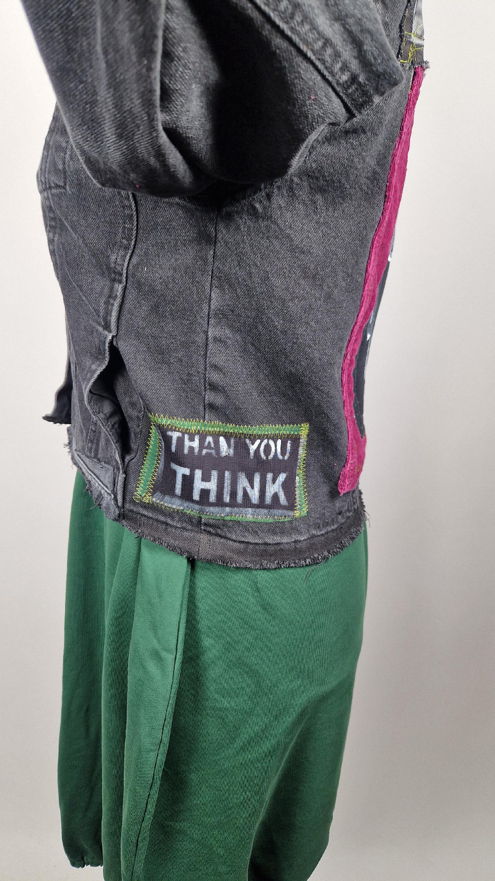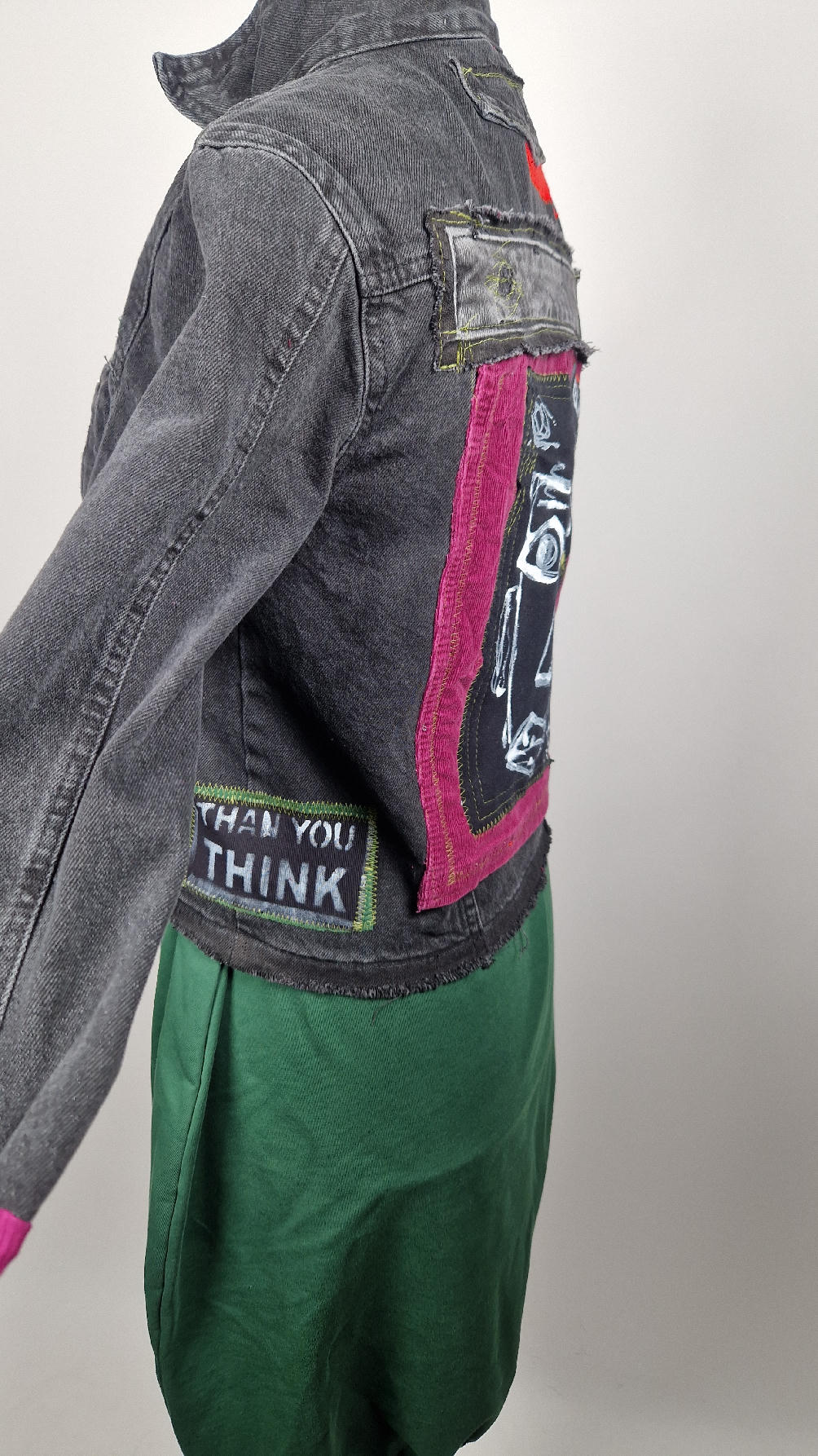 Czarna jeansowa katana, ze sztruksem na plecach, z napisami, z zielonymi przeszyciami, z fajowym portrecikiem Jean Lucka… na dole nie ma paska i nie ma falbanki- taka mniej słodka… rękawy wykończone są miękkimi ściągaczami , w identycznym kolorze jak sztruks na plecach. Fajnie mi wyszła.
