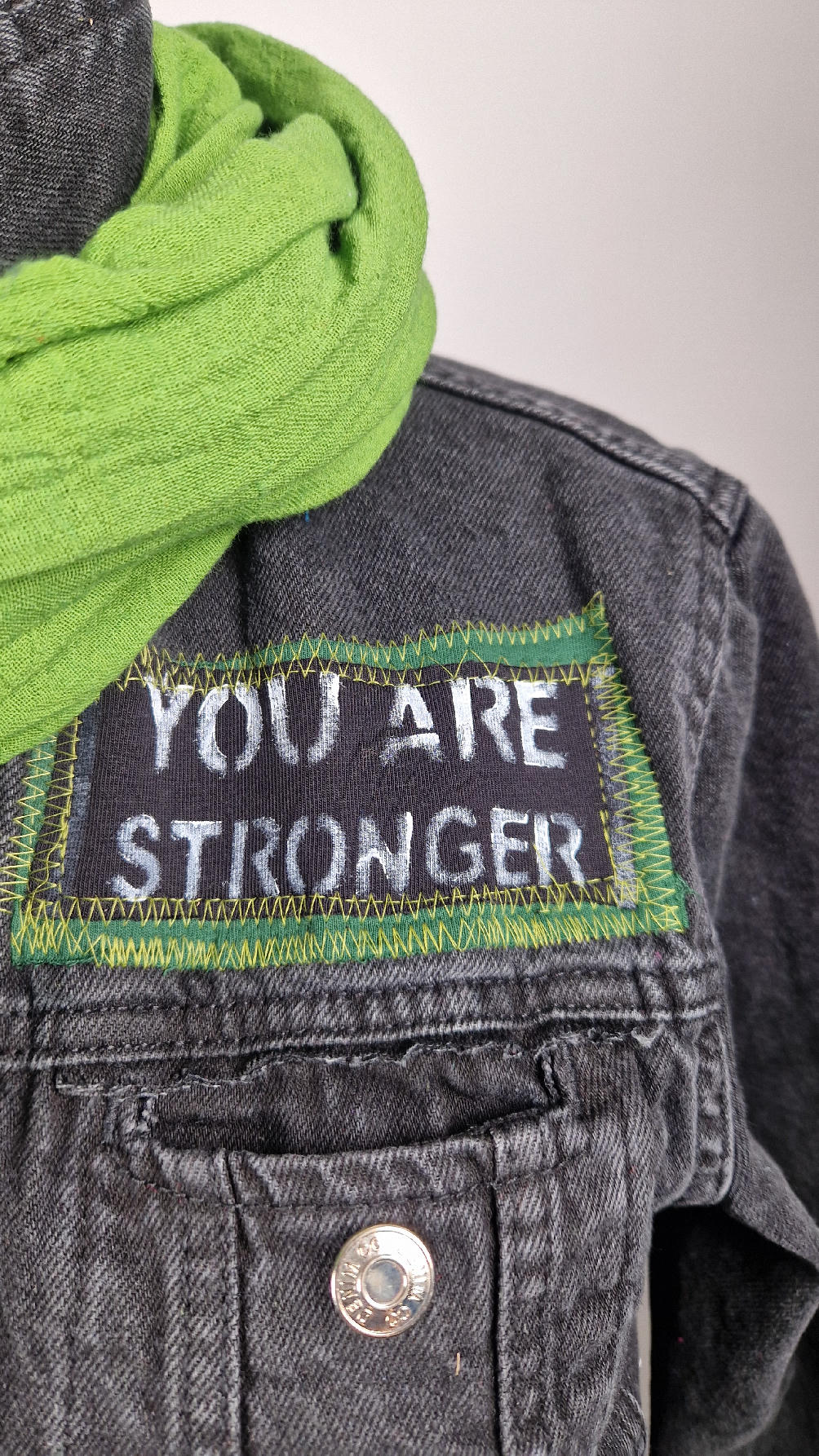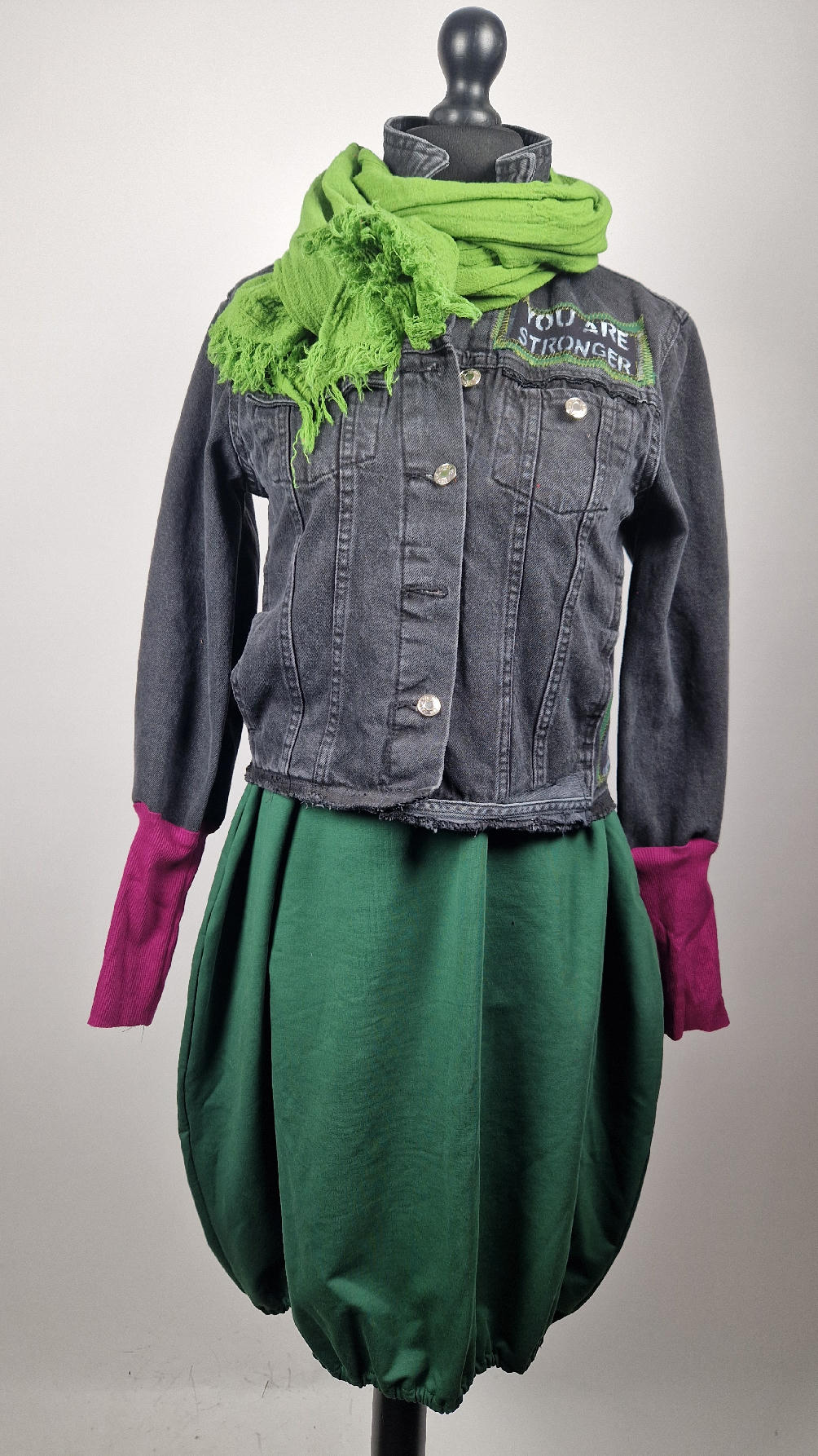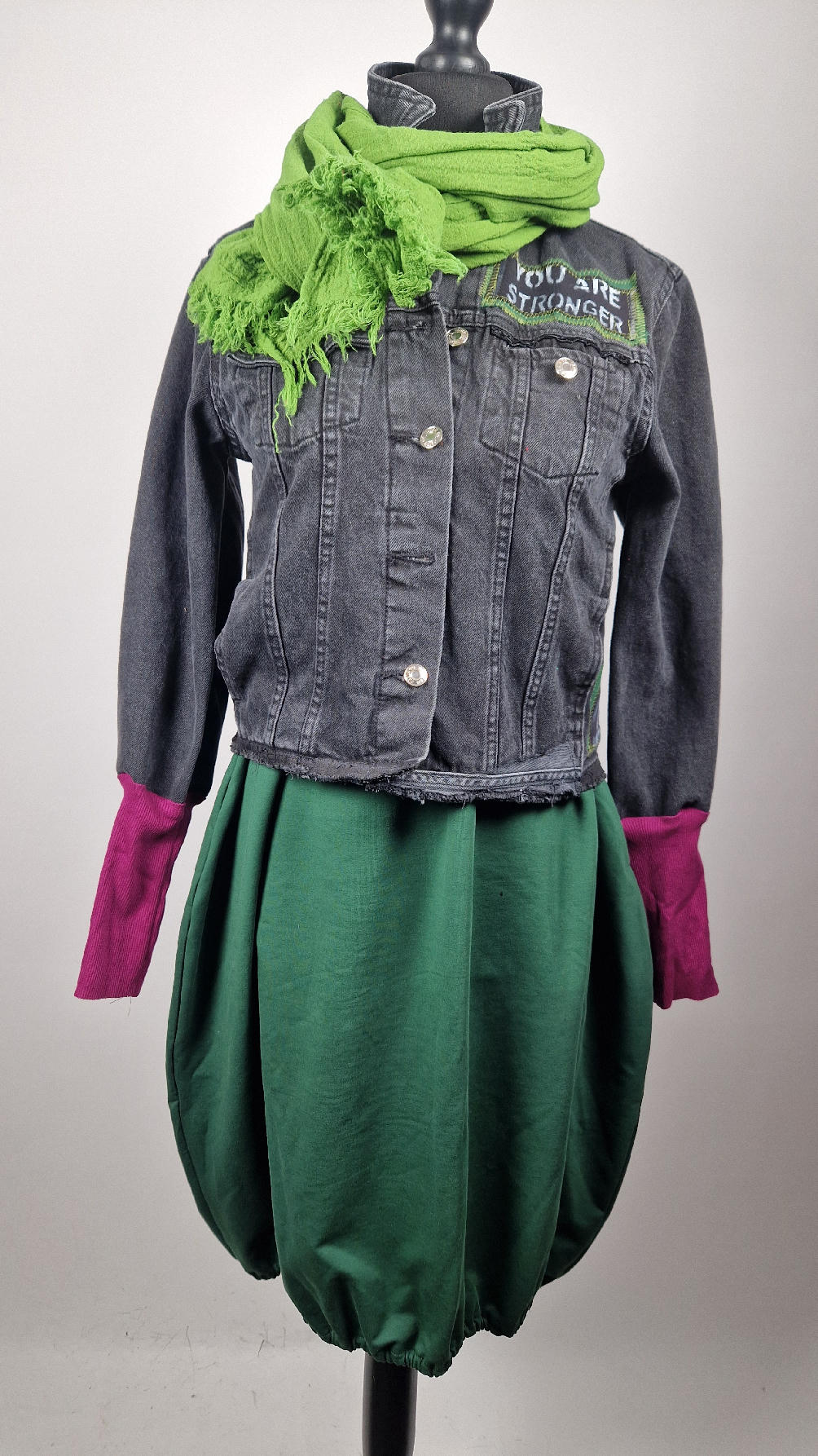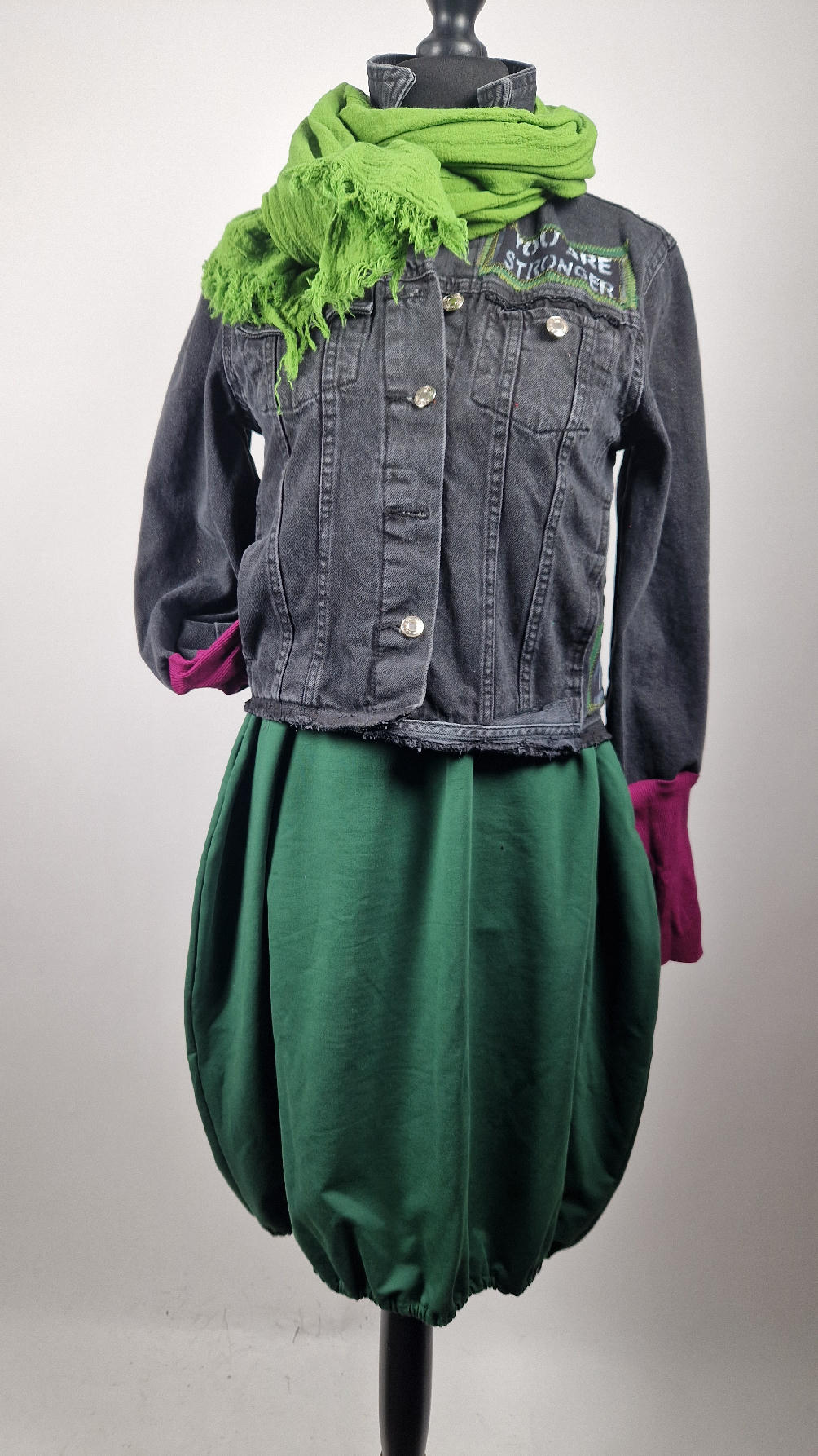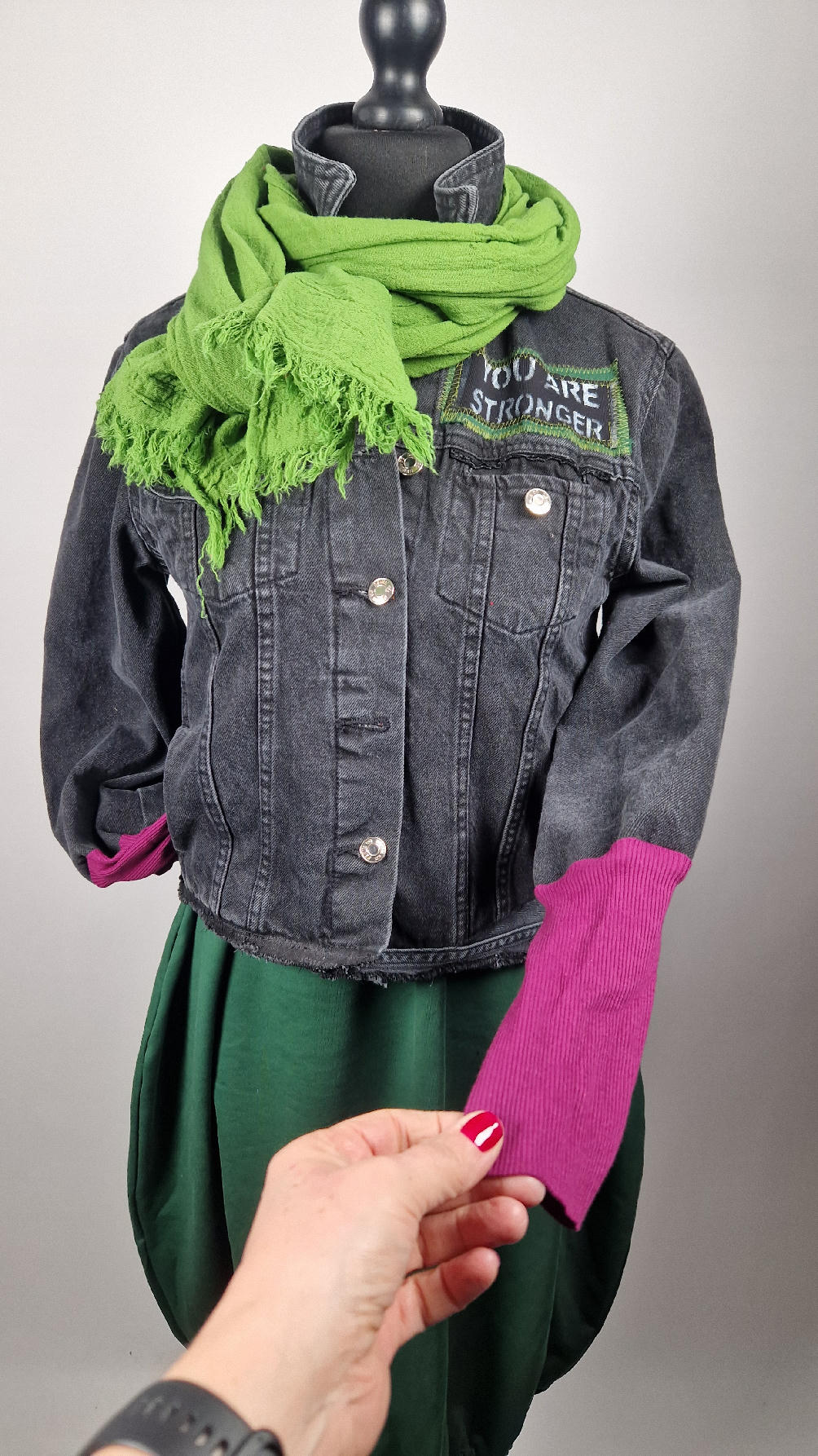 Czarna jeansowa katana, ze sztruksem na plecach, z napisami, z zielonymi przeszyciami, z fajowym portrecikiem Jean Lucka… na dole nie ma paska i nie ma falbanki- taka mniej słodka… rękawy wykończone są miękkimi ściągaczami , w identycznym kolorze jak sztruks na plecach. Fajnie mi wyszła.