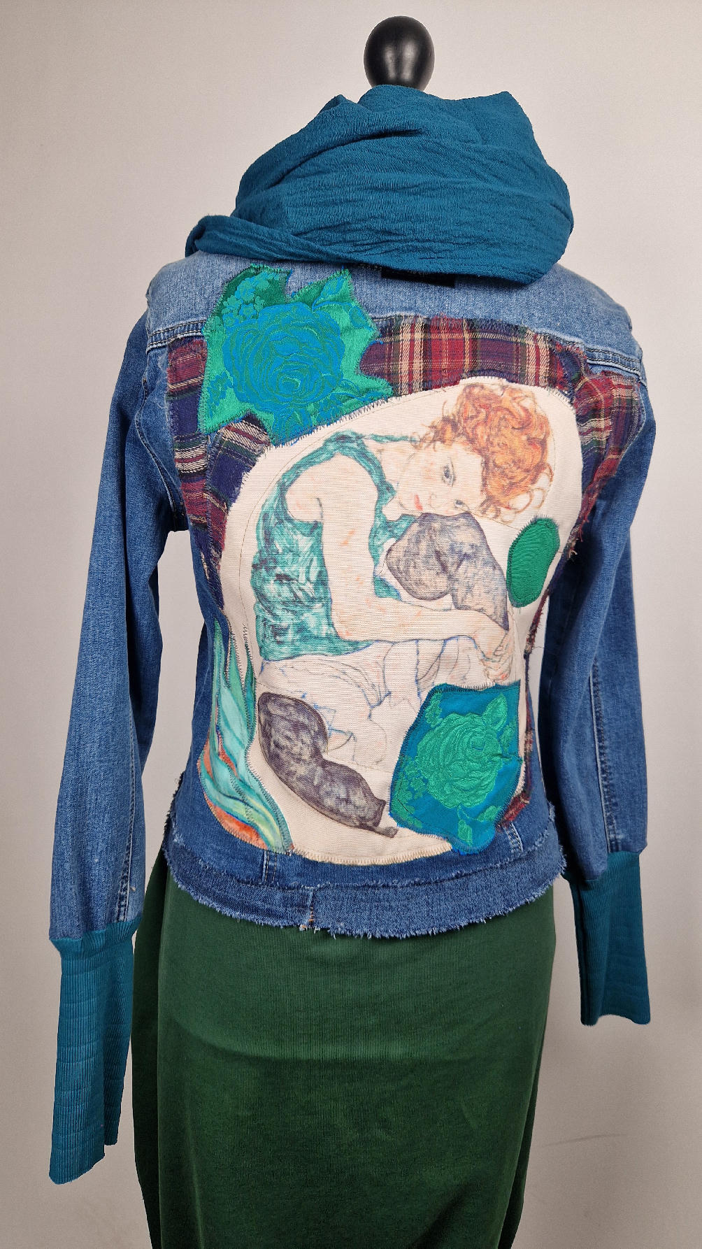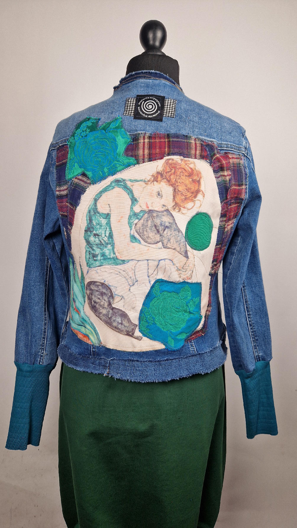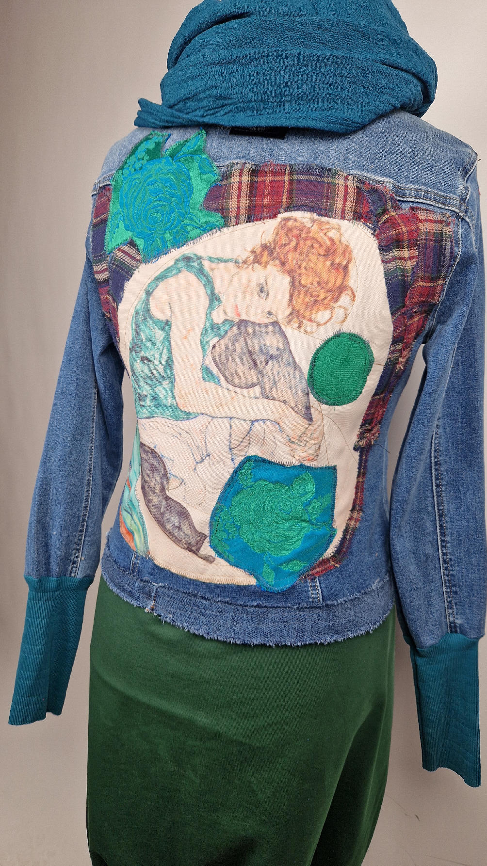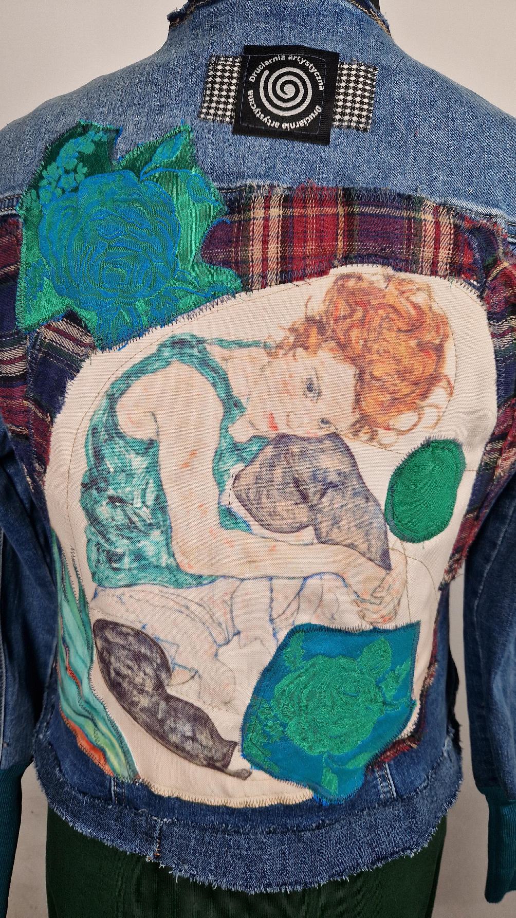 Katana z elastycznego, niebieskiego jeansu, którego główną dekoracją jest aplikacja z piękna rudą Schilego , który jest chyba moim ulubionym obrazem, a kocham Schilego… do tego szmaragdowe kwiaty z jedwabiu, z kontrastową, śliczną kratką i kawałkiem Irysów. Van Gogha…, a tak mi tu pasowały:)… Katana jest pozbawiona paska na dole, za to ma fajową ,jeansową falbankę, ma długie, miękkie turkusowe mankiety, żeby było miękko i wygodnie i oczywiście oryginalnie…