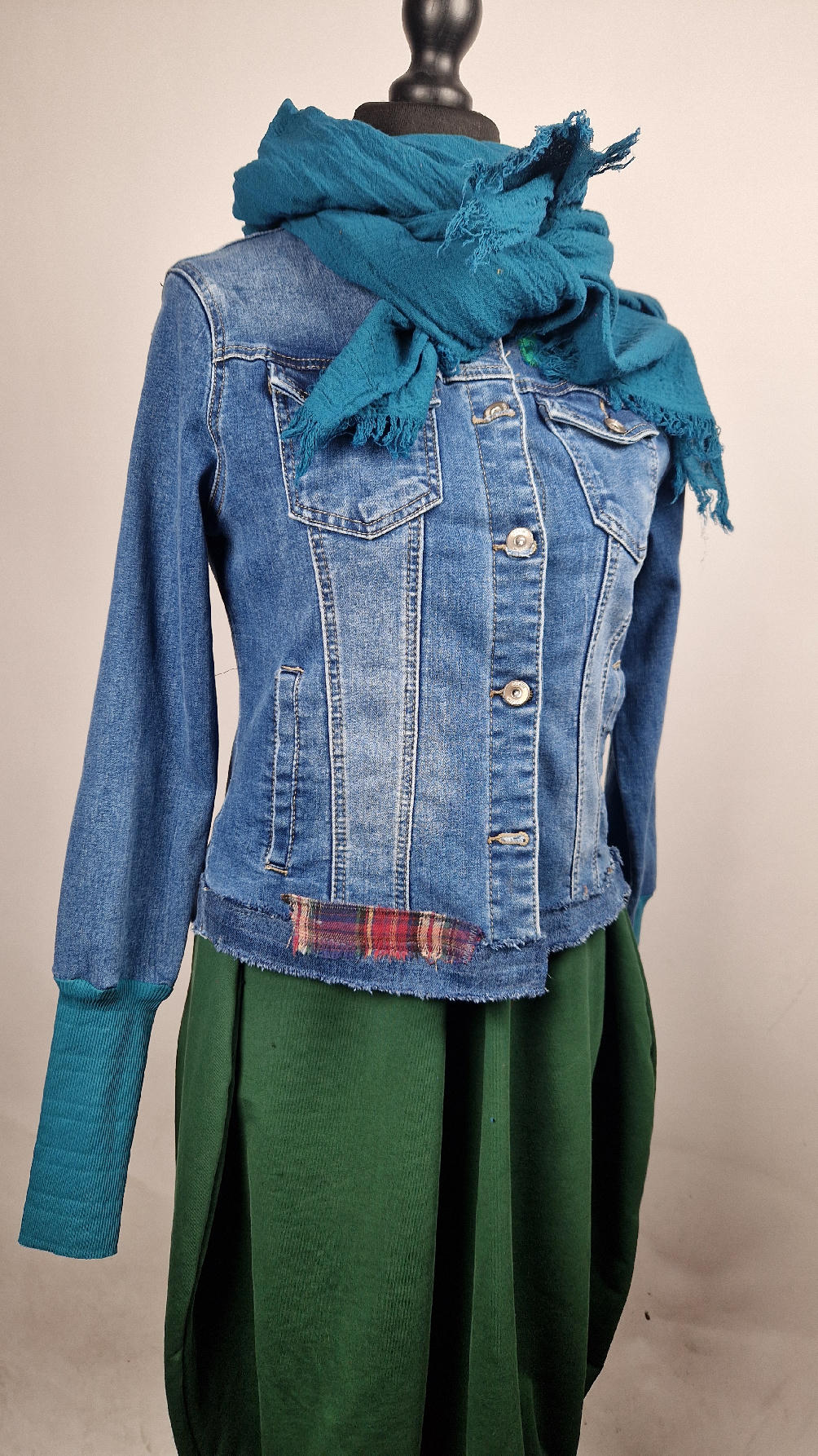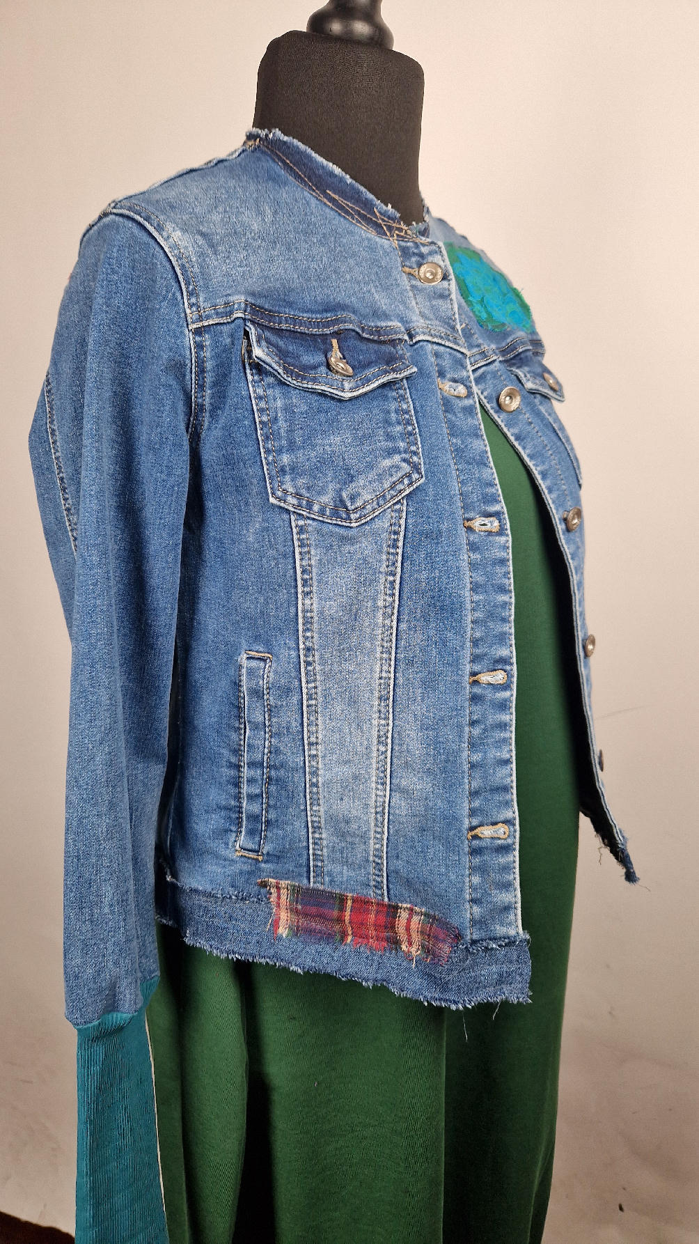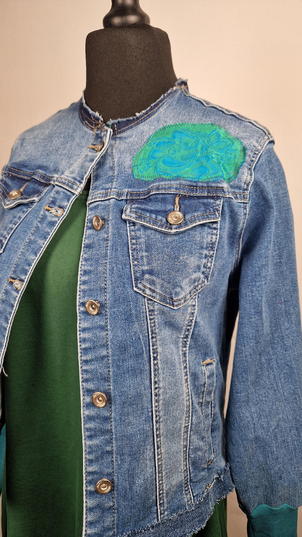 Katana z elastycznego, niebieskiego jeansu, którego główną dekoracją jest aplikacja z piękna rudą Schilego , który jest chyba moim ulubionym obrazem, a kocham Schilego… do tego szmaragdowe kwiaty z jedwabiu, z kontrastową, śliczną kratką i kawałkiem Irysów. Van Gogha…, a tak mi tu pasowały:)… Katana jest pozbawiona paska na dole, za to ma fajową ,jeansową falbankę, ma długie, miękkie turkusowe mankiety, żeby było miękko i wygodnie i oczywiście oryginalnie…
