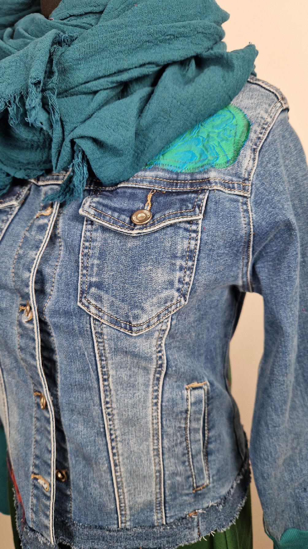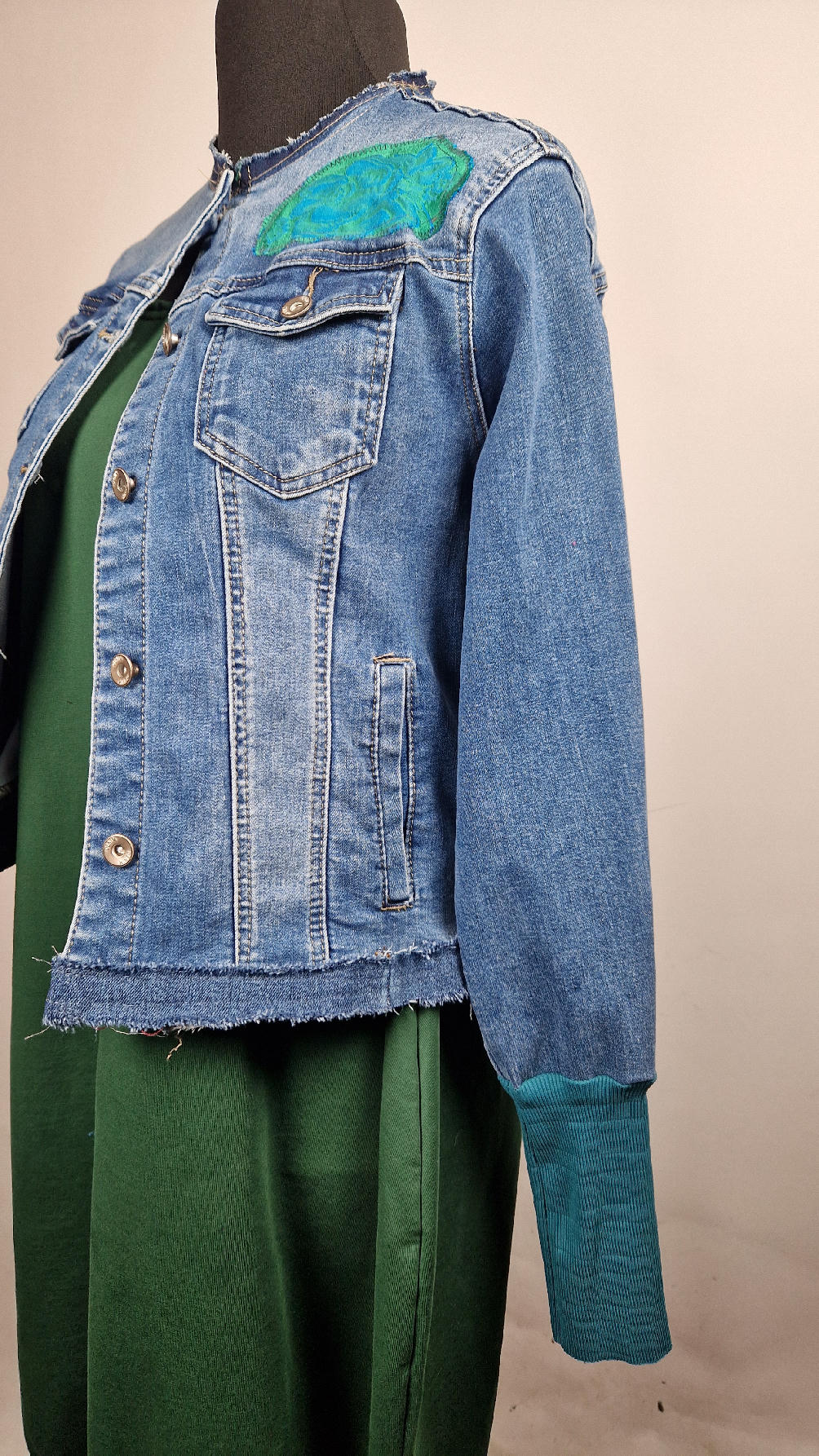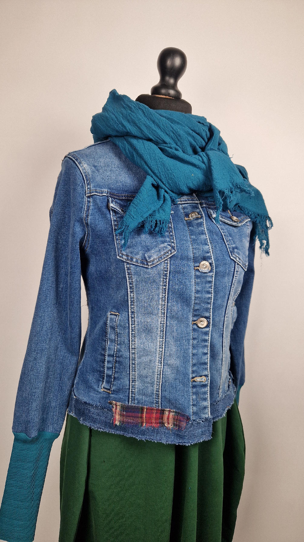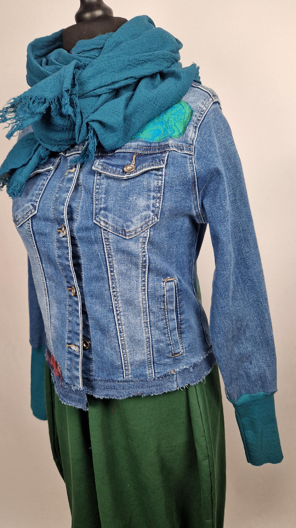 Katana z elastycznego, niebieskiego jeansu, którego główną dekoracją jest aplikacja z piękna rudą Schilego , który jest chyba moim ulubionym obrazem, a kocham Schilego… do tego szmaragdowe kwiaty z jedwabiu, z kontrastową, śliczną kratką i kawałkiem Irysów. Van Gogha…, a tak mi tu pasowały:)… Katana jest pozbawiona paska na dole, za to ma fajową ,jeansową falbankę, ma długie, miękkie turkusowe mankiety, żeby było miękko i wygodnie i oczywiście oryginalnie…