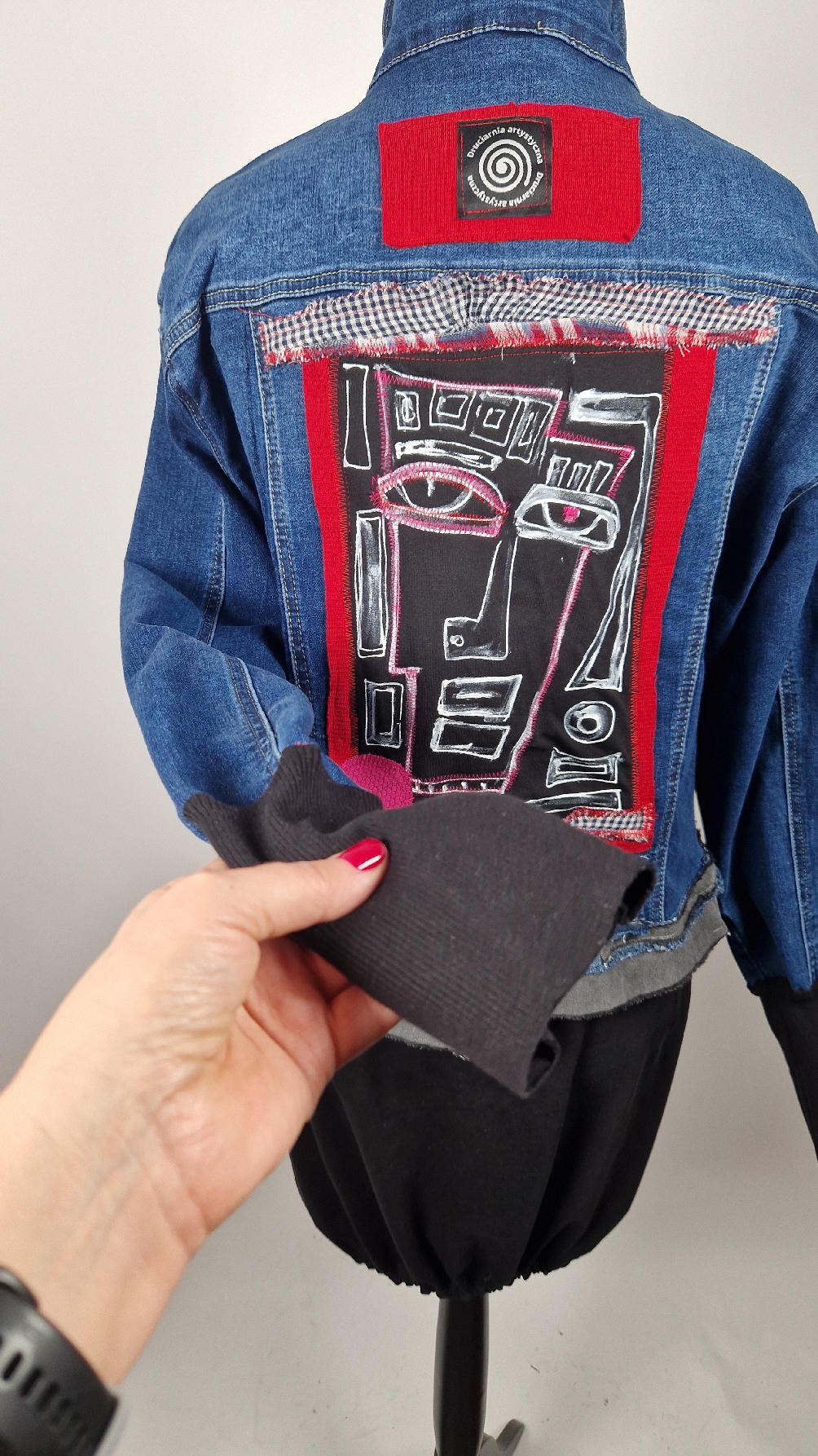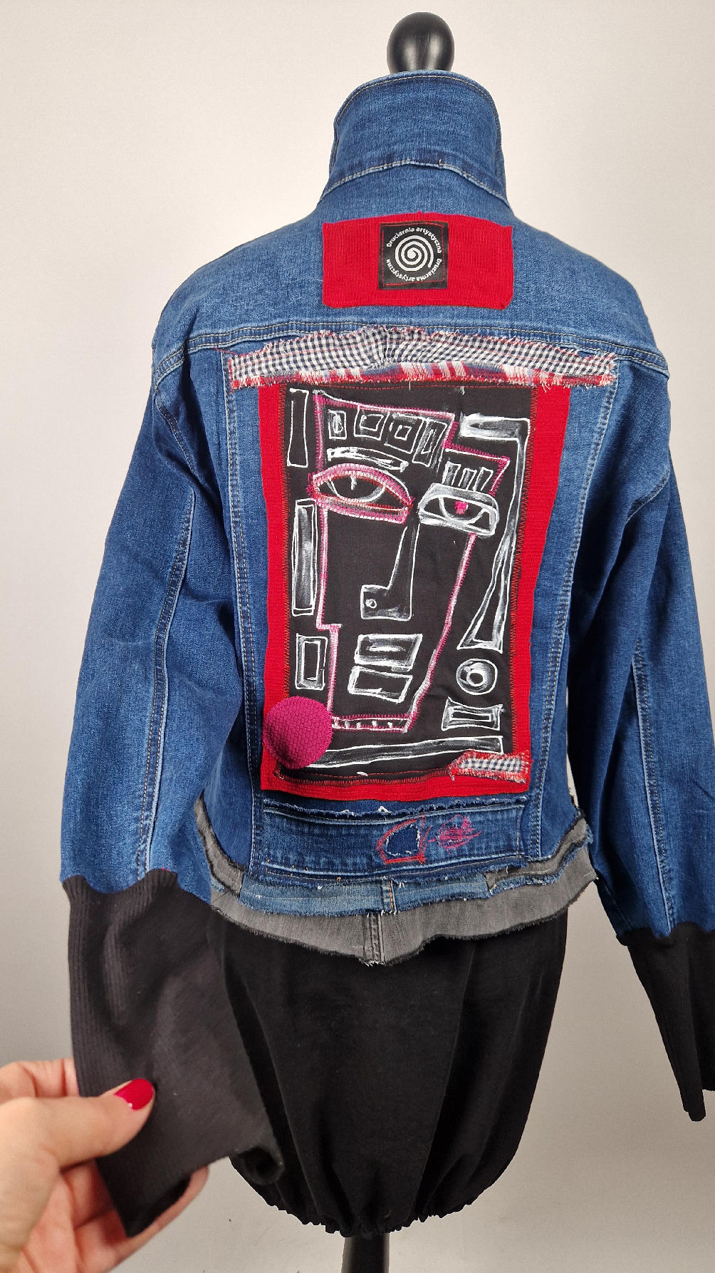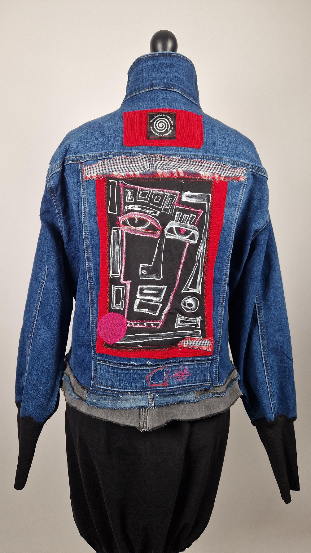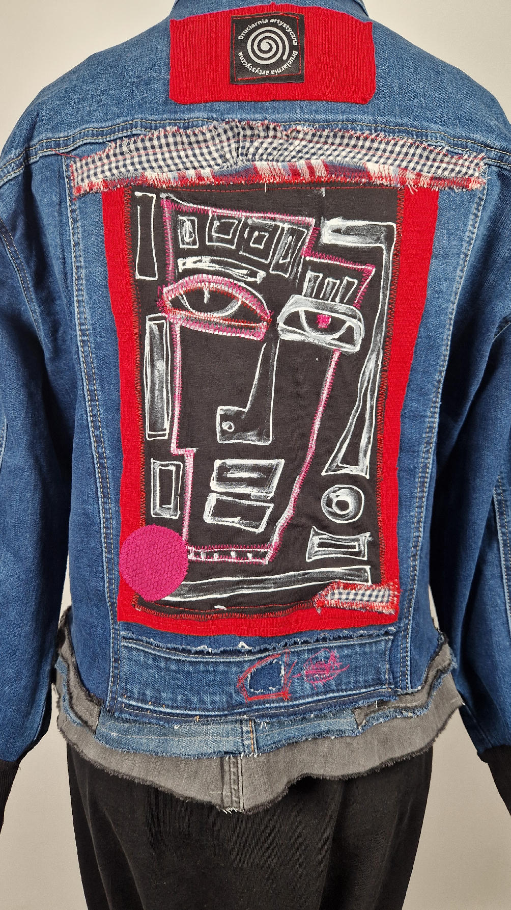 Katana z megaelastycznego,  miękkiego, niebieskiego jeansu, którego główną dekoracją jest mój autorski, unikatowy i niepowtarzalny kolaż tkanin na plecach, z namalowanym portrecikiem, z czerwonym wykończeniem- tak energetycznie…do tego falbanki, kratki, jeans na dole…Katana  ma długie, czarne mankiety,  żeby było miękko i wygodnie i oczywiście oryginalnie…, które sprawią, że pokochasz swoją katankę od pierwszego spojrzenia