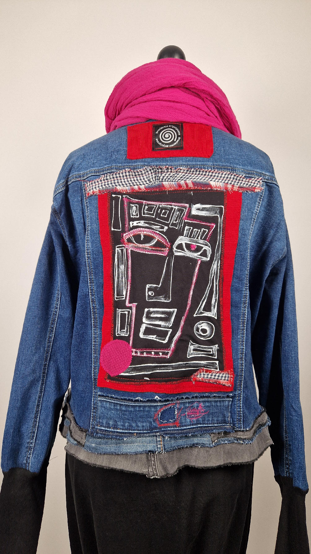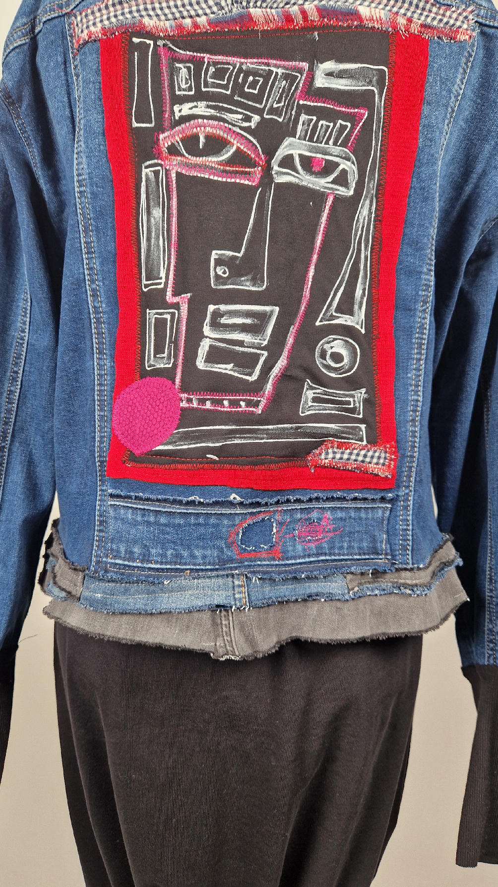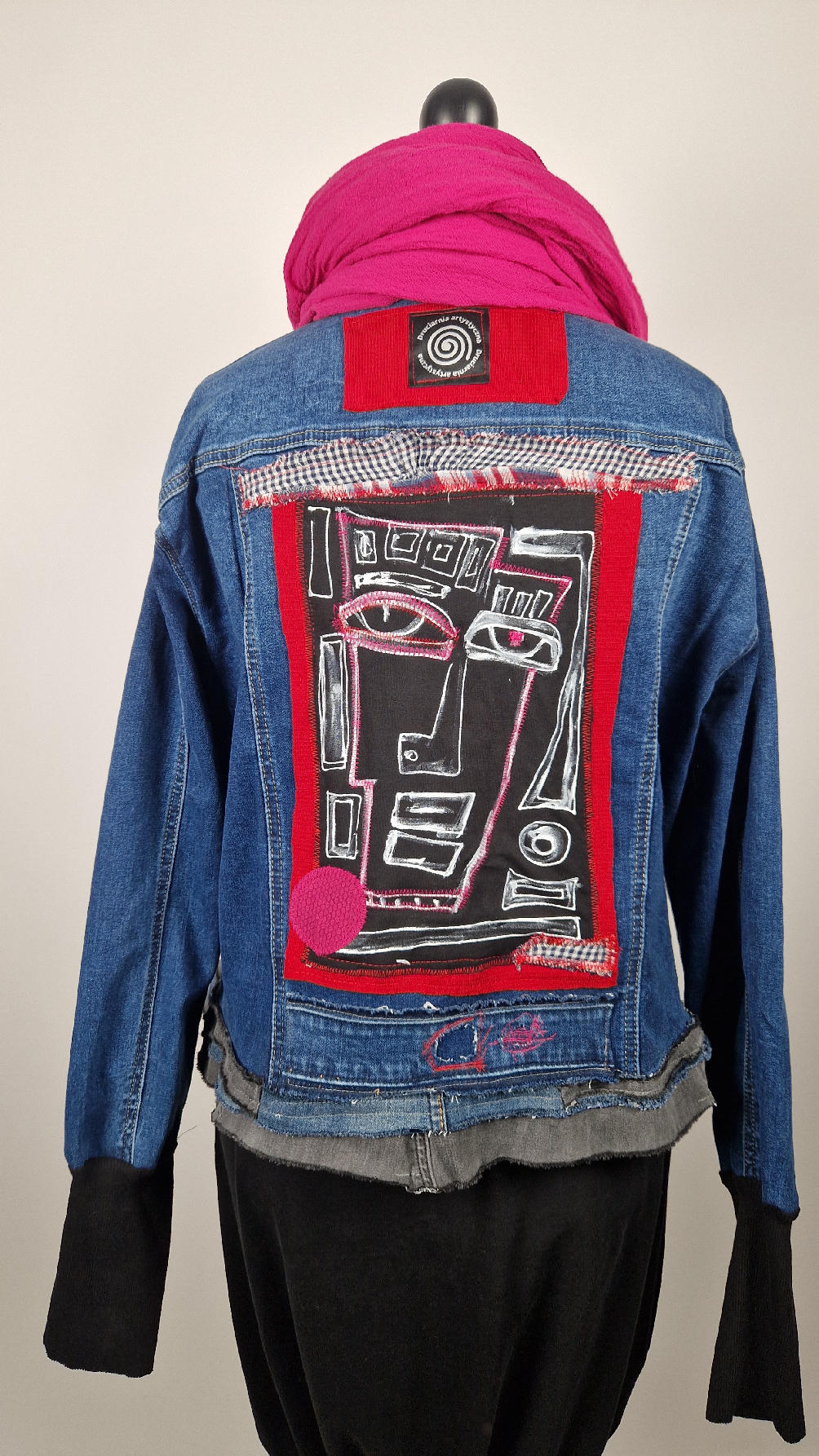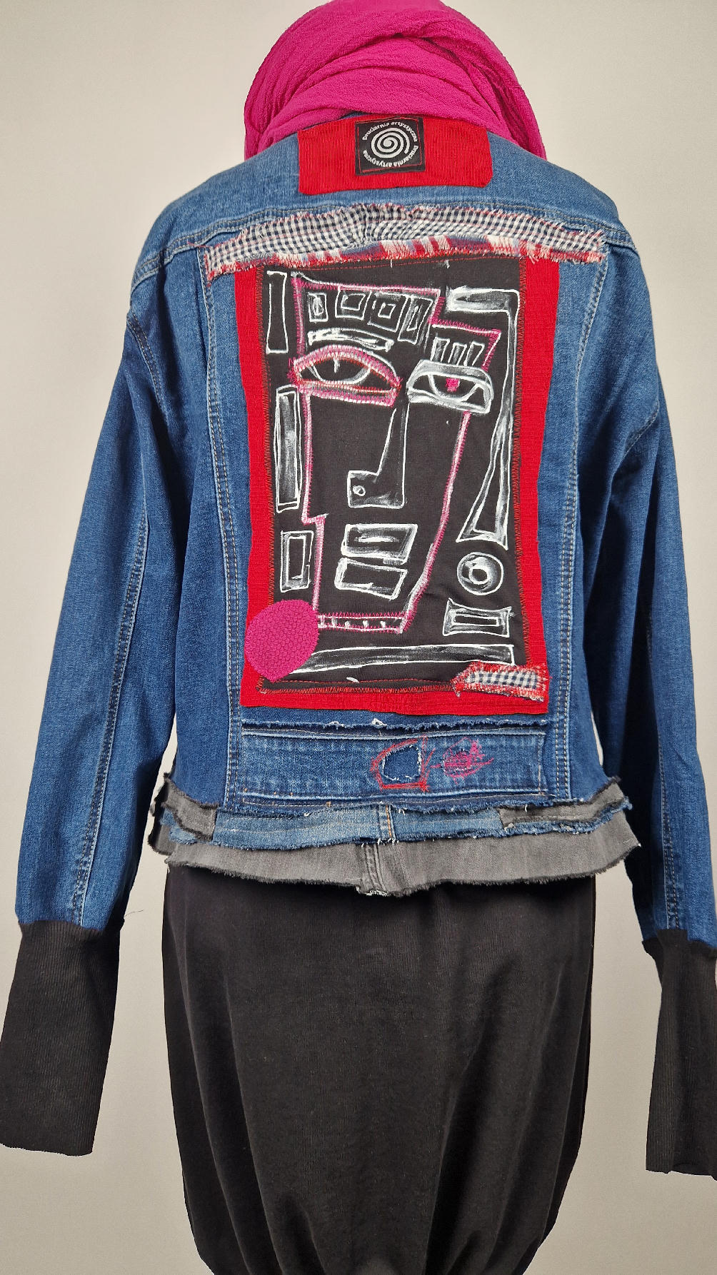 Katana z megaelastycznego,  miękkiego, niebieskiego jeansu, którego główną dekoracją jest mój autorski, unikatowy i niepowtarzalny kolaż tkanin na plecach, z namalowanym portrecikiem, z czerwonym wykończeniem- tak energetycznie…do tego falbanki, kratki, jeans na dole…Katana  ma długie, czarne mankiety,  żeby było miękko i wygodnie i oczywiście oryginalnie…, które sprawią, że pokochasz swoją katankę od pierwszego spojrzenia