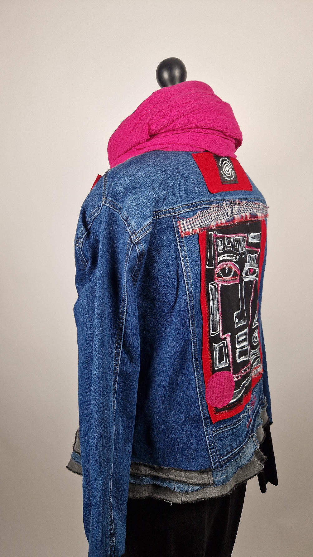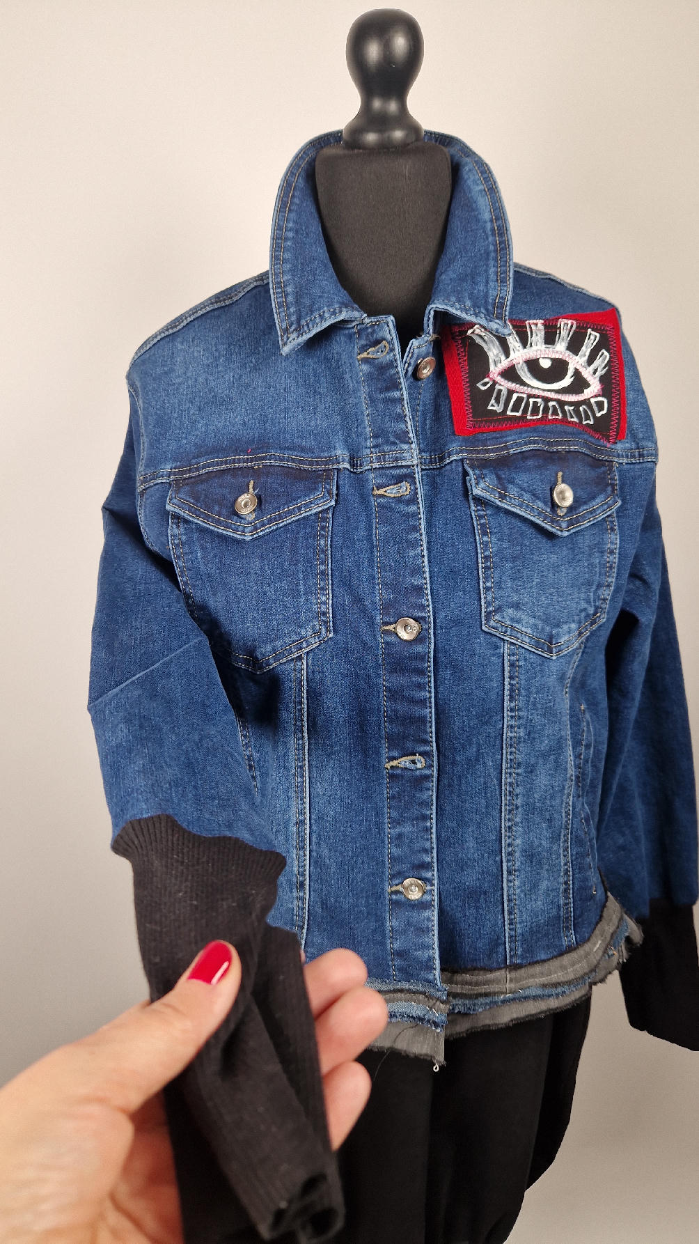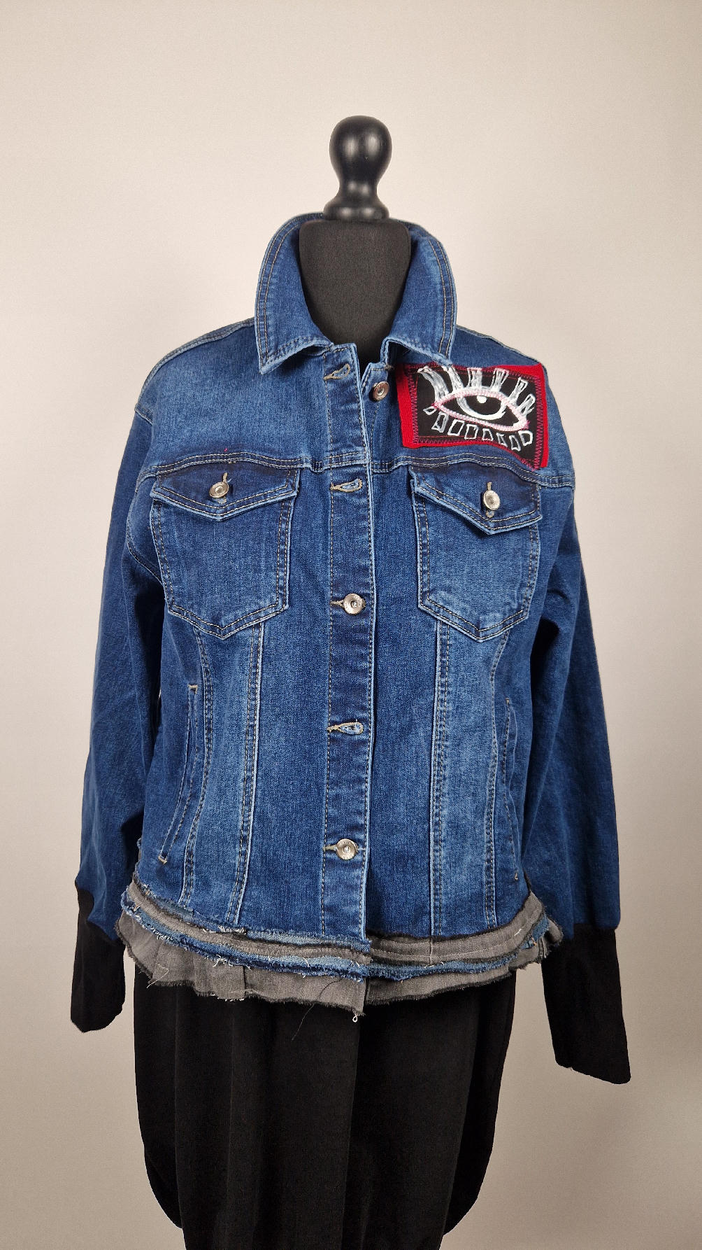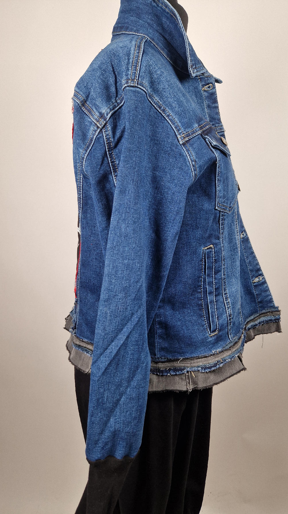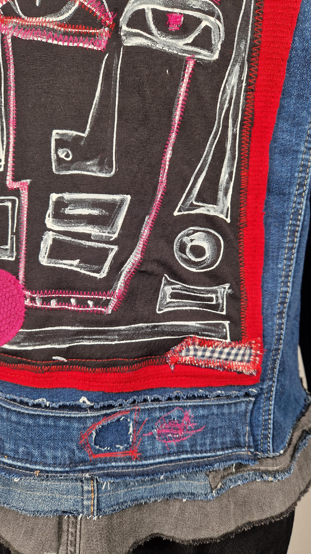 Katana z megaelastycznego,  miękkiego, niebieskiego jeansu, którego główną dekoracją jest mój autorski, unikatowy i niepowtarzalny kolaż tkanin na plecach, z namalowanym portrecikiem, z czerwonym wykończeniem- tak energetycznie…do tego falbanki, kratki, jeans na dole…Katana  ma długie, czarne mankiety,  żeby było miękko i wygodnie i oczywiście oryginalnie…, które sprawią, że pokochasz swoją katankę od pierwszego spojrzenia